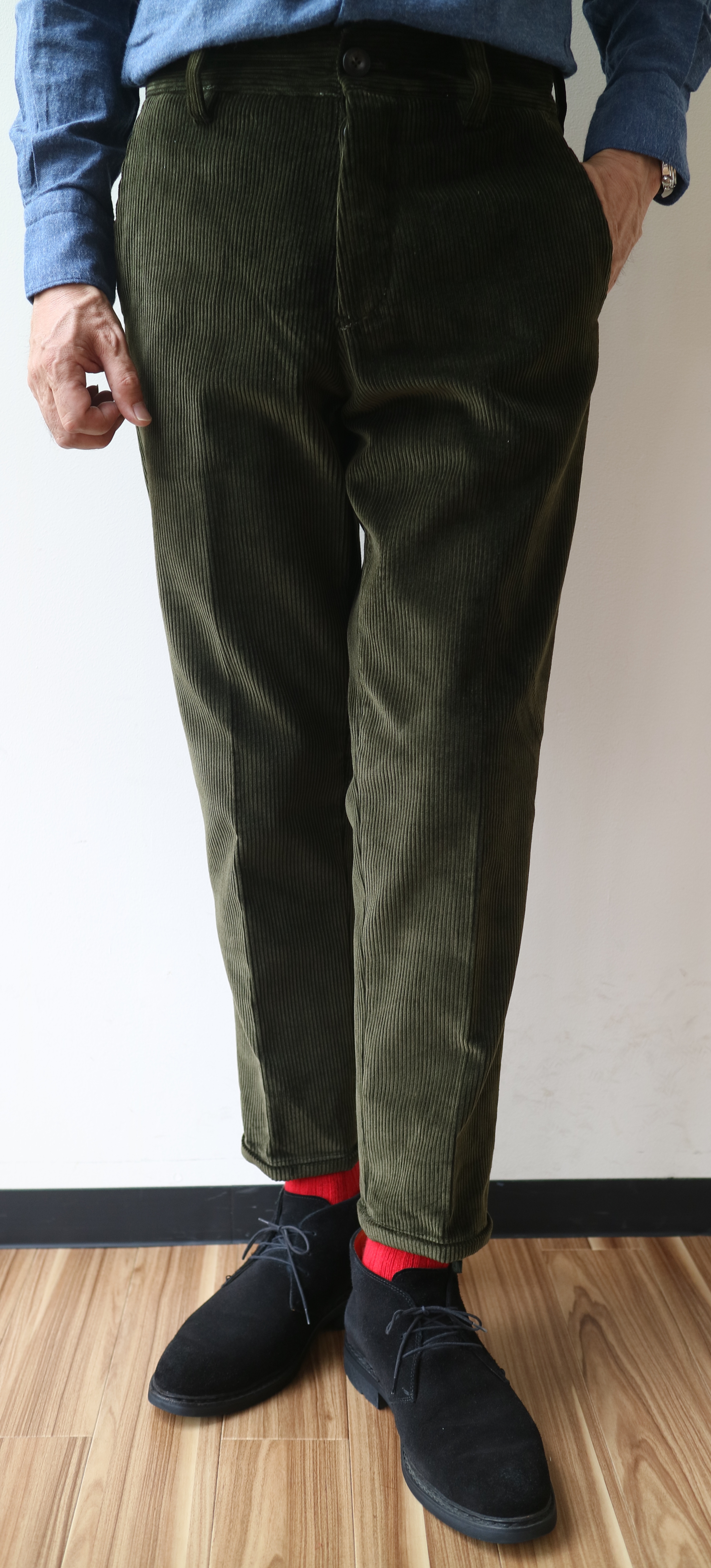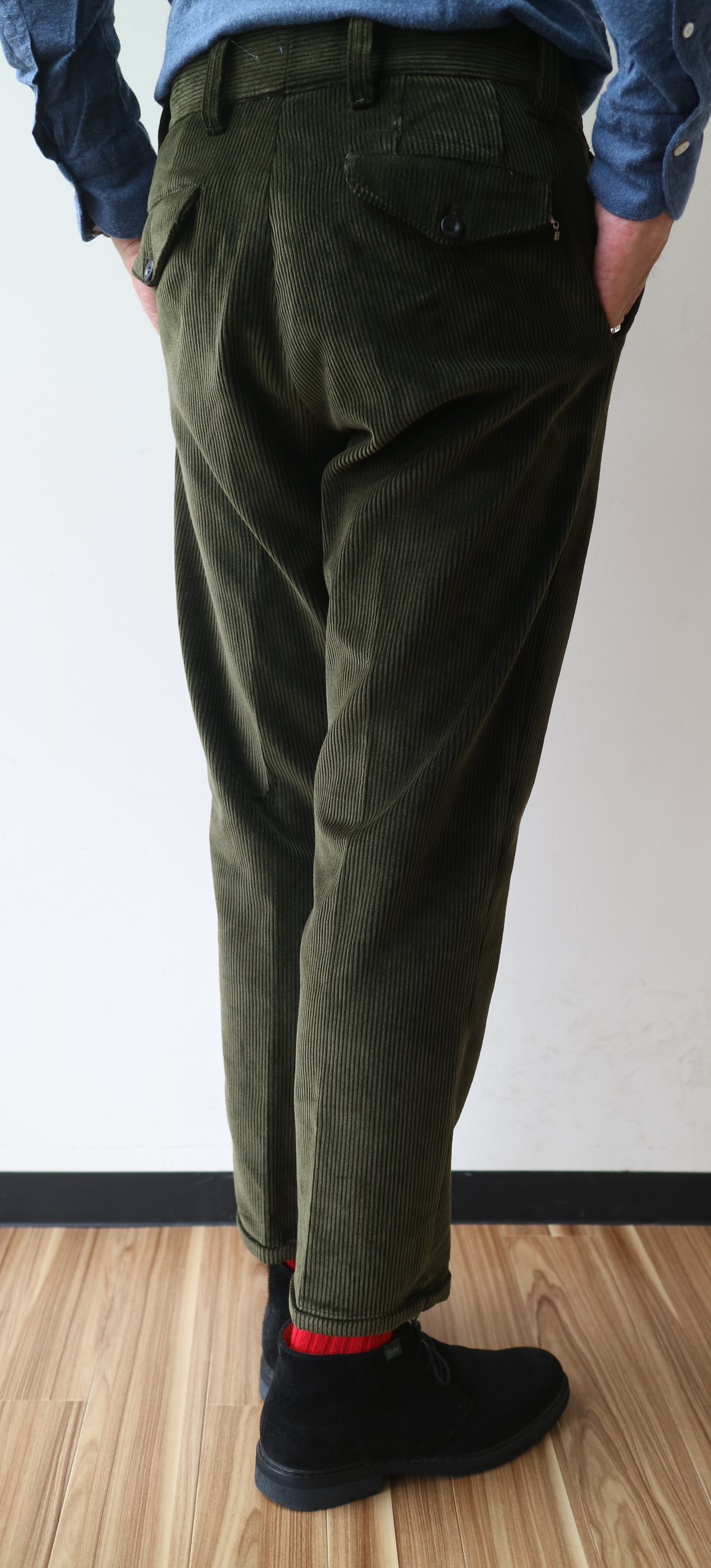このフォルムなら、絶対に、このダークオリーブに太畝のコーデュロイです!! と断定してしまってよいほど、全てがマッチングしているパンツです。太いのは畝だけではありません。ベルトループにポケットのフラップまでが大きめに作られており、全体のバランスを更によくしているのです。さすがなのは、この秋冬よりディレクターに就任したドメニコ・ジャンフラーテ氏。かなりの洒落者だけに細部だけではなく、洋服に必要なのは"バランス"ということを熟知されてます。