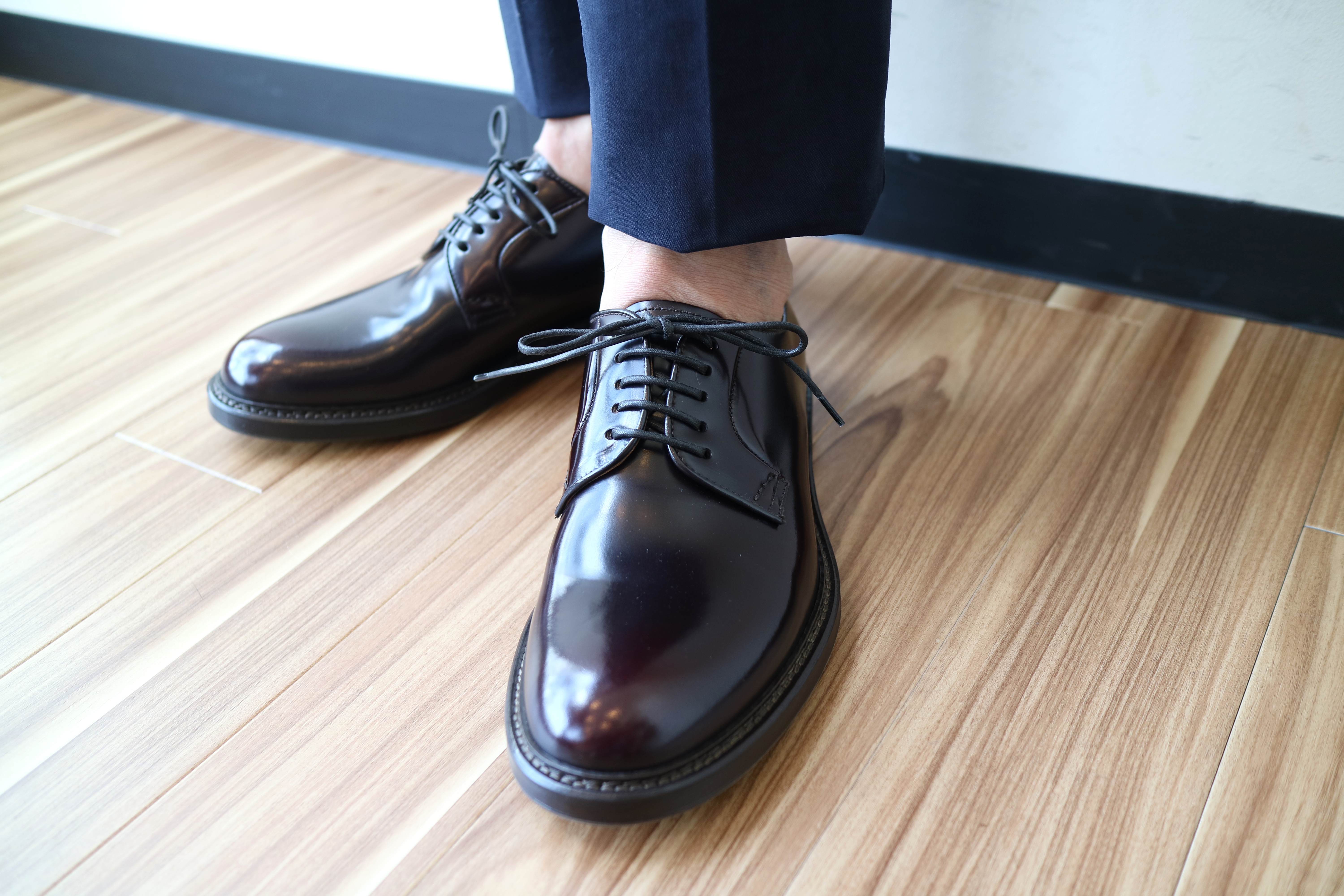 ビジネスユースとして大活躍する他に、外羽根式のラフさから、カジュアルな装いにも最適なプレーントゥ。足の形を選ばない履きやすさも人気の理由でしょう。特にイタリア人がジーンズにジャケットを羽織っている場合の足元を見ると、非常に多いのが、茶系のプレーントゥ。ある方の言葉を借りれば、ニットタイ的な存在で、様々なシーンで使っていただける靴と言えます。