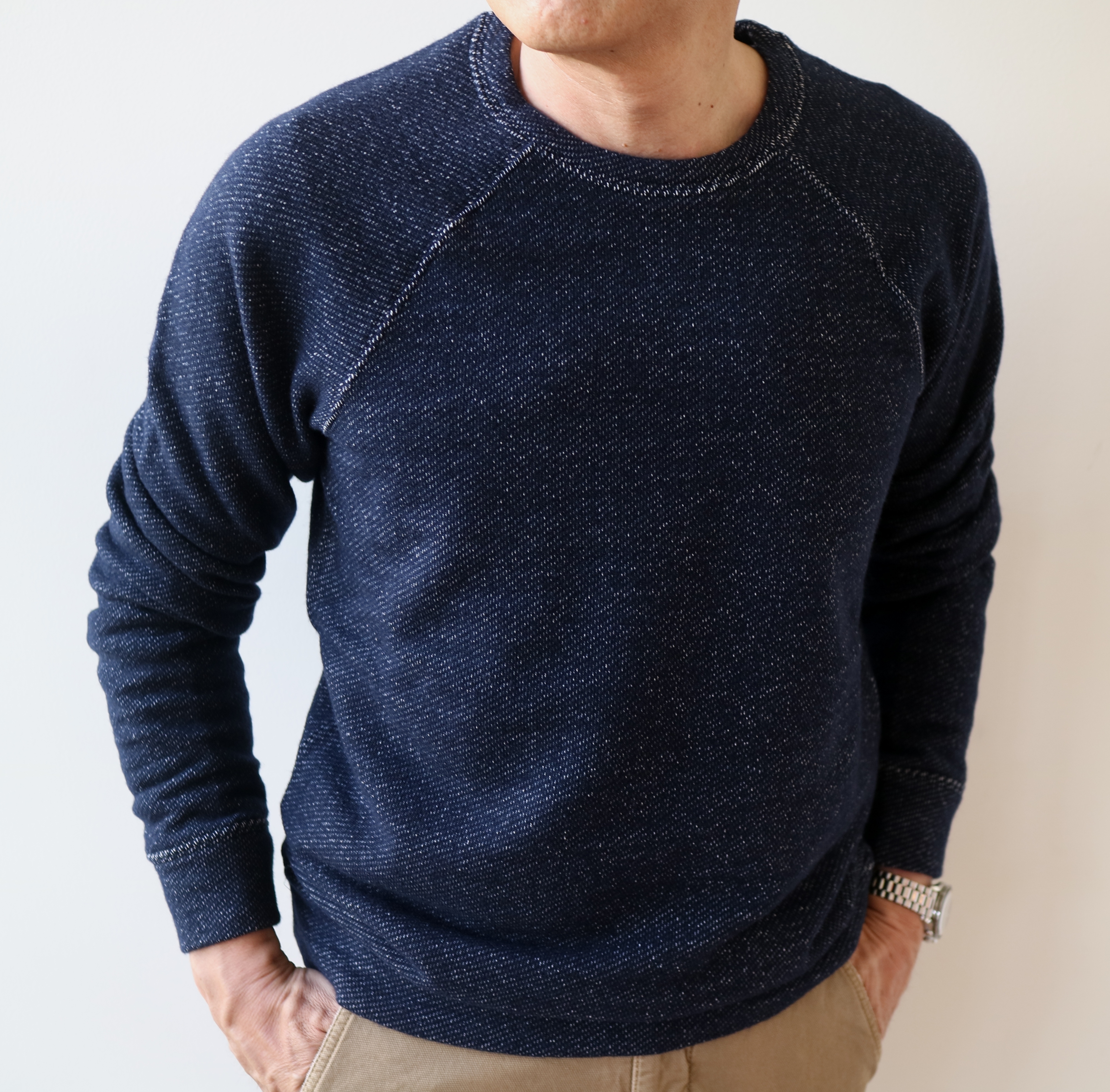 深みのあるインディゴと地のホワイトがリズミカルです。ウール・コットンの軽くて、保温性のあるカットソーは、真冬の普段着として手が離せなくなりそうです。
