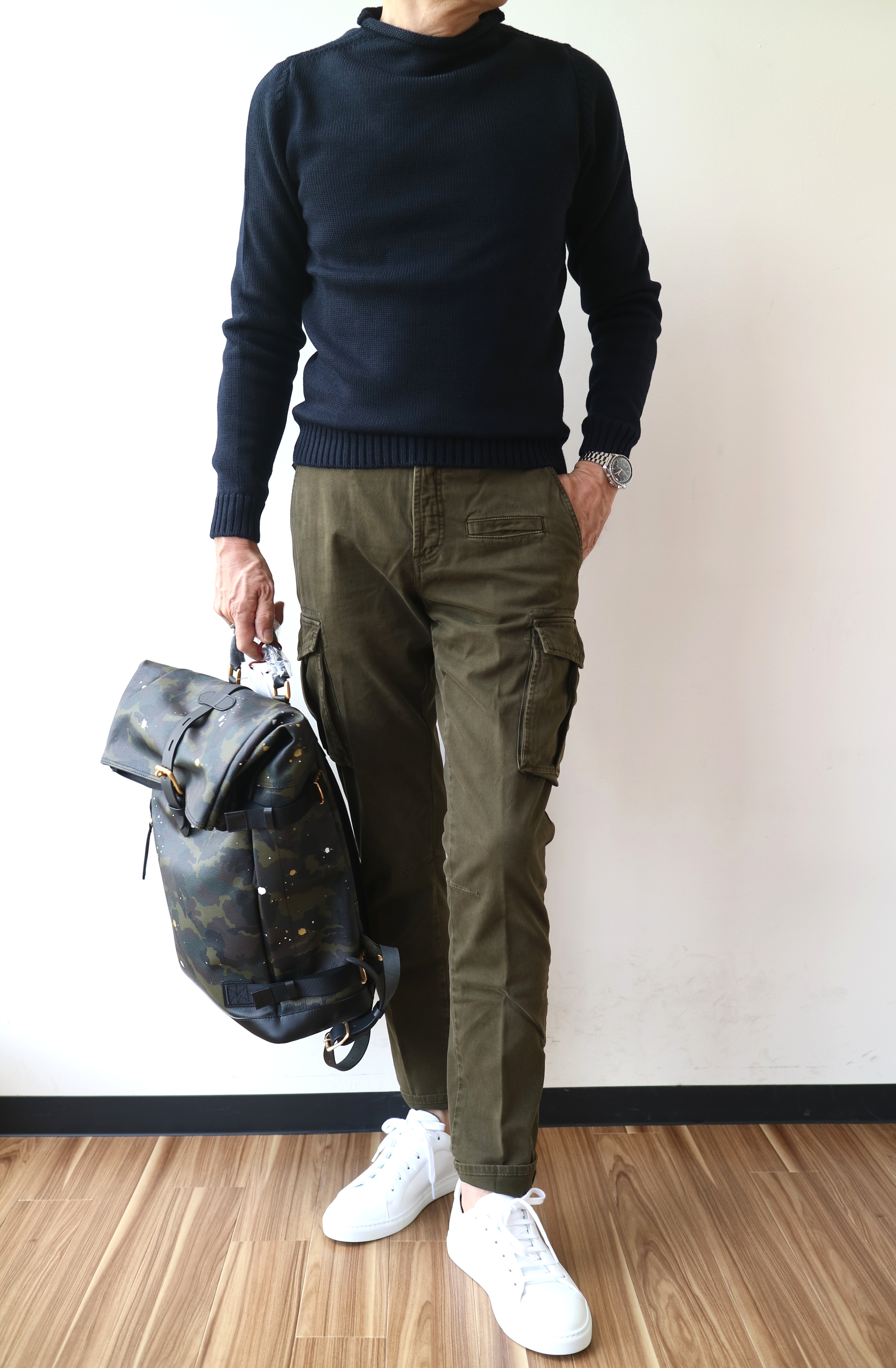セレクトカラーは、オフホワイト、オリーブグリーン、そしてネイビーの3色。ドレスパンツからジーンズ、カーゴパンツなどとボトムは選びません。オリーブグリーンで合わせたデニムはSIVIGLIA、靴はSpring Court。ネイビーで合わせたパンツもSIVIGLIA、靴も同じSpring Court、鞄はGENTIL BANDITです。