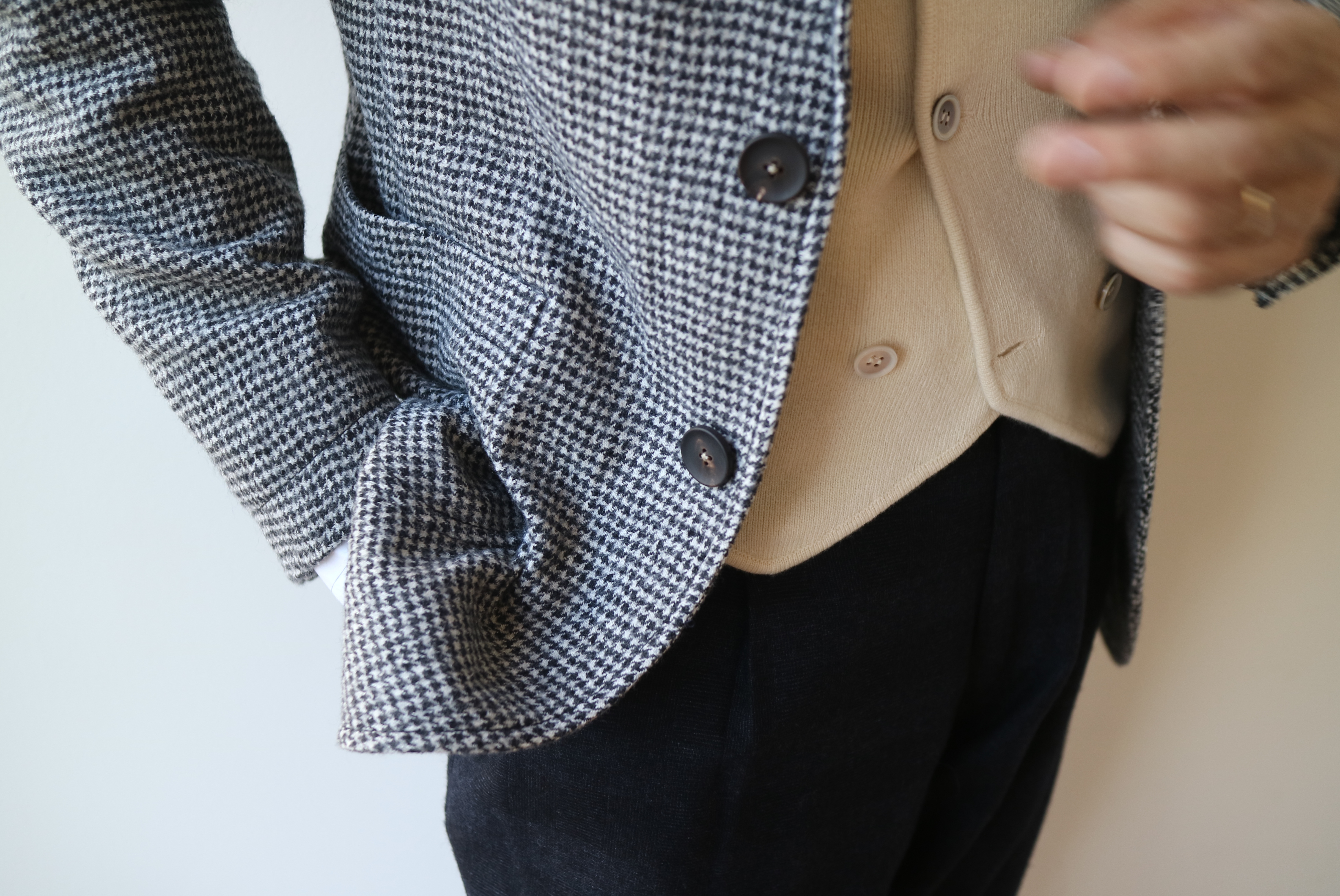 ウールの素朴さを前面に出したモノクロのハウンドトゥース柄。ホーン釦とのバランスも良く、さり気ない着こなしに華を添えます。