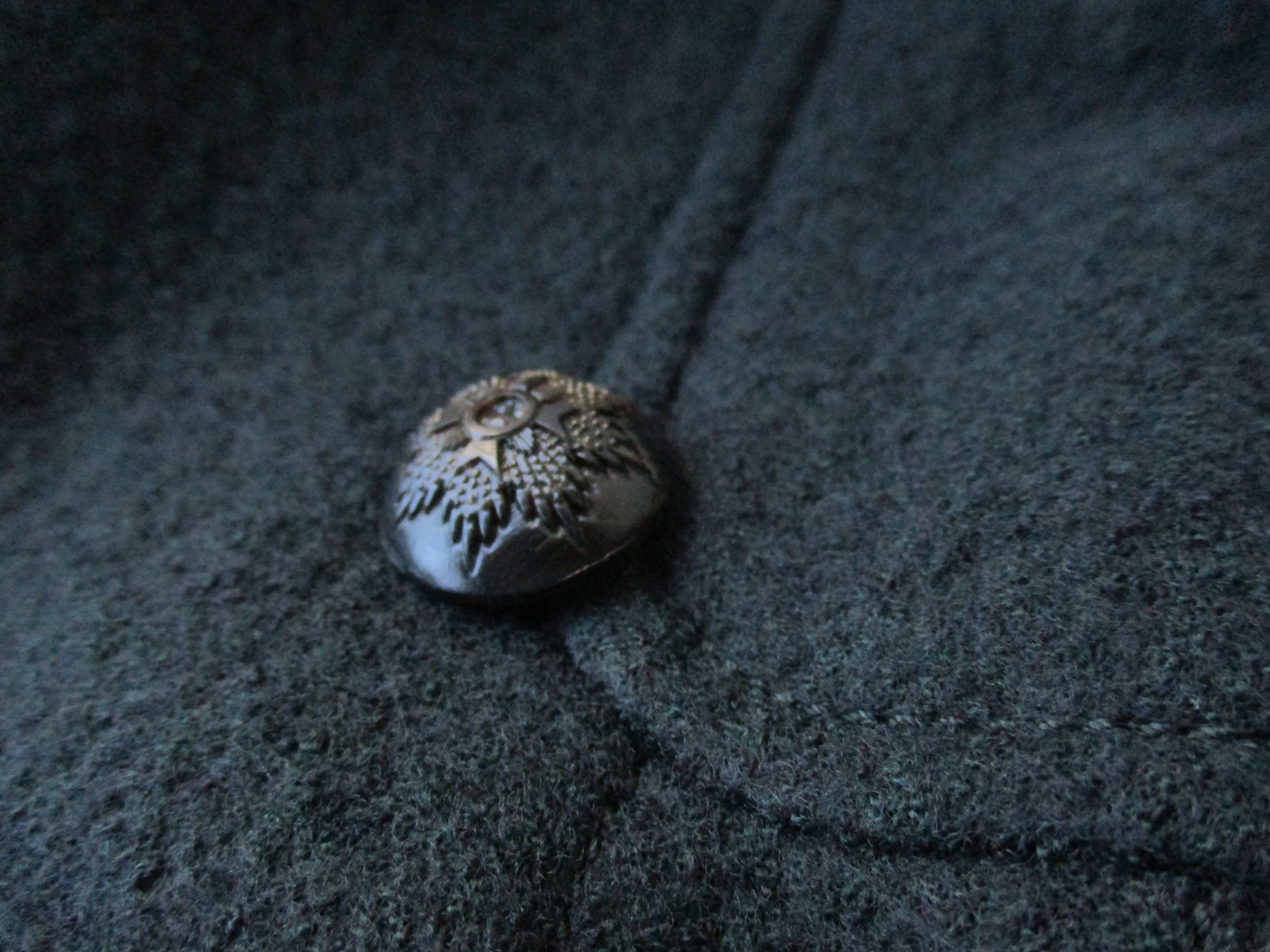 ウール100%のブークレ調に付いた釦は、メタル風のウッド釦。ころっとした愛嬌のある表情を作り出しました。
