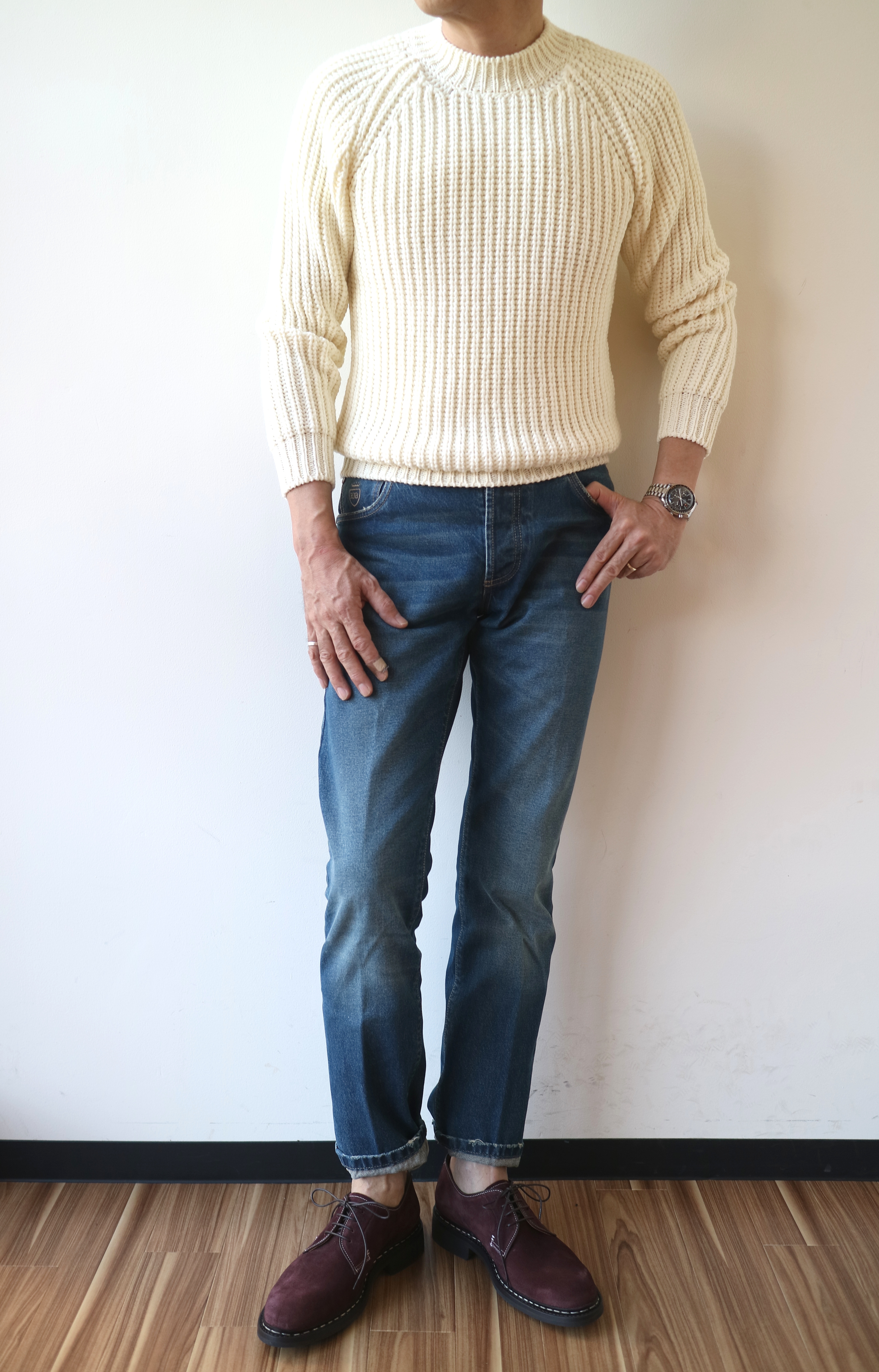 ニットにデニムと、シンプルでいて、今、気になるコーディネートに合わせてみました。ニットはSettefili Cashmere(セッテフィーリ カシミア)、デニムはRICHARD J.BROWN(リチャード ジェイ ブラウン)、どちらも近日中に公開です。