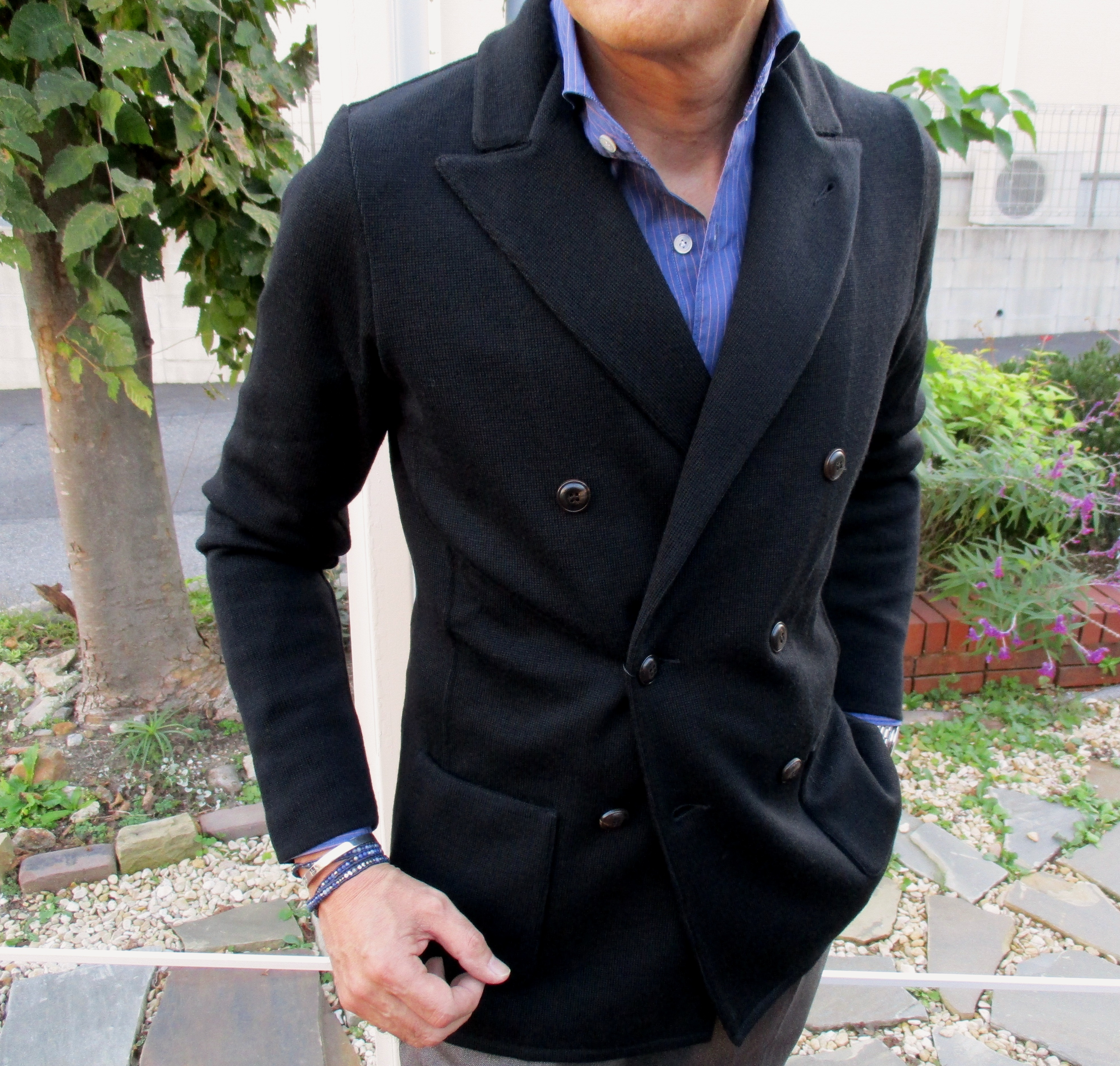 ニットならではの体への吸い付き。フィット感のあるダブルブレストは、気張らない気楽さと、さり気ないリッチ感を手に入れることができます。
