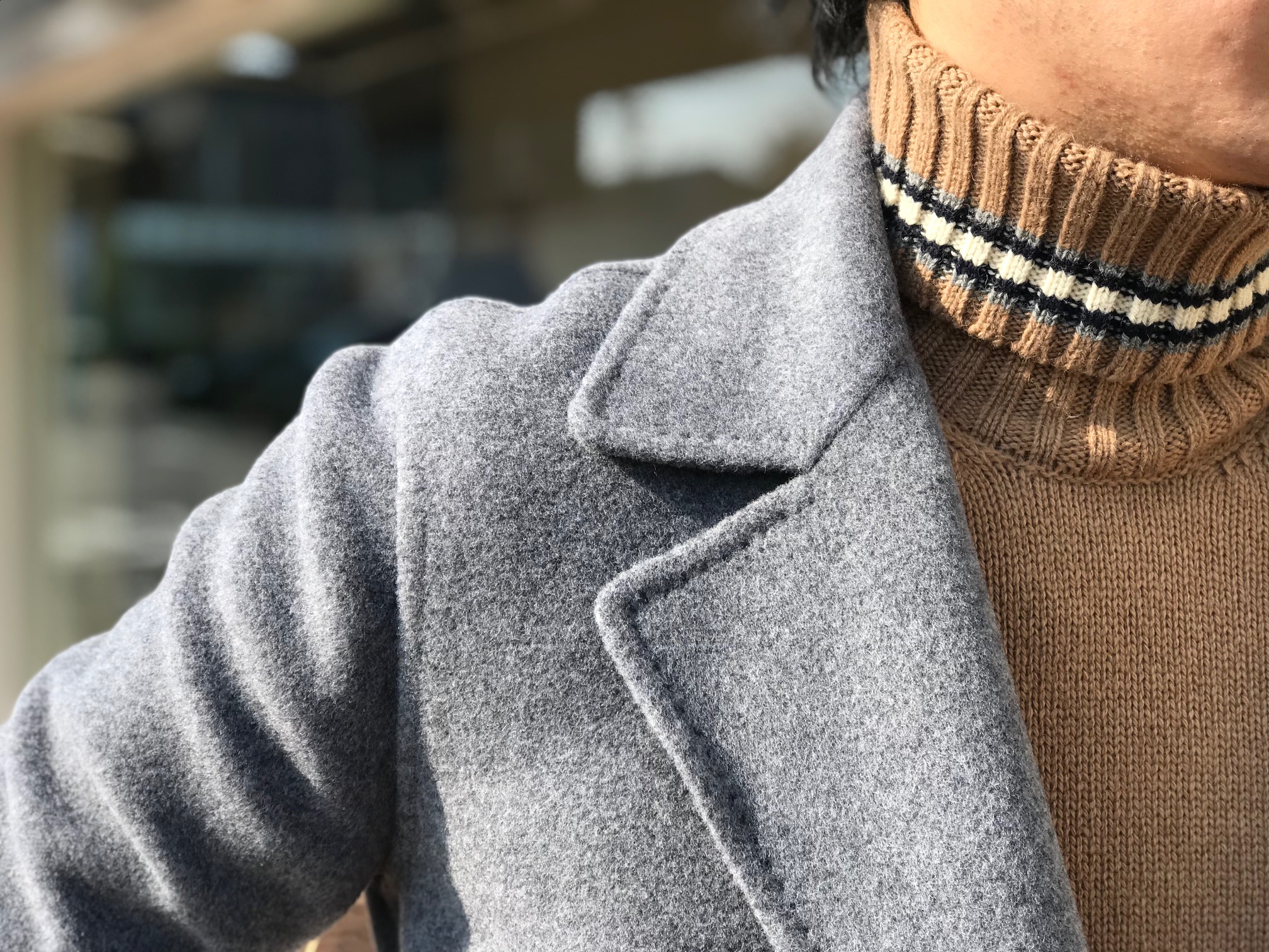 表面に毛羽はほとんどなく、やや軽めの生地は颯爽とひっかけることができます。まさに普段着のコートですね。