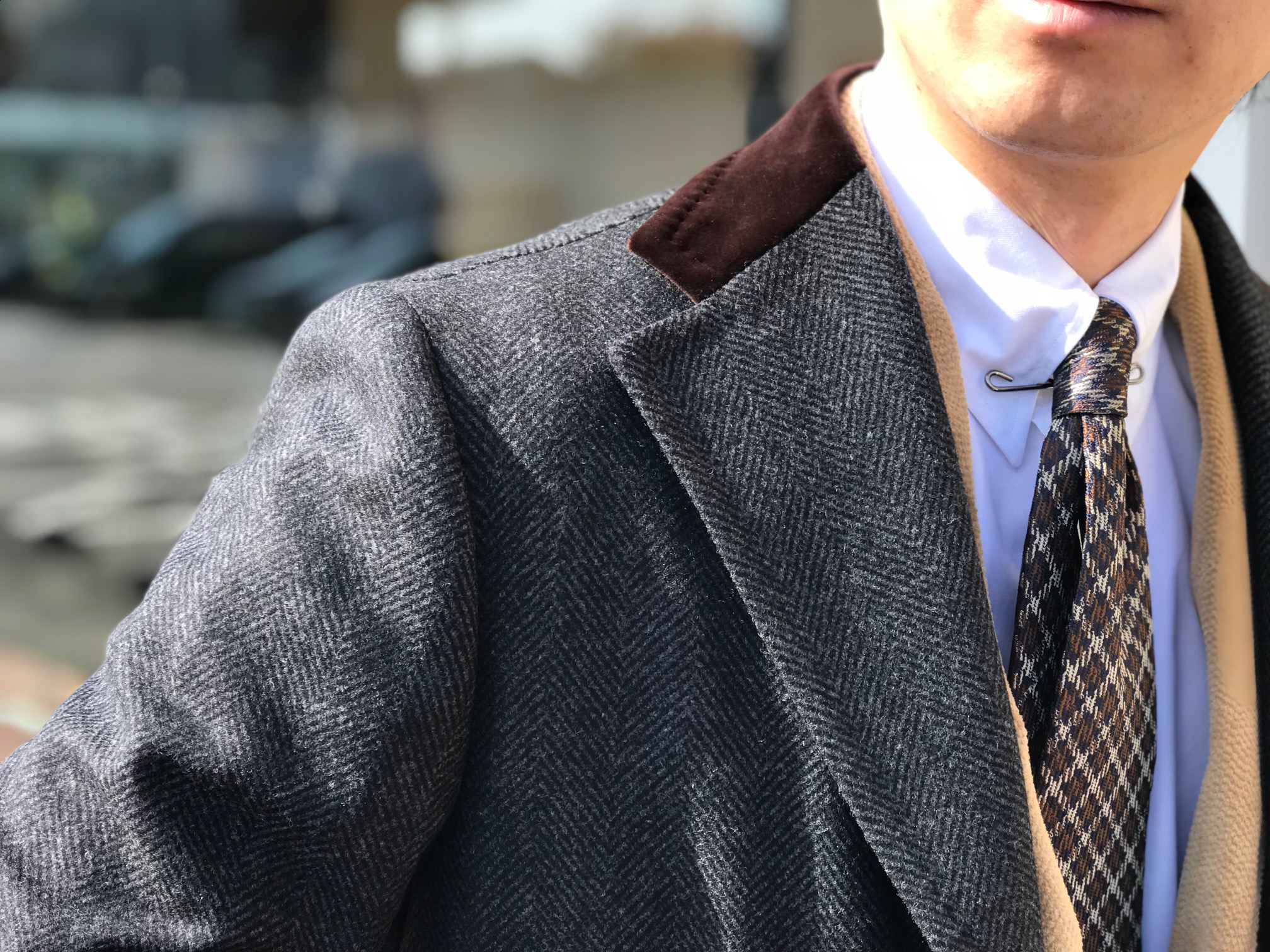 元来のチェスターコートを思わせるような、上襟をベルベット生地に切り替え、前身頃と袖釦も同生地のベルベットの包み釦になっています。今回のコーディネートは、この時季にお馴染みの"ちょっとしたパーティ"をイメージしてみましたが、ある時はドレスアップであったり、場面によってはドレスダウンであったり、夜のパーティから普段着のカジュアルスタイルまで、色んな顔を持つコートです。