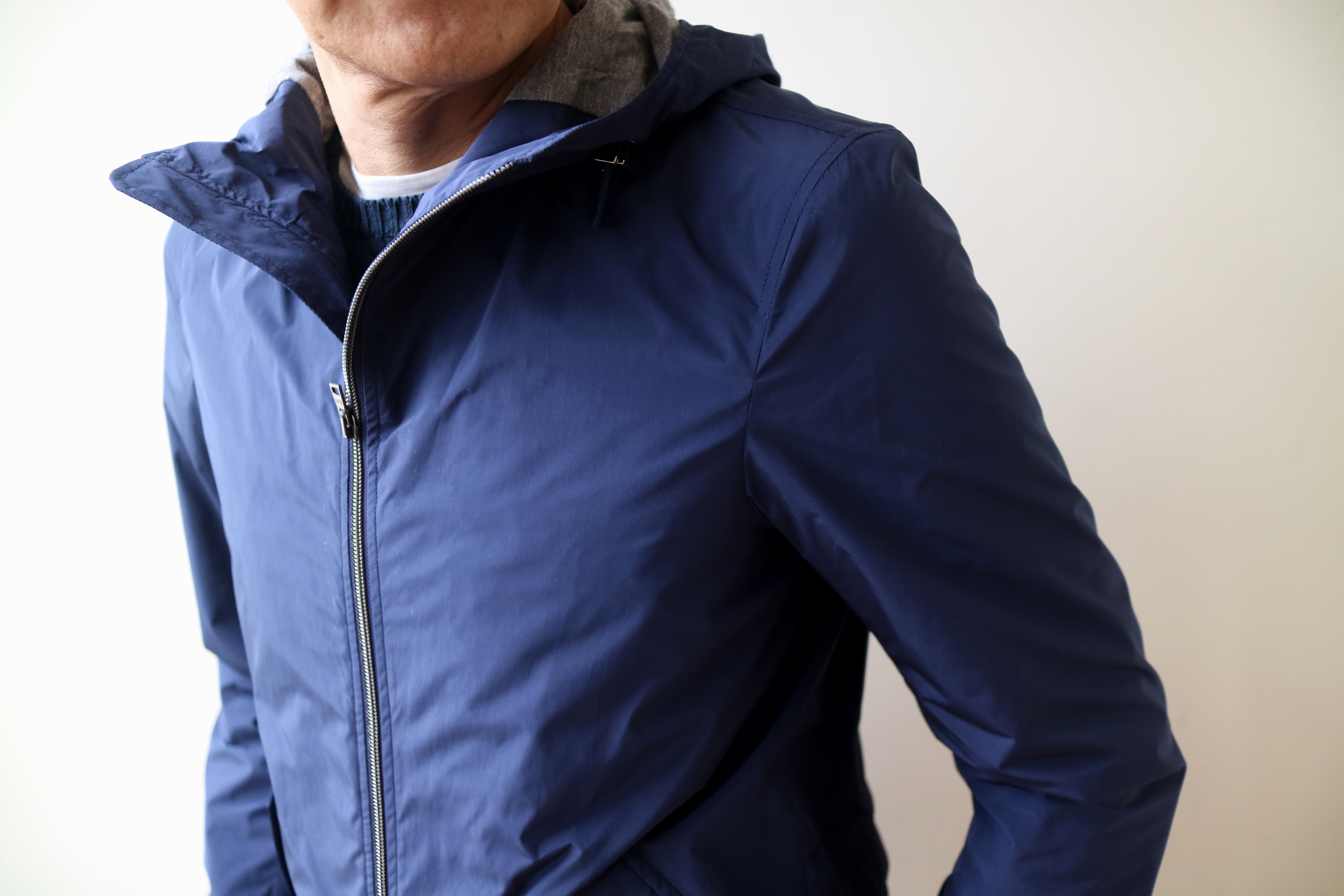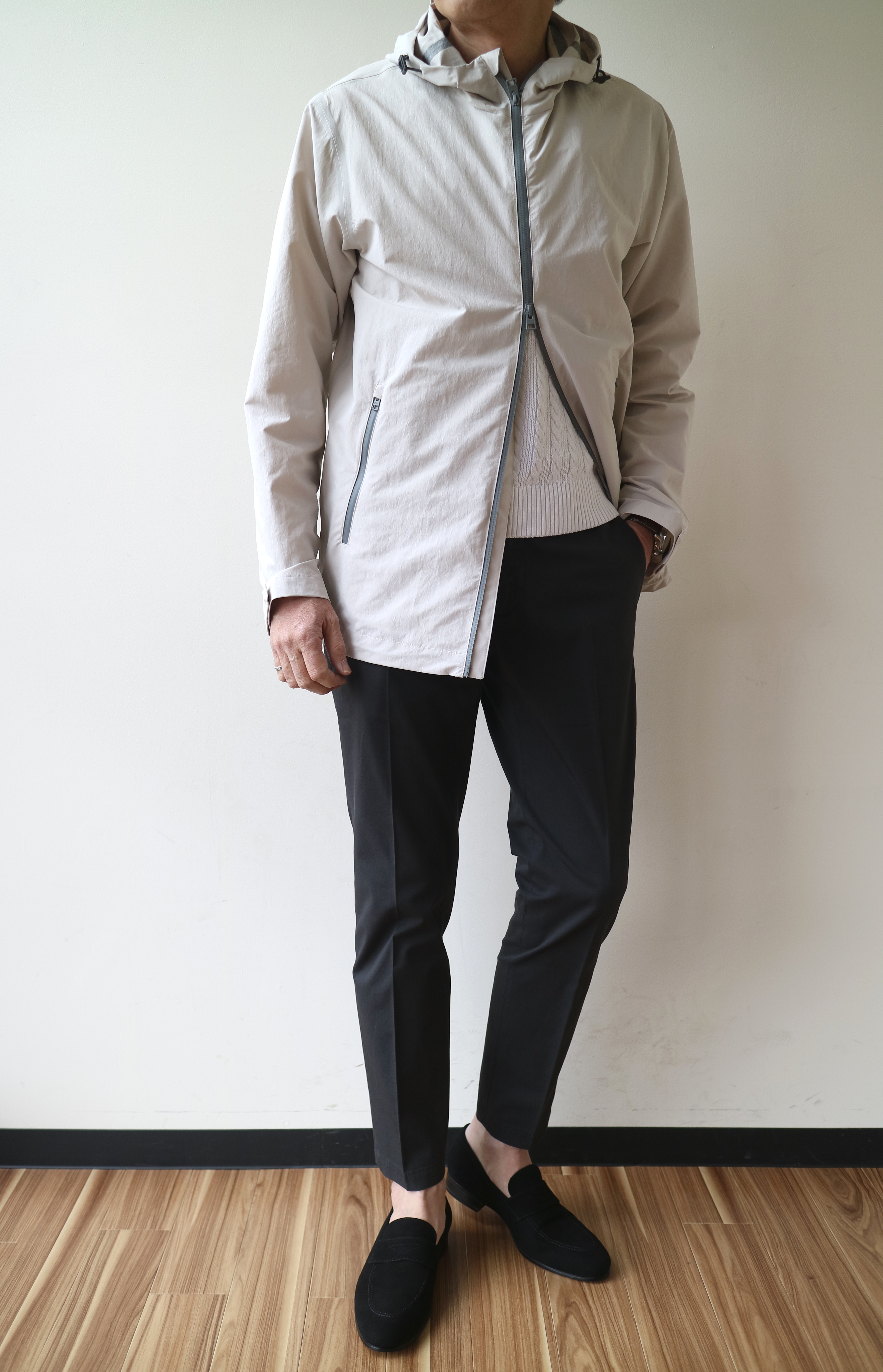 春物なのに、春/スプリングという名前を敢えてつけないのは、着用期間が春だけに限らないからです。例えば裏地付きのMooRERであれば、極寒の地でなければ、冬物に合わせて着ることもできます。ましてや車を使ってのドアトゥドアなら、厚くて重いアウターは暖房の効いた部屋であれば、邪魔になってしまうかもしれません。更に秋口から使える便利さもあります。秋に入荷するアウターは、これから寒くなる冬を見越して厚手のものが多くなり、春に入荷したものが秋や初冬に売れていくのも、そんな事情があるからなんでしょうね。