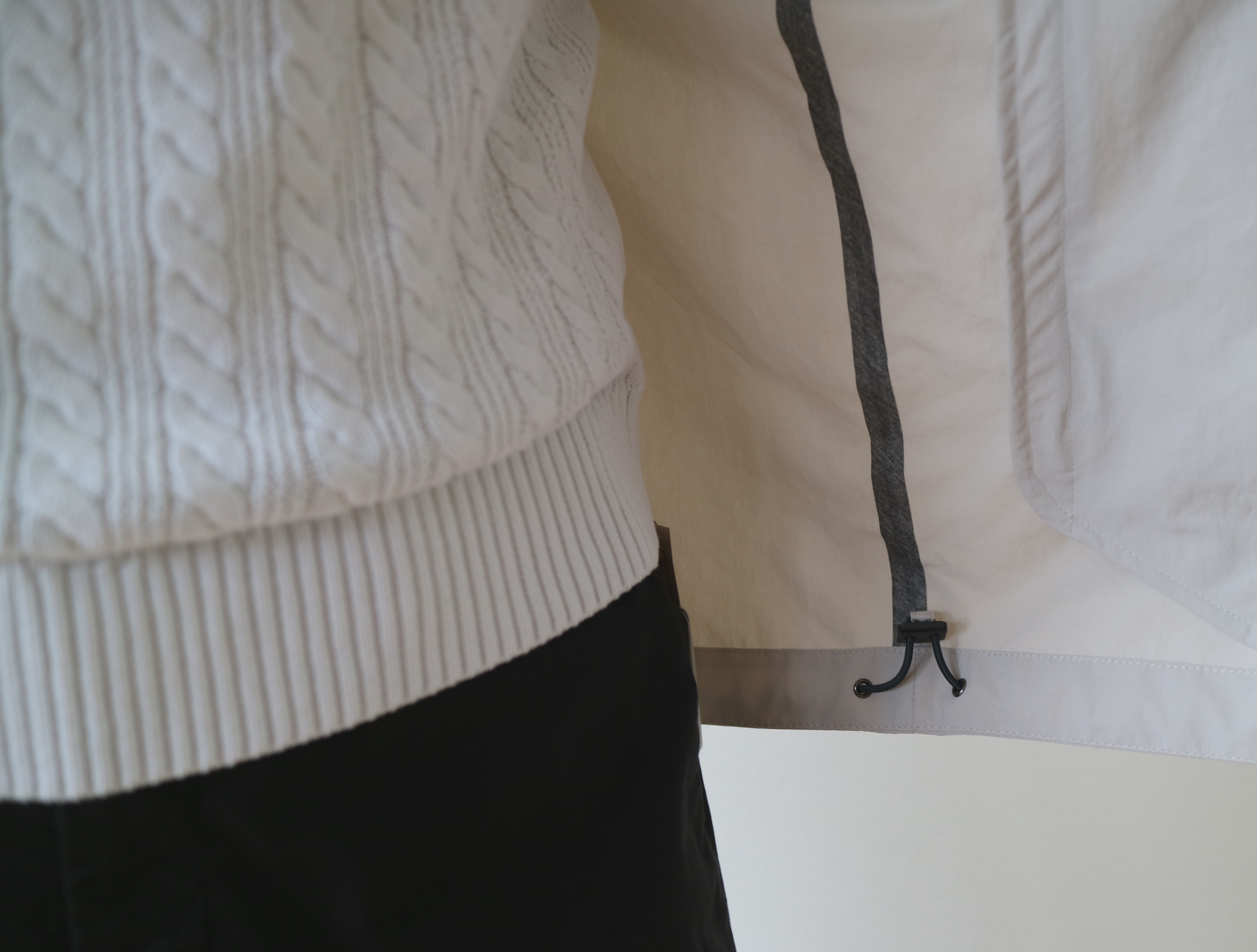 強風の時に役立つドローコード付きフード。その機能は裾にも付き、下からの巻き上げる風を防ぎます。