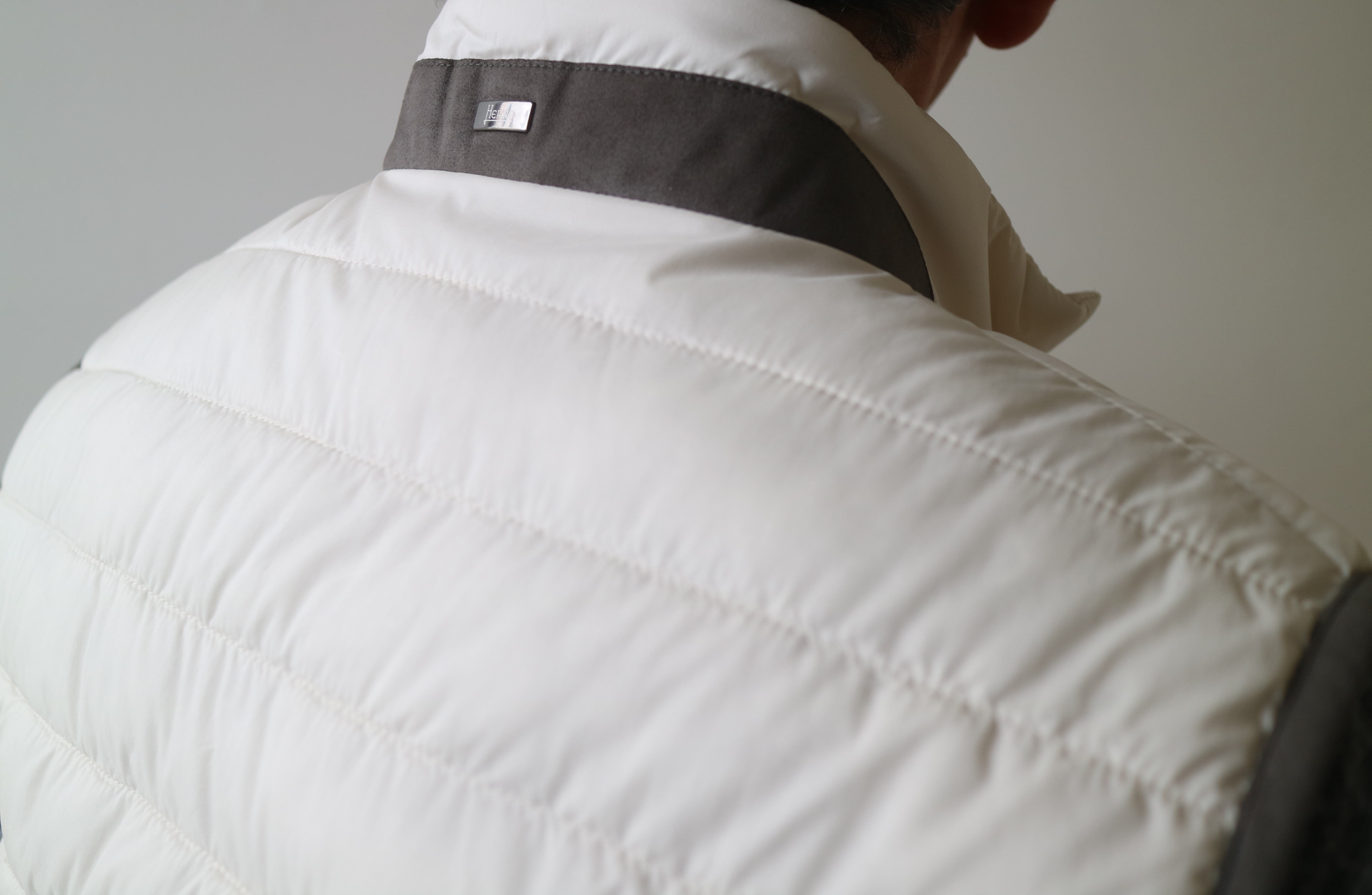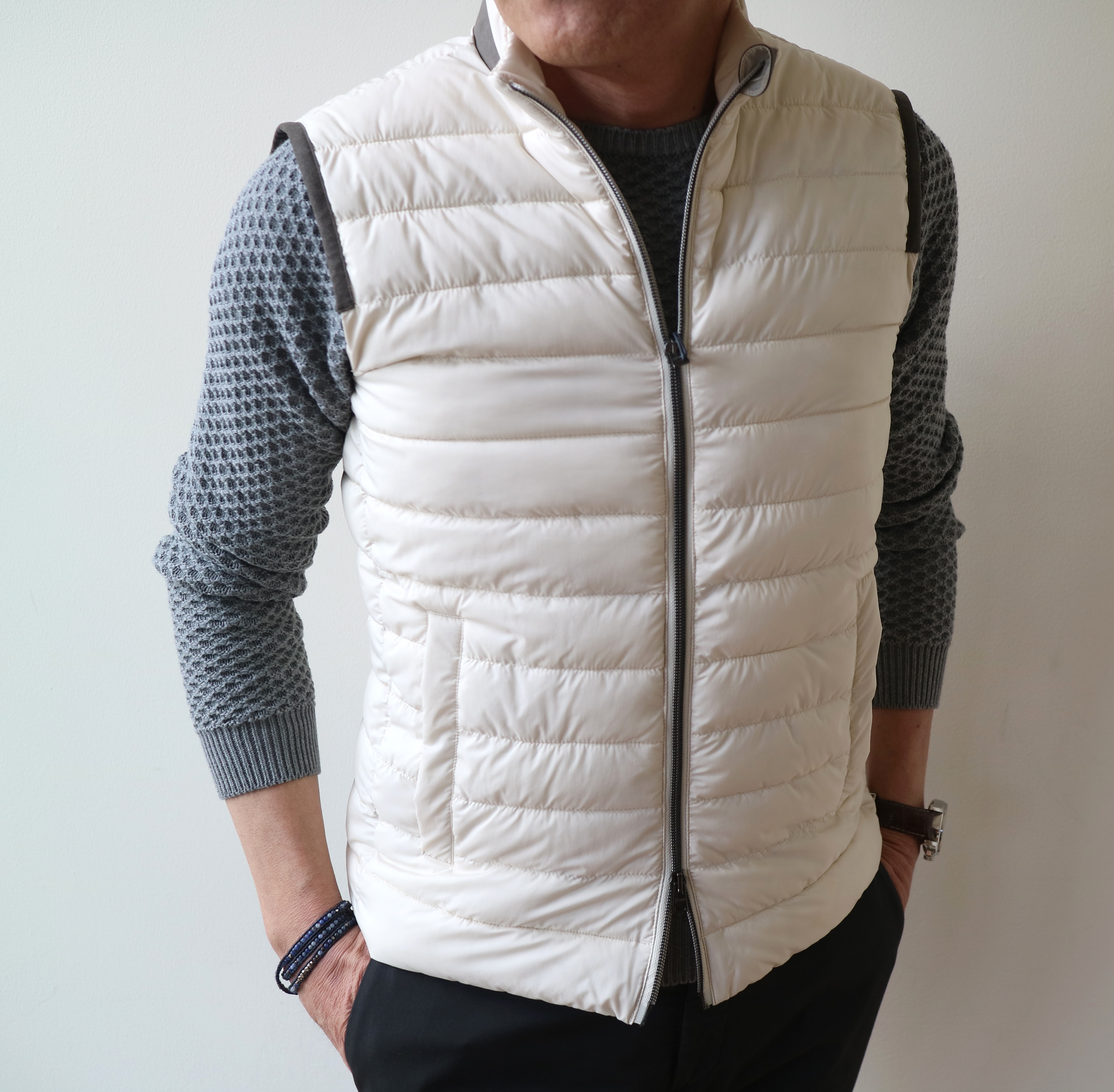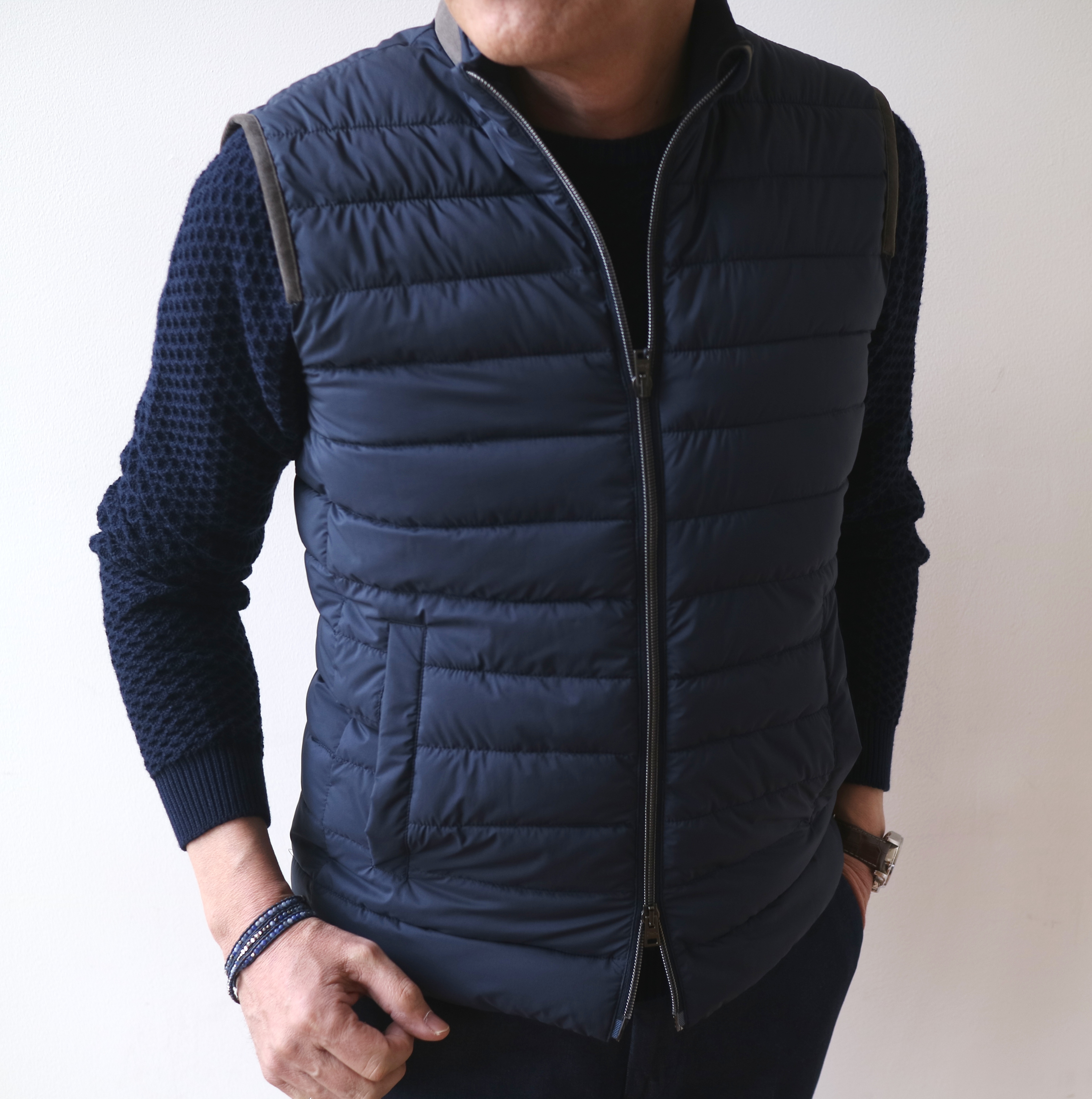 ニットとのコンビではありません。こちらはベストのみのご提案です。詰物はフーデットブルゾンと同じ「HERNO IN-TEC」。素材も同じポリウレタンコーティングされたナイロンです。