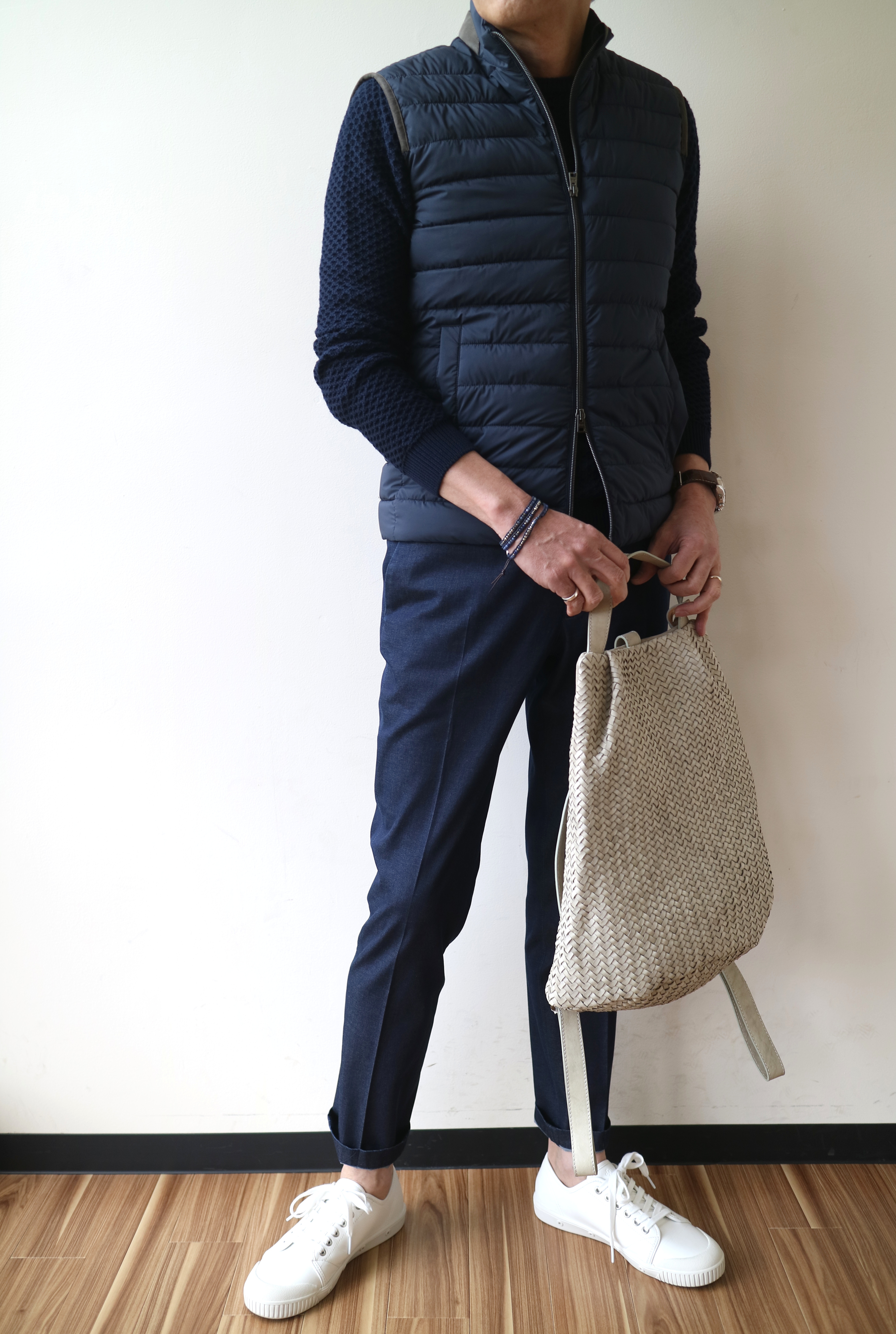 合わせたニットは、どちらもZANONE、パンツはアイボリーホワイトがINCOTEX、ネイビーもINCOTEXです。靴はアイボリーホワイトがPantofola d'Oro、ネイビーはSpring Courtです。