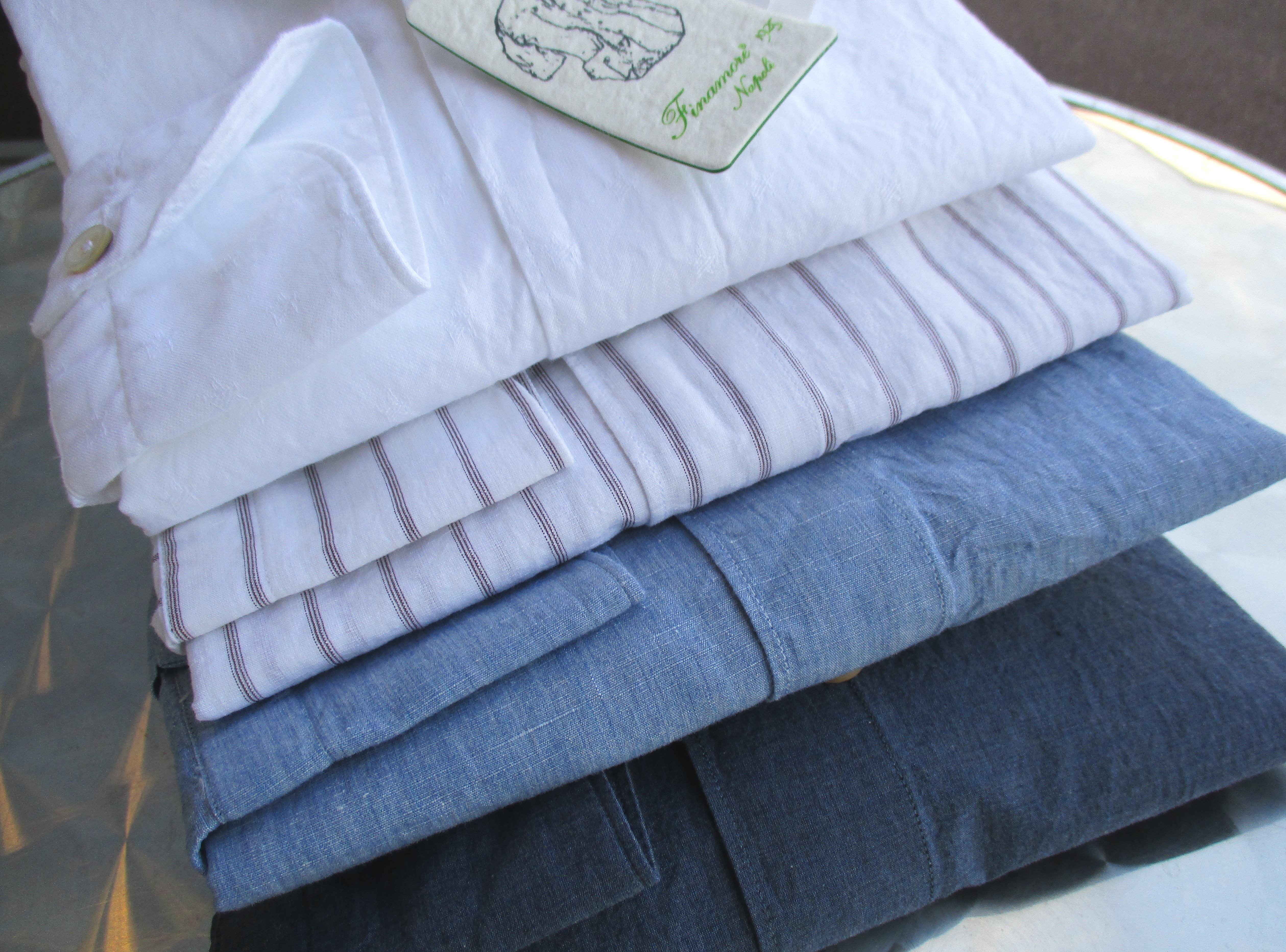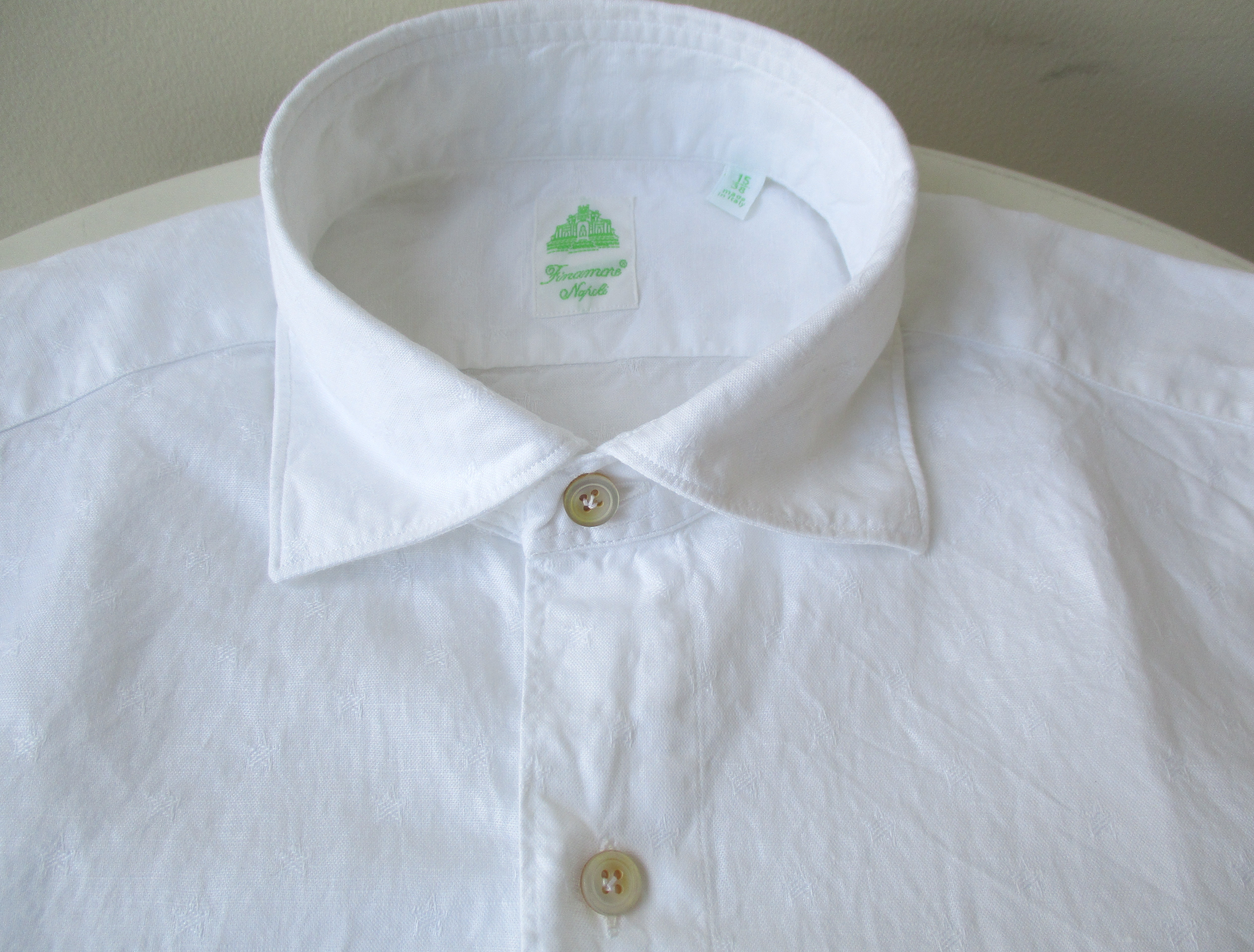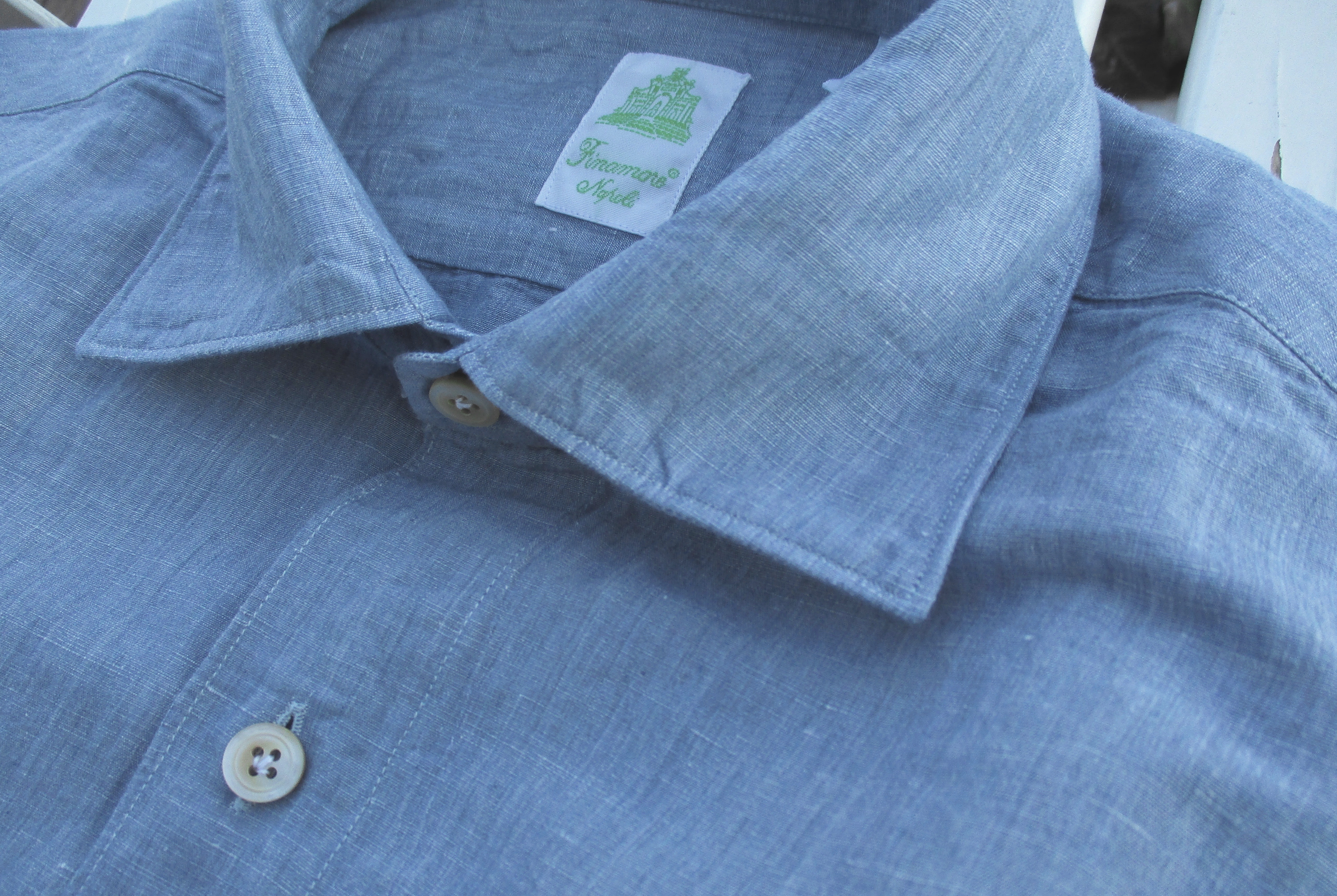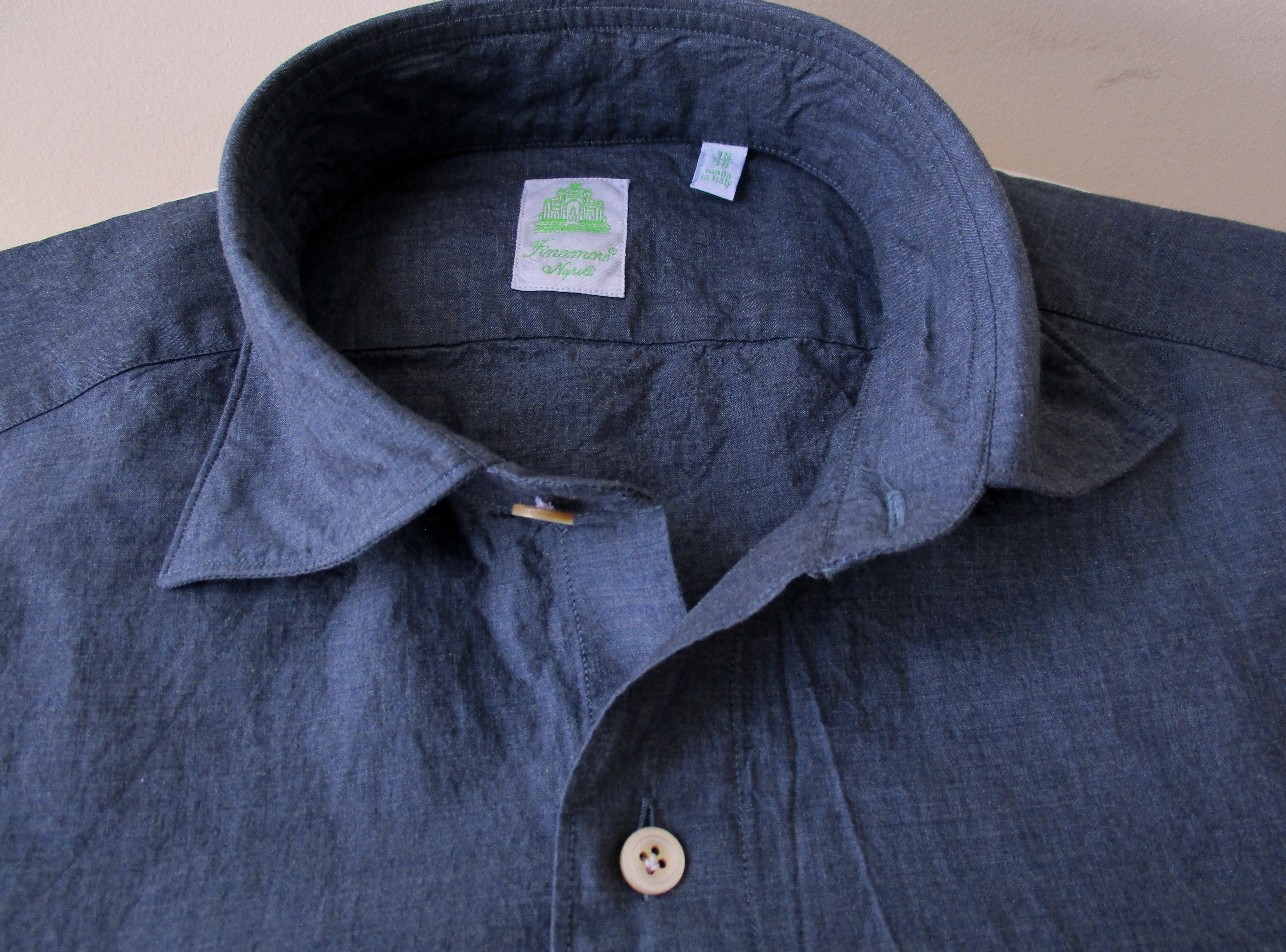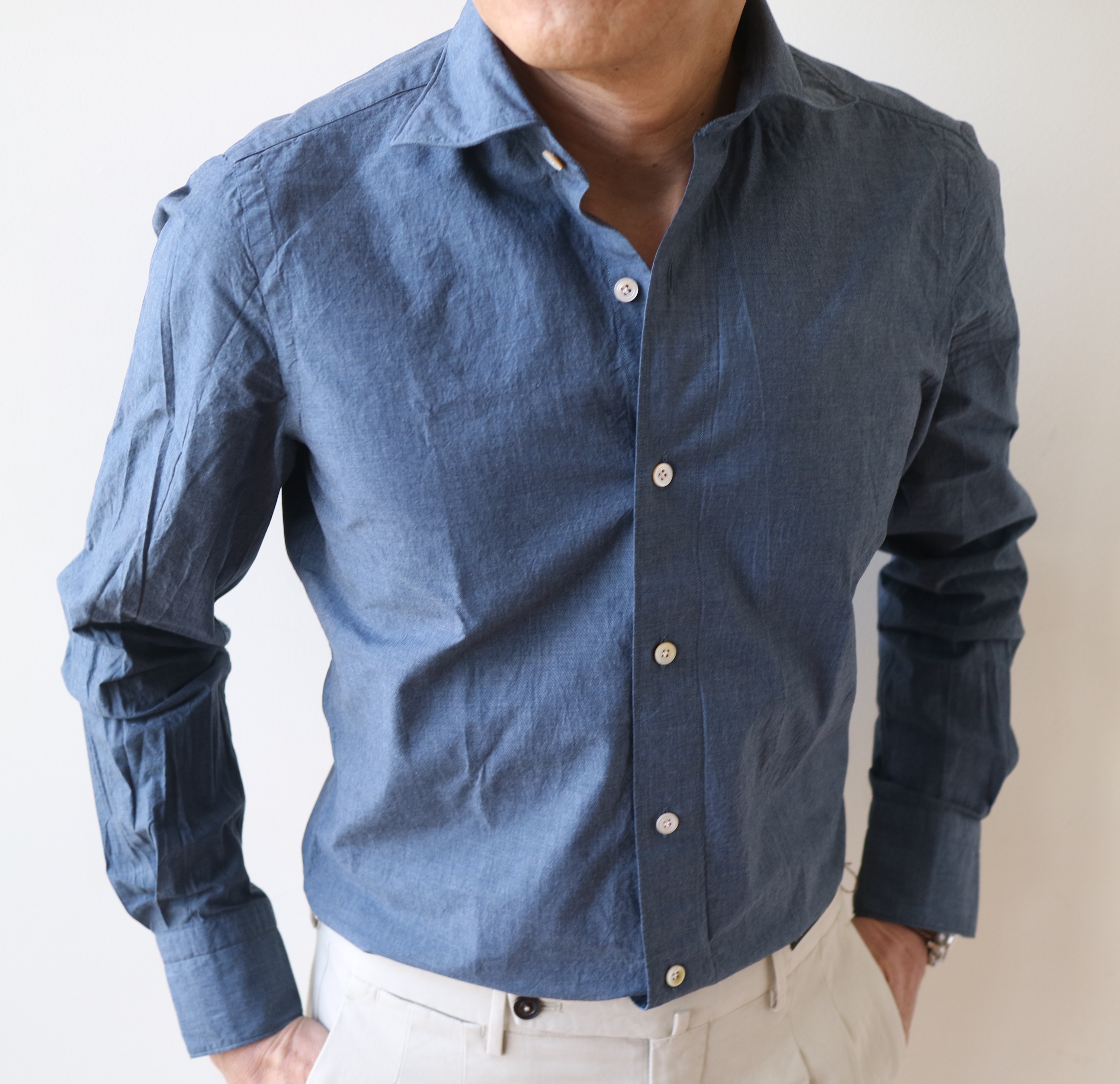 一見、シャンブレーに見えますが、実はフェイク。フェイクと言うと人聞きが悪いのですが、生地を見た瞬間、敢えてシャンブレーに見せる技を持っていることを見せつけられた気がします。ラフな印象のシャンブレーやデニムをもう少しドレスよりに見せようという意図であり、シャンブレーやデニムでは出せない艶を表現しています。さすがフィナモレです。ただ、その意図は私が勝手に感じているだけ...かもしれません。