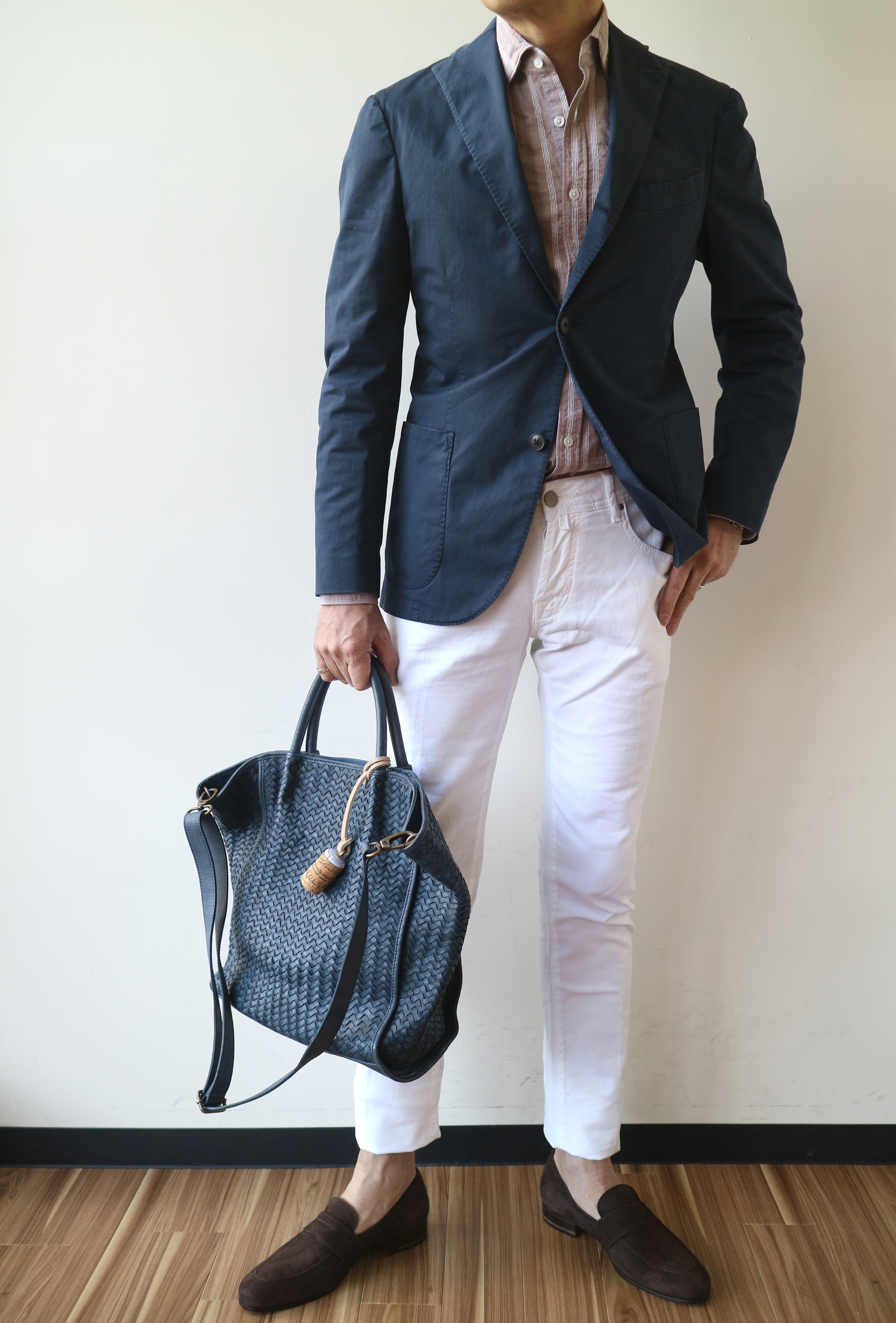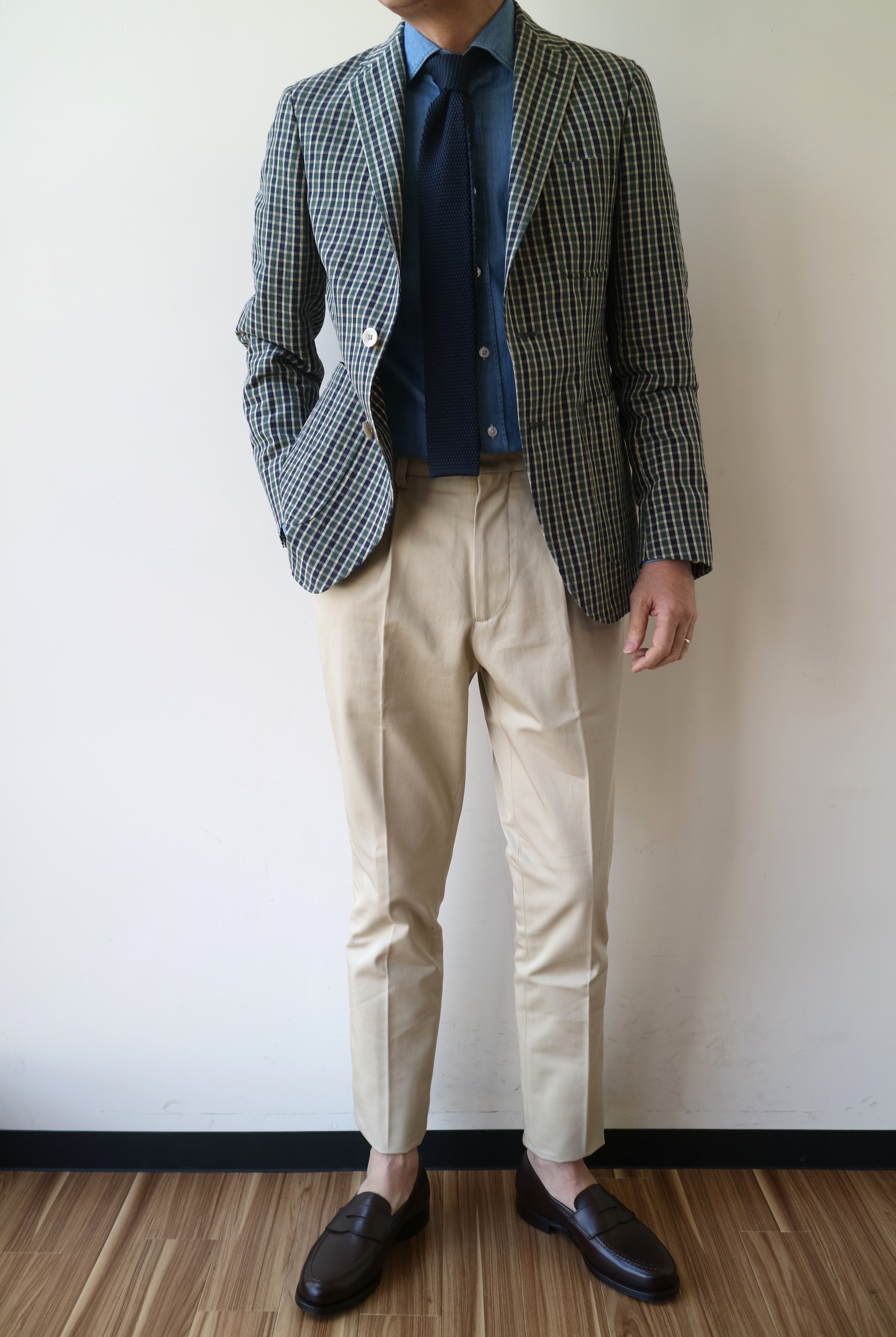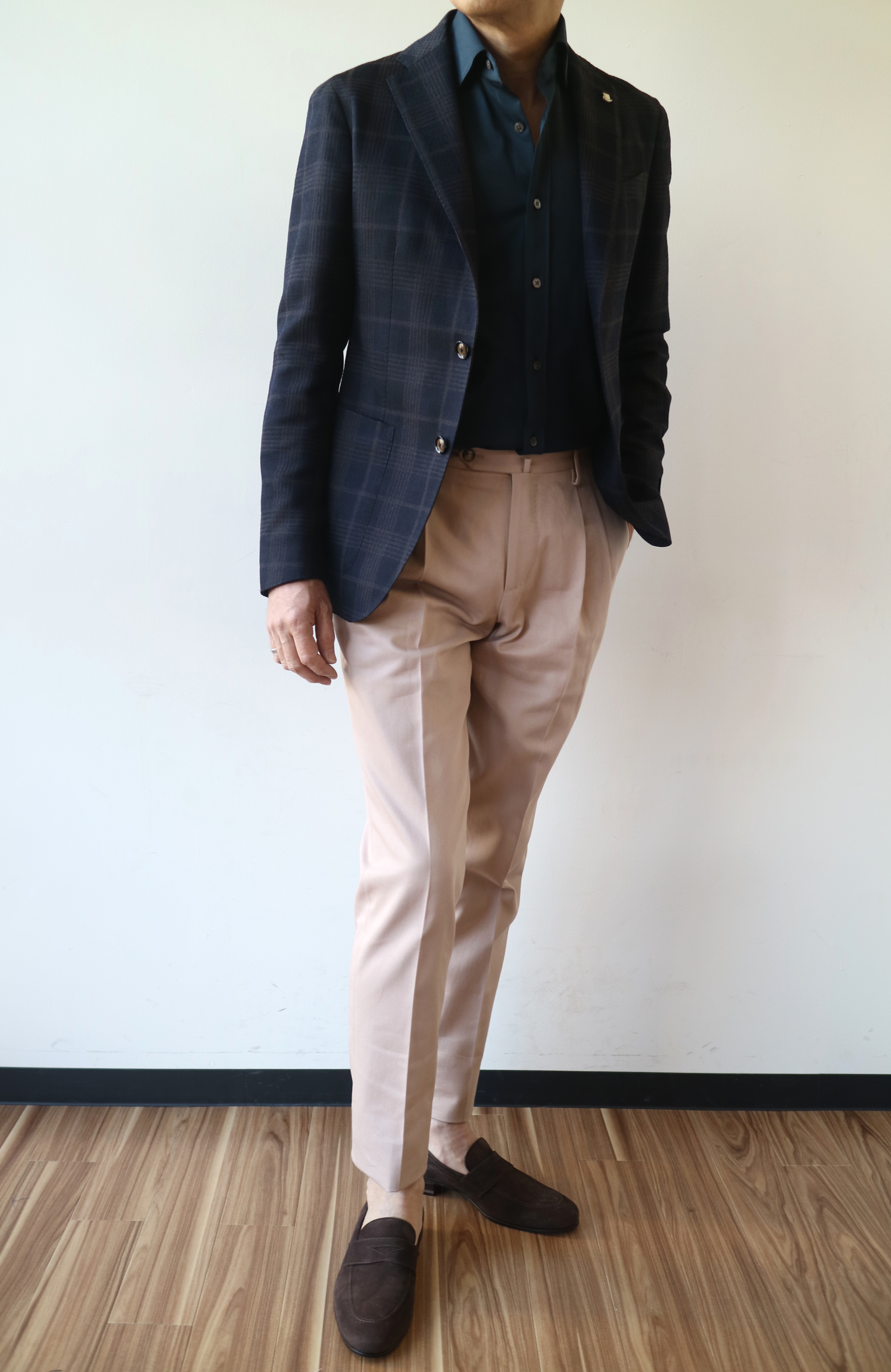 こちらは本日のコーディネートです。TAGLIATORE(タリアトーレ)のジャケットに合わせたシャツは、伸びます。