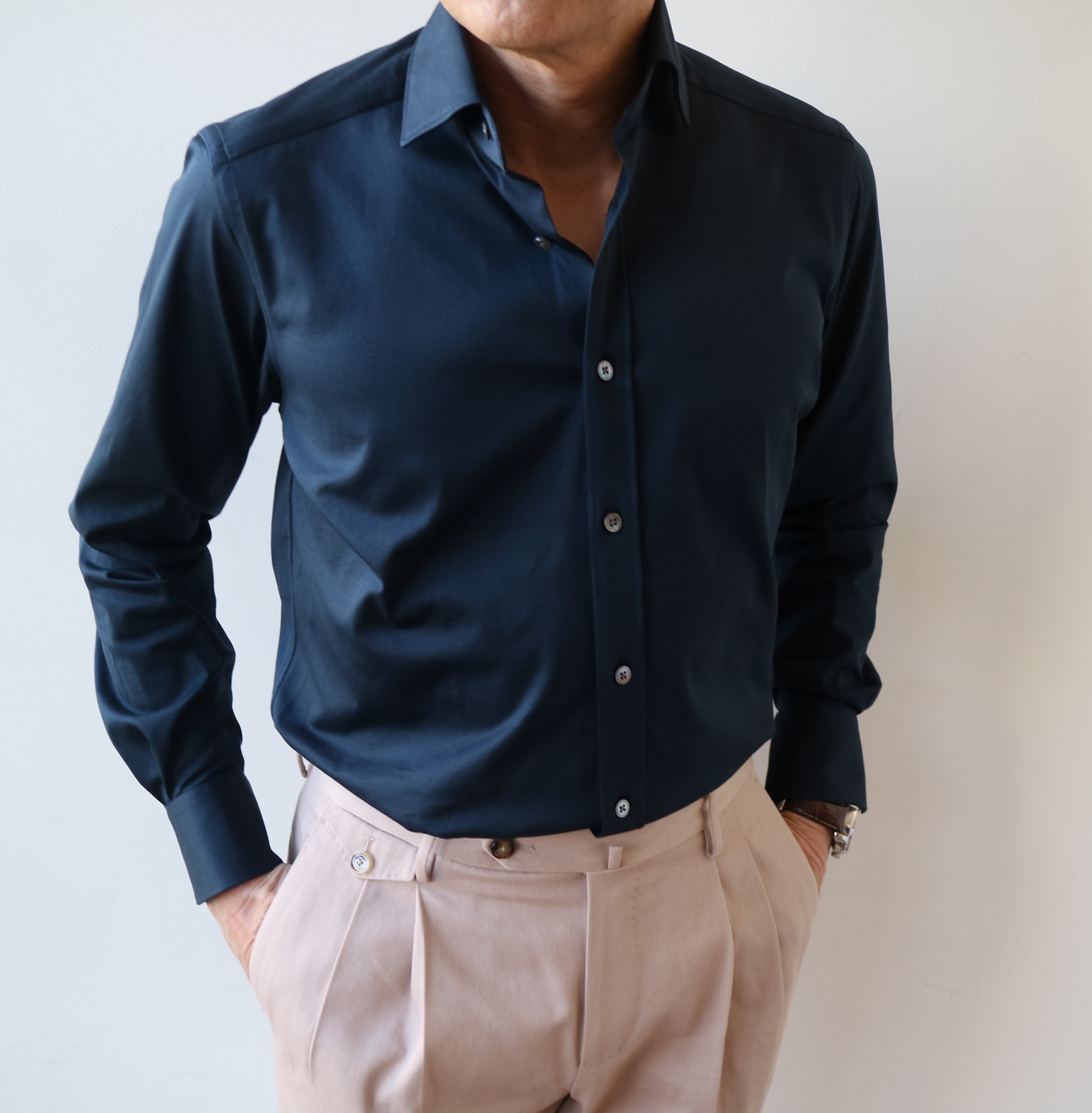 コットン100%のしなやかな手触りと、さり気ない表情が魅力。あえての説明要らずでしょうが、加筆させていただくとすれば、アルマーニやラルフローレンのパープルレーベル、ヴァレンティノからランバンなどの錚々たるブランドのシャツを作り続けている背景をもちながら、今回、PT01(ピーティーゼロウーノ)のディレクターを務めたマリオ・マラン氏がモノ作りに加わったことです。我々にとっては、より身近な存在となった【BAGUTTA/バグッタ】。今後も楽しみなシャツブランドです。