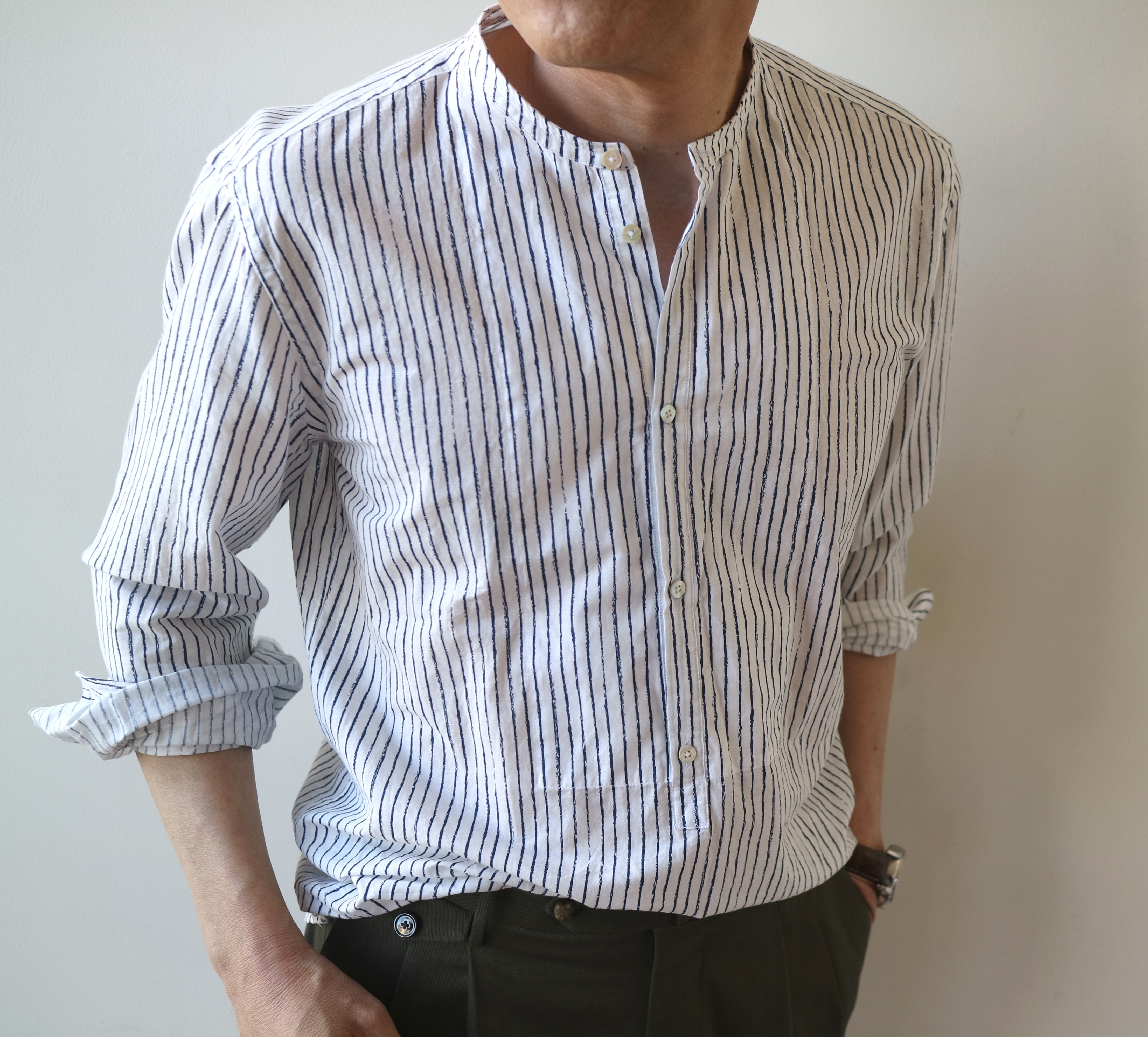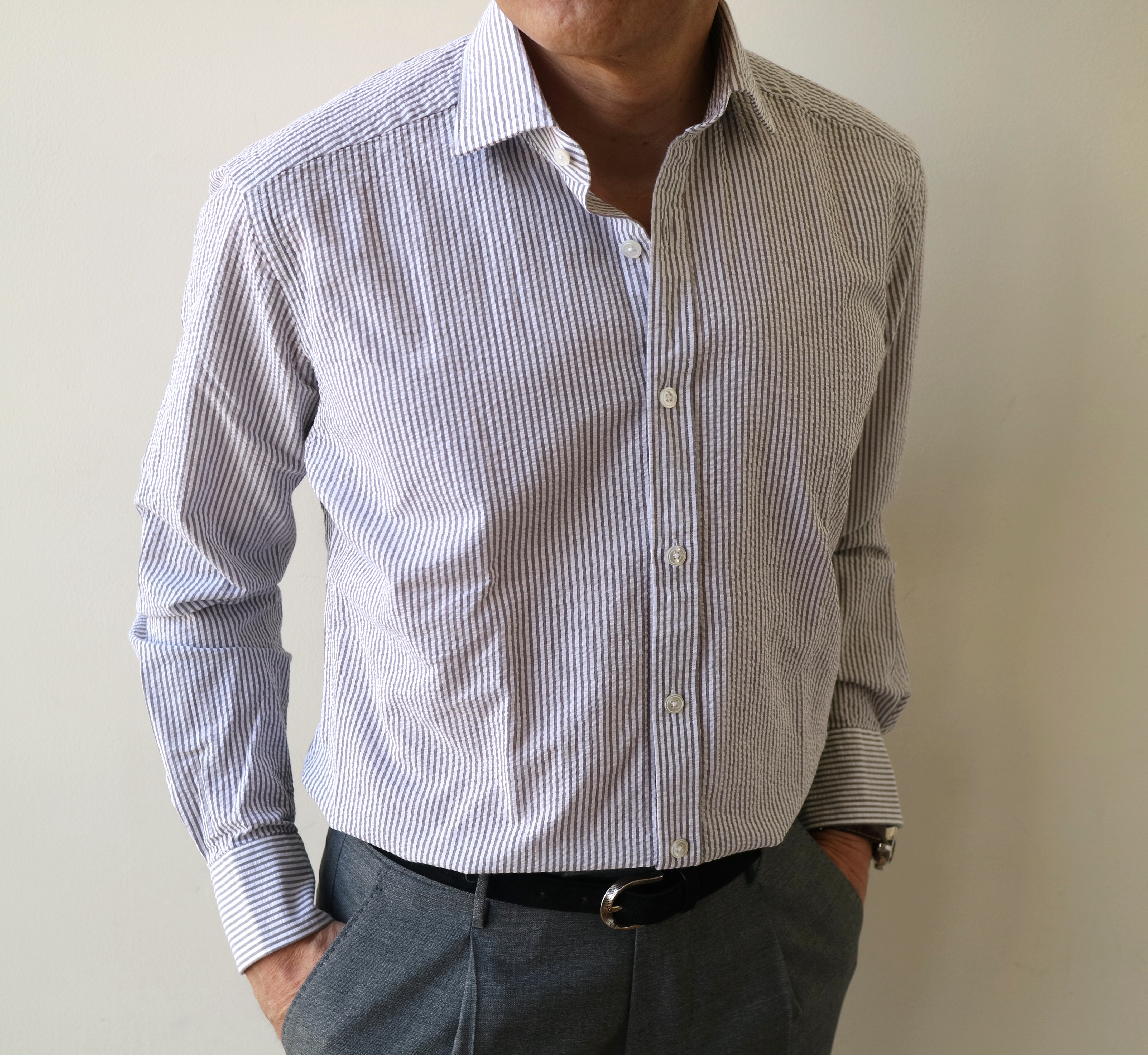 生地の表面に凹凸があることから、夏素材の代表であるシアサッカー。ただ生地を選ぶ際、気をつけなければいけないのが、糸の太さや目付けなど。間違えると厚ぼったく、ごわごわした生地になり、涼しさどころか肌に不快を感じてしまうことにもなりかねません。もちろん、こちらは問題なく、清涼感のあるシャツに仕上がっていますのでご安心ください。