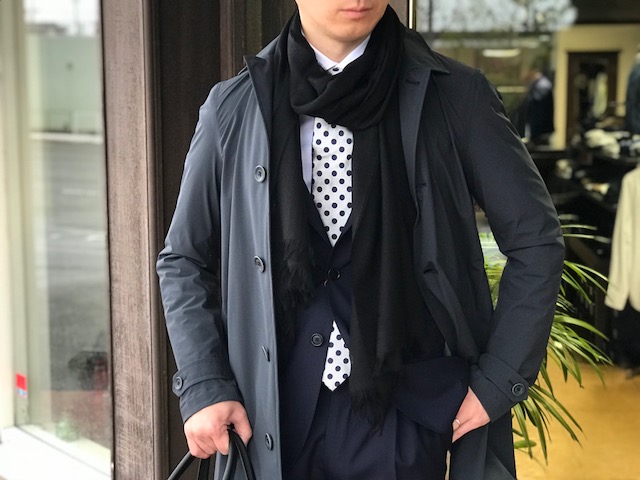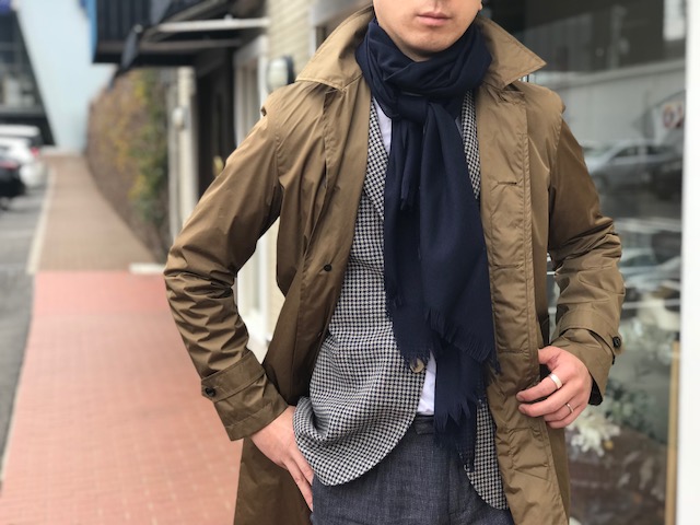 ライトウエイトのキメ細やかな生地は、首に巻いてもモタついたり着膨れするような野暮ったさはなく、首周りをさり気なく飾ってくれます。