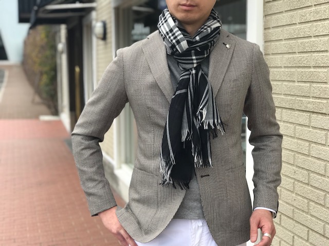 MODEL:「Tonal Block Check Scarf」ペールトーンブロックチェックストール