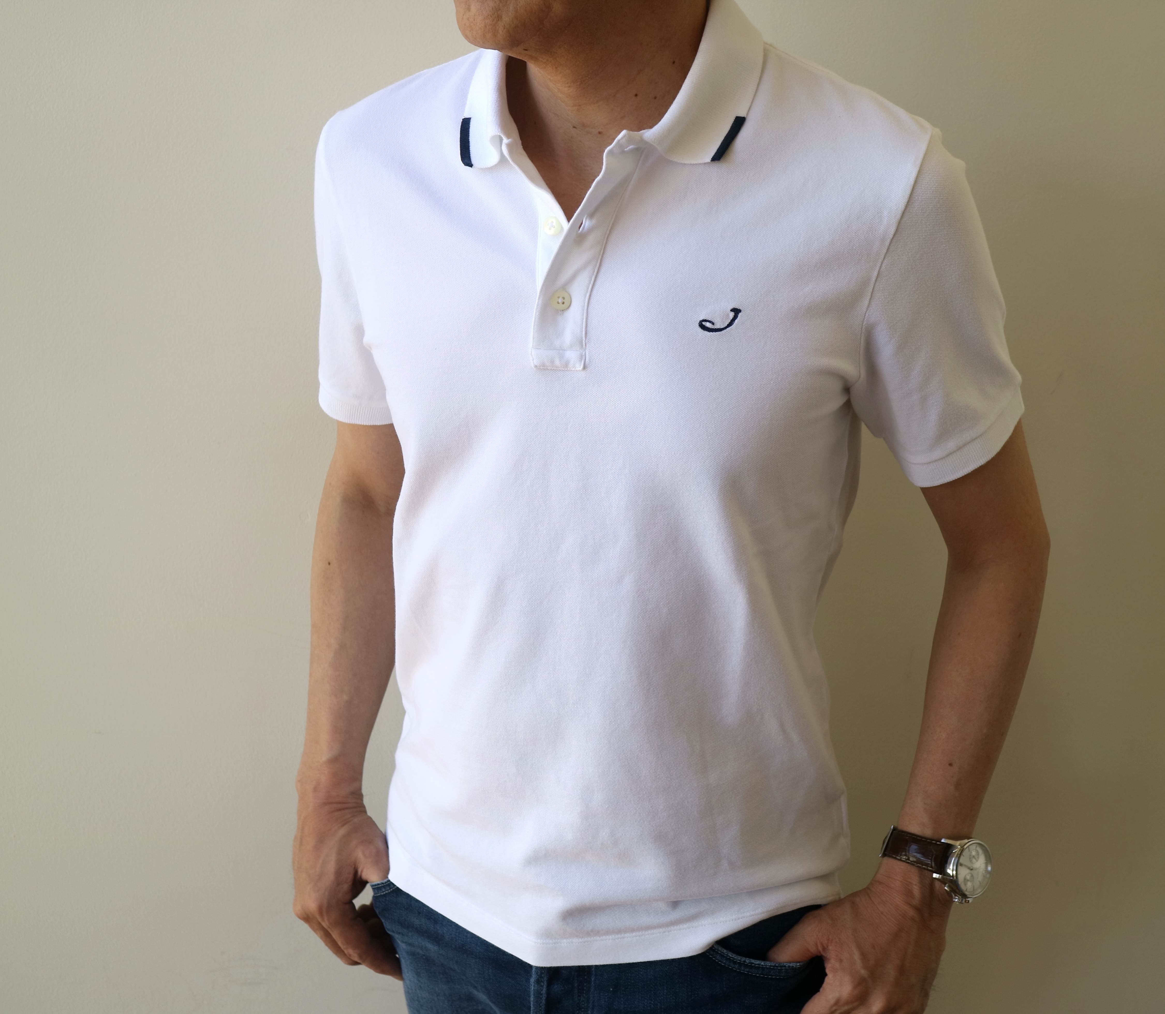 台襟の無い、鹿の子織の"THE POLO SHIRT/ザ・ポロシャツ"です。ホワイトにはネイビーの襟ラインと胸のワンポイント。ベージュは同色で控えめ。さり気なさが新鮮です。