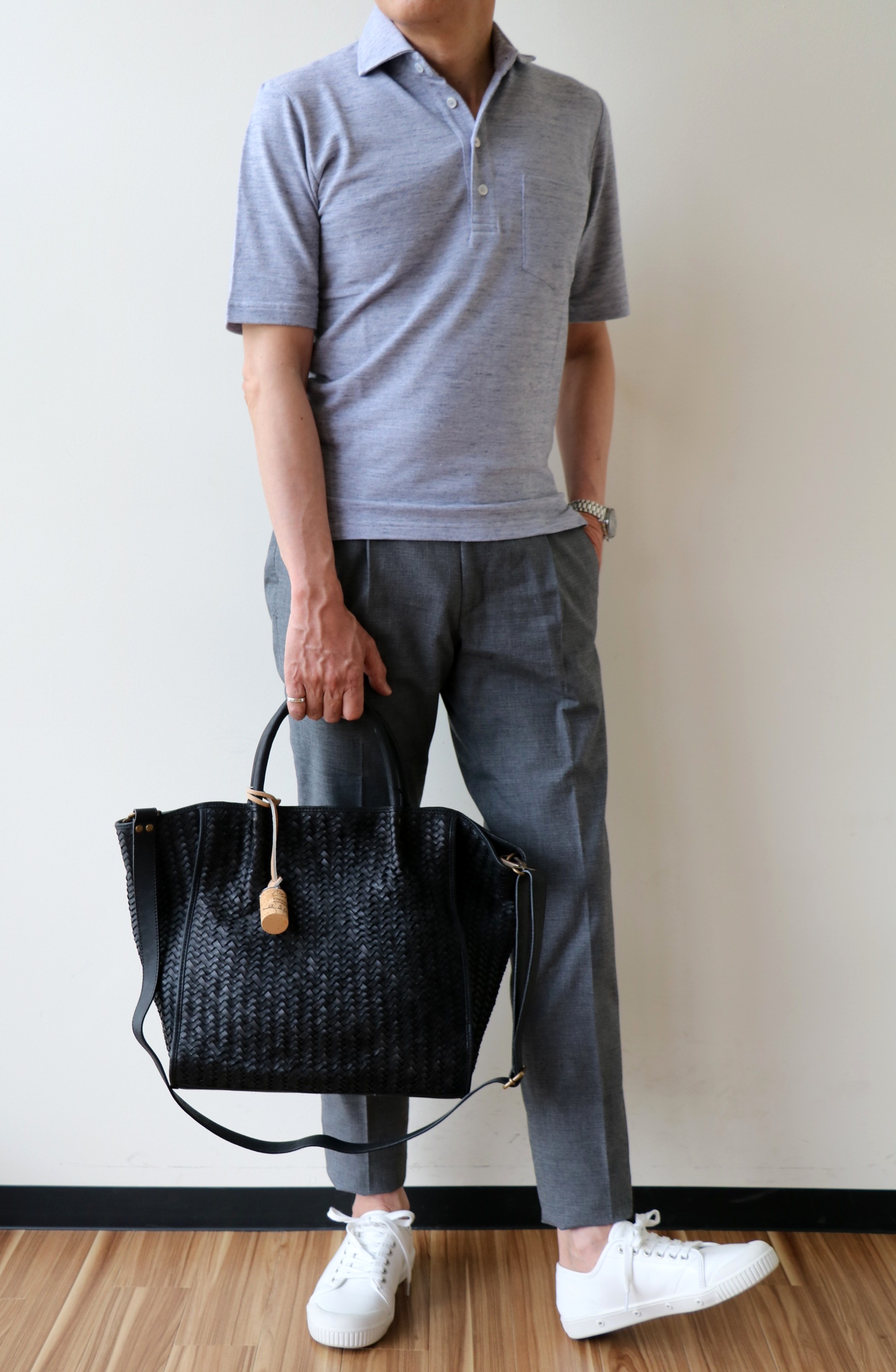 他に合わせるパンツがないのか...と指摘されそうですが、なんとなく本日の気分なんです。その代わり、小物で変化をつけておりますので、ご容赦ください。合わせたパンツは、説明の必要はありませんね。手に持ったバッグはTIBERIO FERRETTI(ティベリオ フェレッティ)の「Borsa」です。