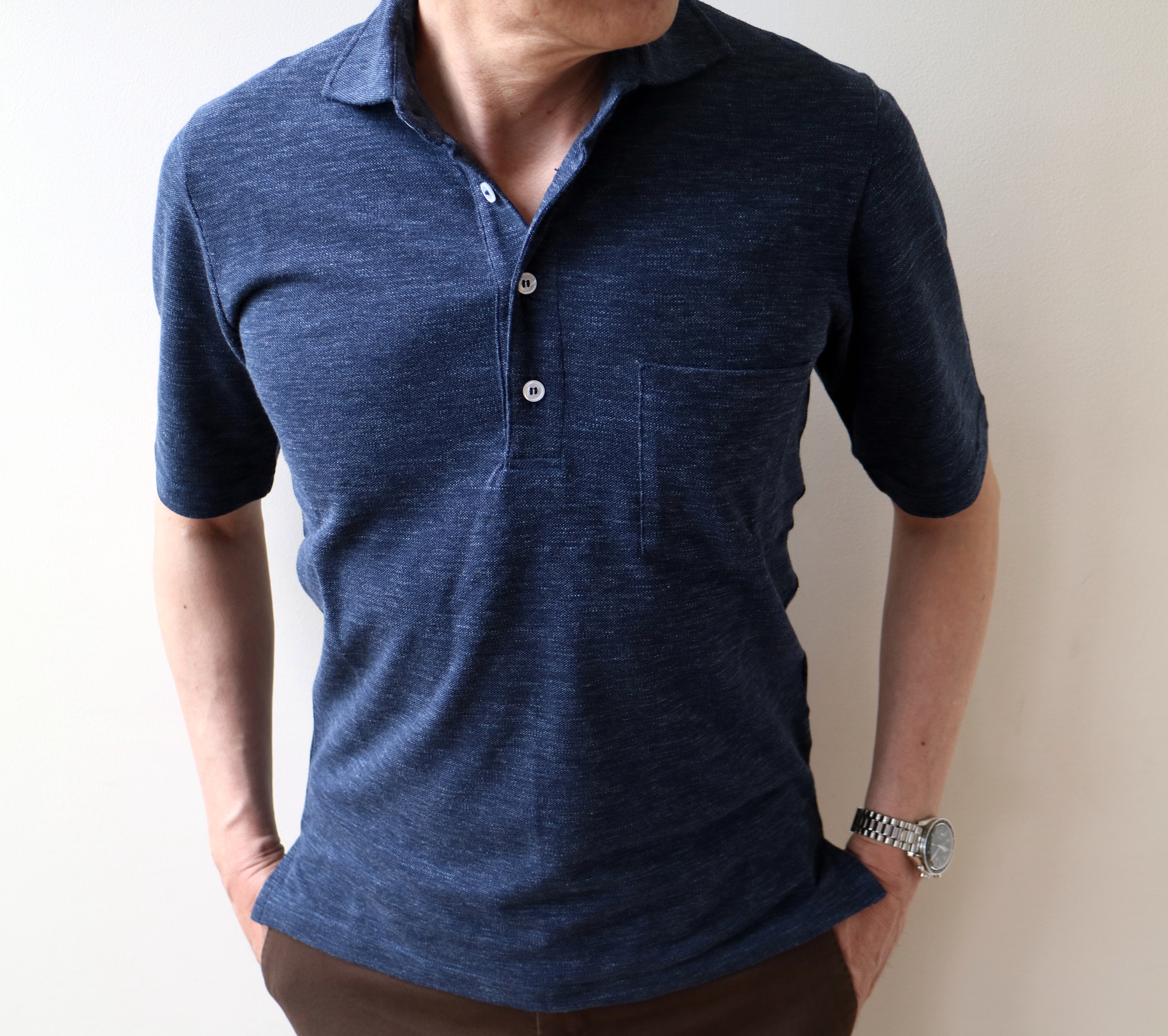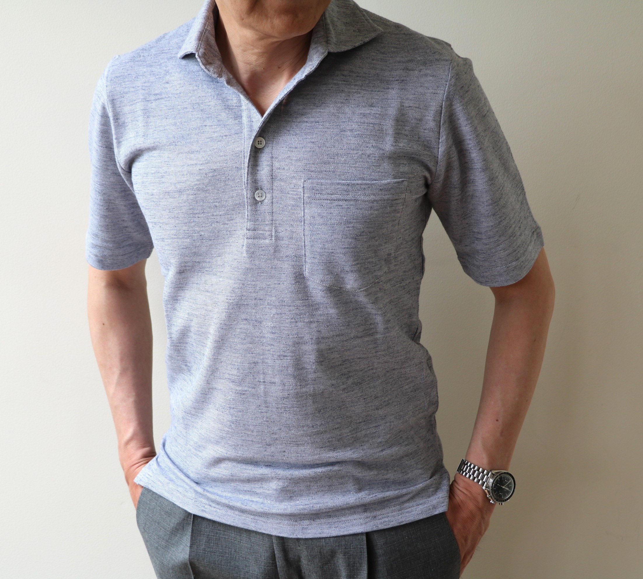 最上級のコットン、エジプト綿の「GIZA45」を使ったメランジの鹿の子織ポロシャツ。あの鹿の子特有のごわつきは皆無のしなやかな着心地です。ライトグレイというより青みのあるライトブルーグレイと、深みのあるインディゴブルーの2色展開です。