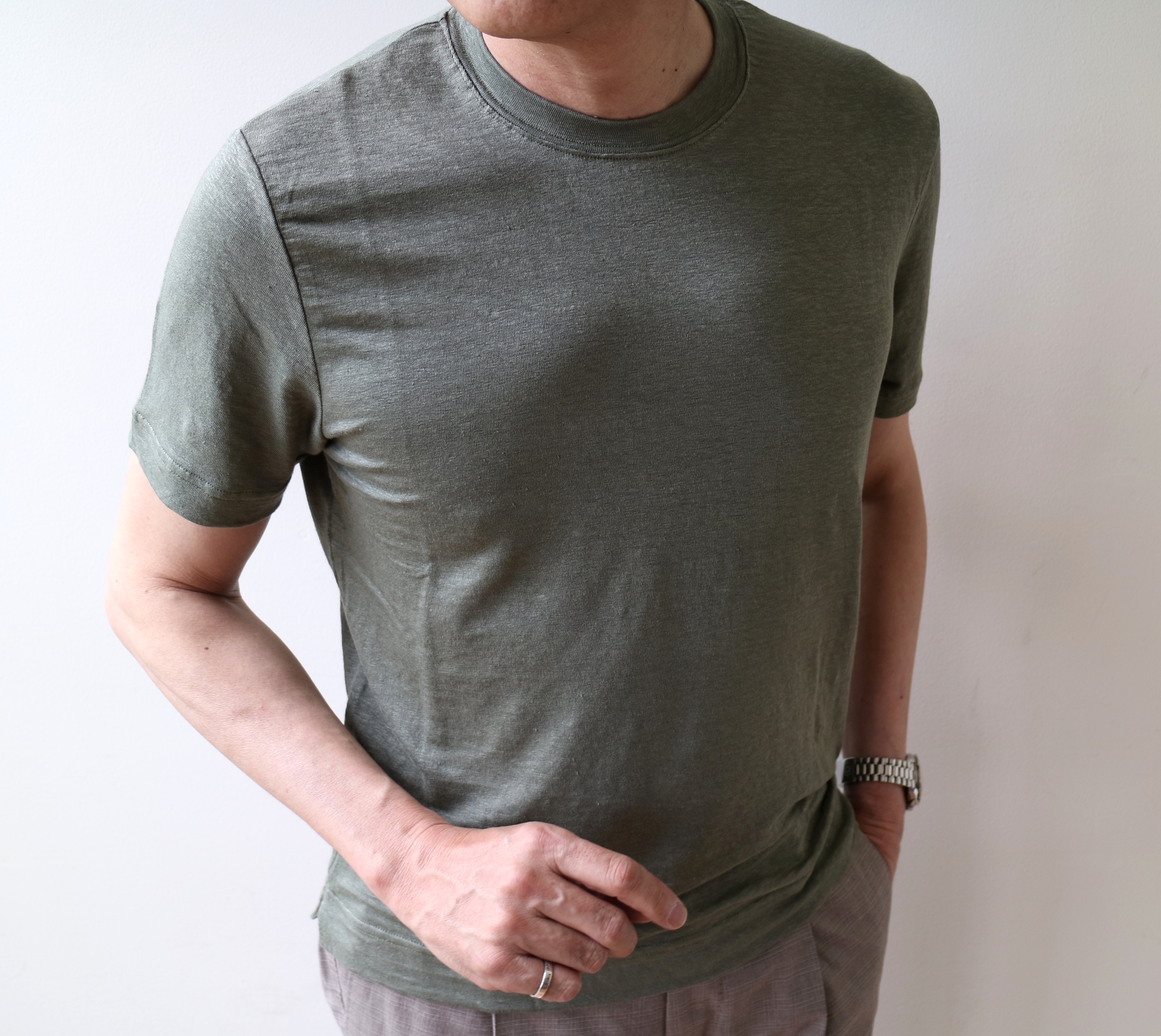 素材はリネン97%にポリウレタン3%。着るたびに、「着易い!!」を連発してしまうほどです。湿気の多くなるこれからの季節、Tシャツもリネンに替えたい、でも伸びないし...の問題を完全に解決してくれる半袖のラウンドネックTシャツです。カラーはオリーブ、ベージュ、ネイビー、そしてブラックの4色。コーディネートでご覧ください。