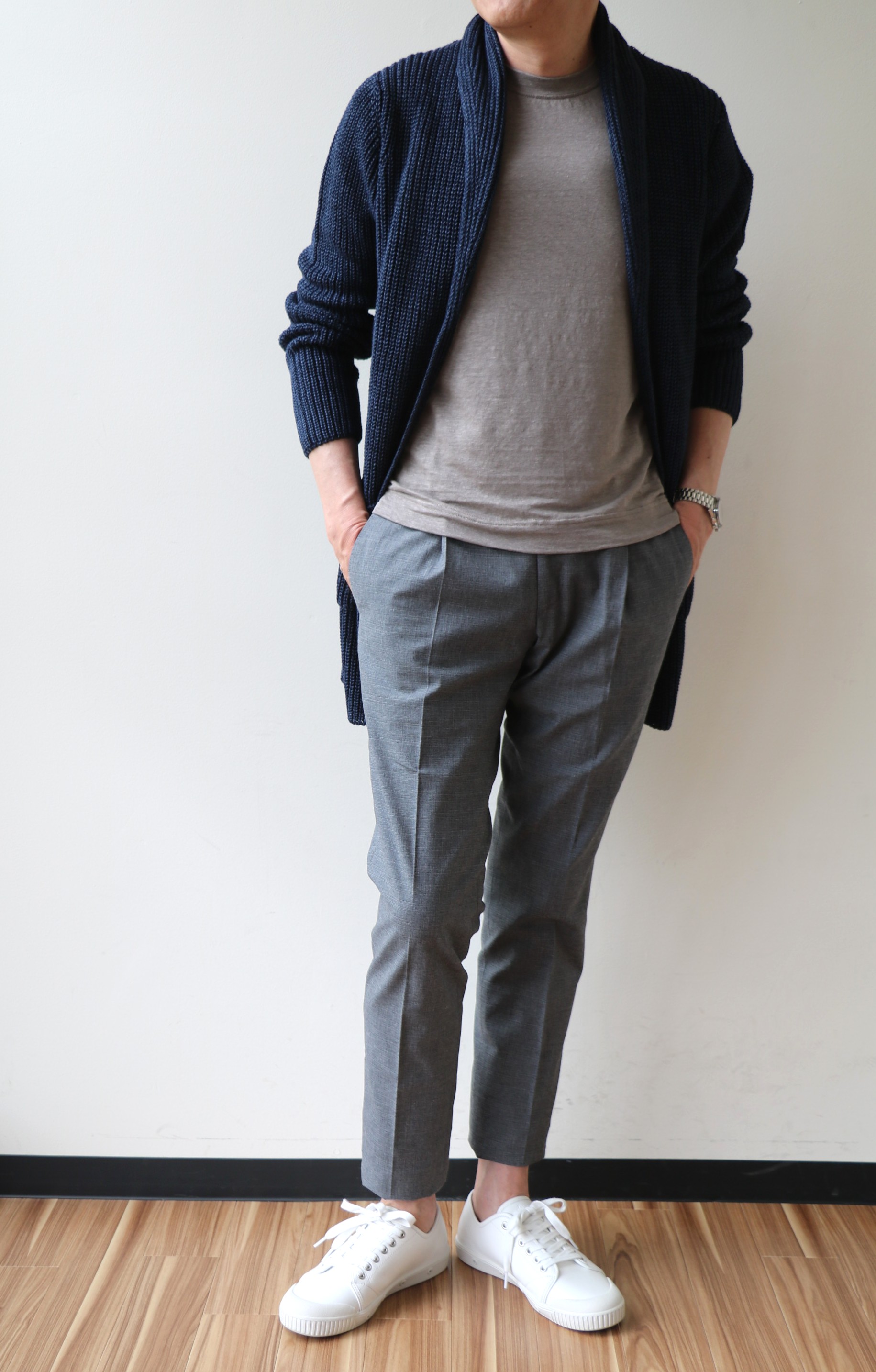 ベージュは、錆利休(さびりきゅう)という、渋みのある茶色。天下人"織田信長"と豊臣秀吉"に使えた千利休...いや、話が逸れました。同じくPT01(ピーティーゼロウーノ)の「ミニ柄コットンストレッチパンツ(グレイ)」を穿き、これもまたマガジーノから選び出したニットがPANICALE(パニカーレ)の「ロングカーディガン」。合わせやすい色だけに様々なシーンで活躍します。