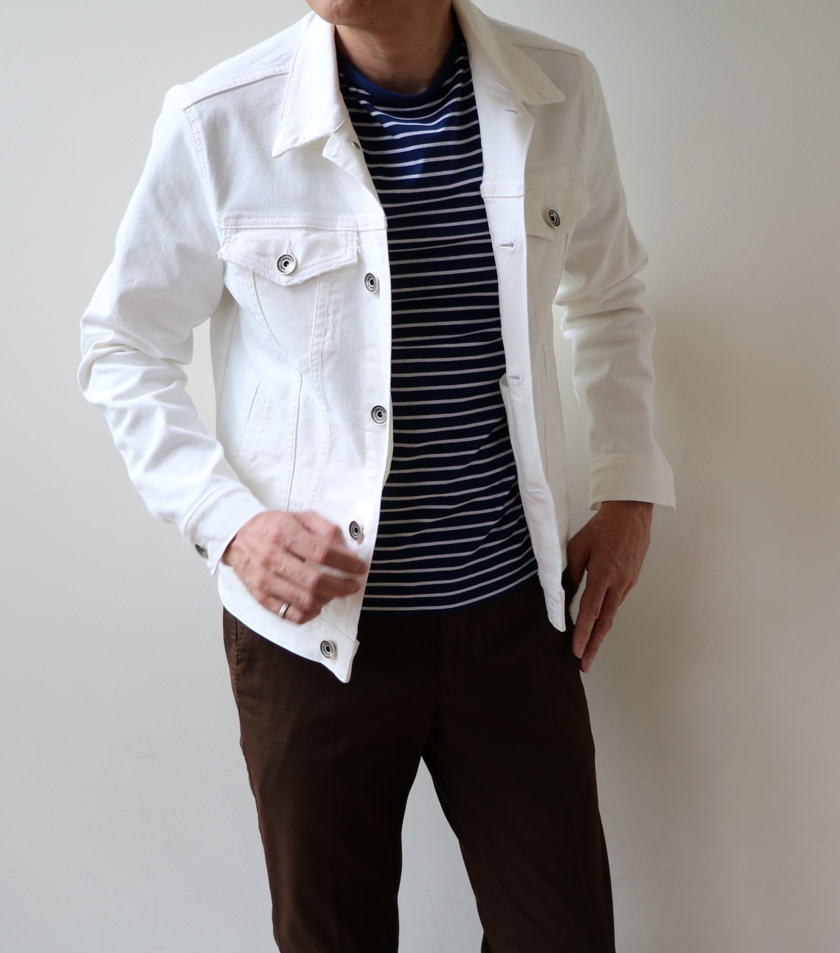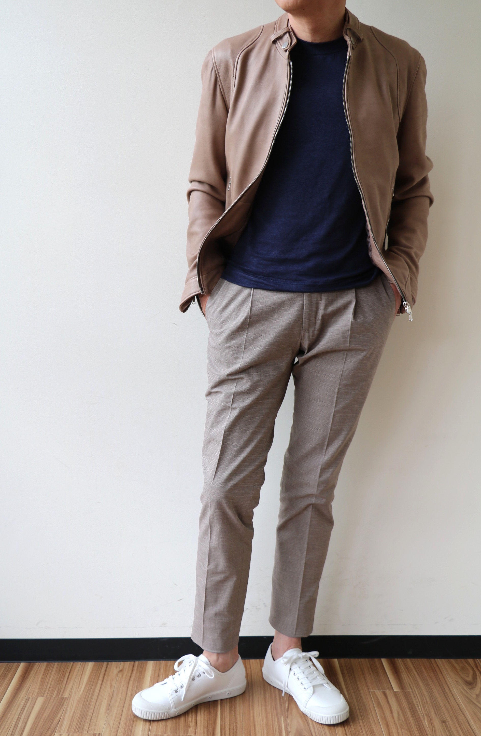 マガジーノの商材ばかり使ってはおられません。グローリーガイから持ってきたRadice(ラディーチェ)の「ラムナッパシングルライダース」に合わせたのは、ネイビー。パンツは同じくPT01(ピーティーゼロウーノ)の「ミニ柄コットンストレッチパンツ」。合わせやすいパンツです。