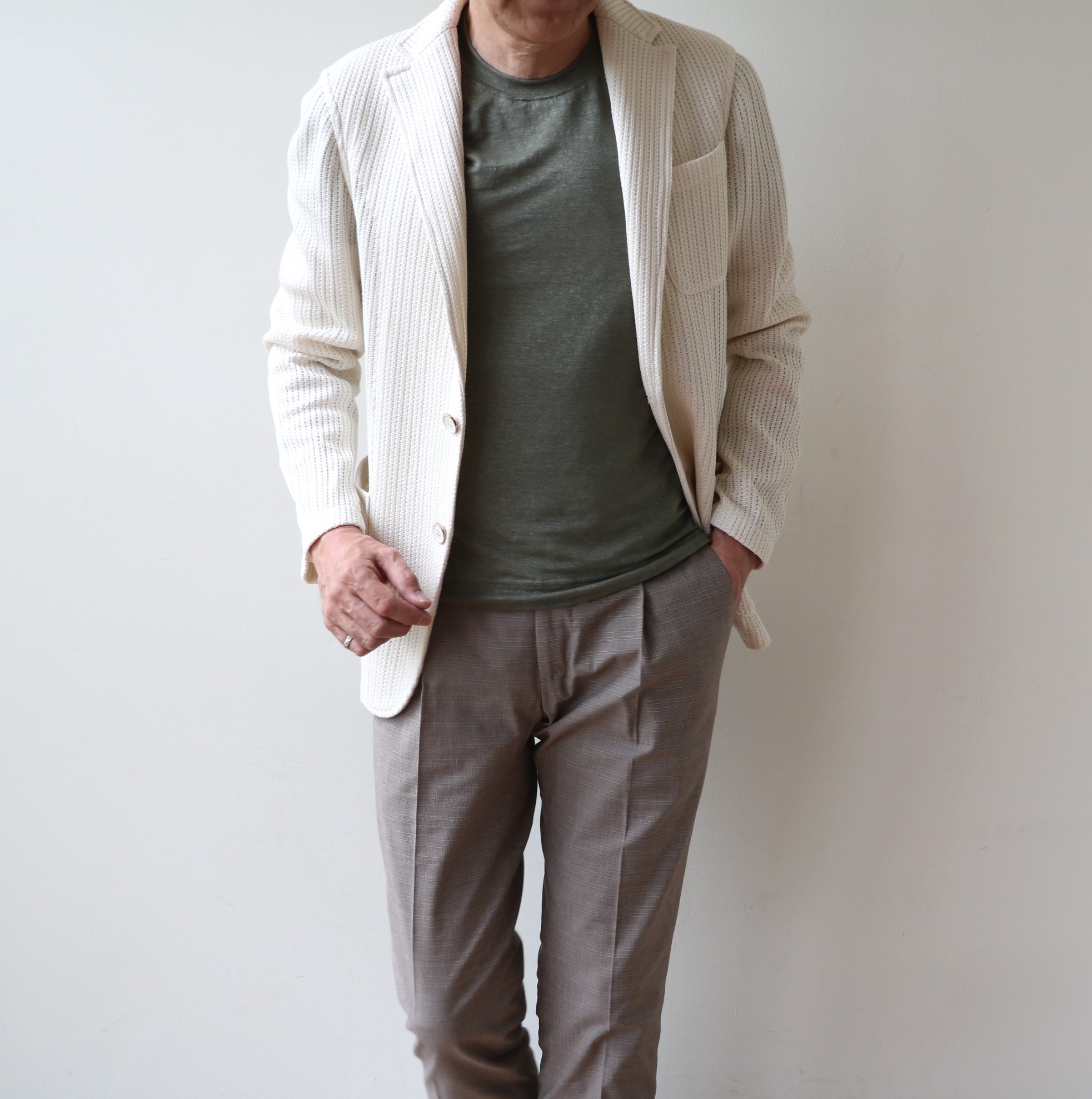 オリーブは、抹茶のような優しい香りがする落ち着きのある色合いです。強弱をつけずに全体を柔かくまとめてみました。パンツはPT01(ピーティーゼロウーノ)の「ミニ柄コットンストレッチパンツ」を合わせ、撮影場所のマガジーノの売り場からCOPPER(コッパー)の「コットンメッシュジャケット」を選び羽織ってみました。