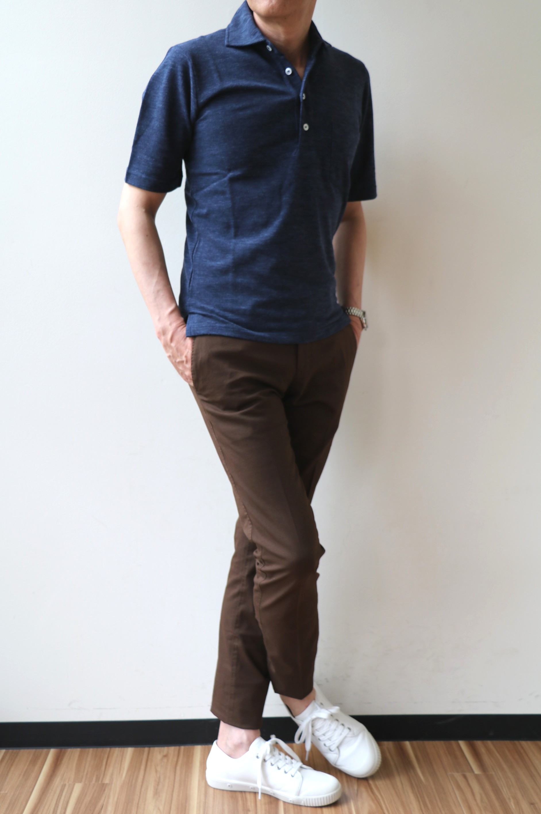 ようやくパンツが変わりました。合わせたのはPT01(ピーティーゼロウーノ)の「Spice Route」。インディゴブルーと焼けたブラウンが好相性です。細身のフォルムによって、裾の収まりがきれいです。お腹周りが気になる方でもナチュラルストレッチの利いた、しなやかな生地が優しく覆い隠してくれます。