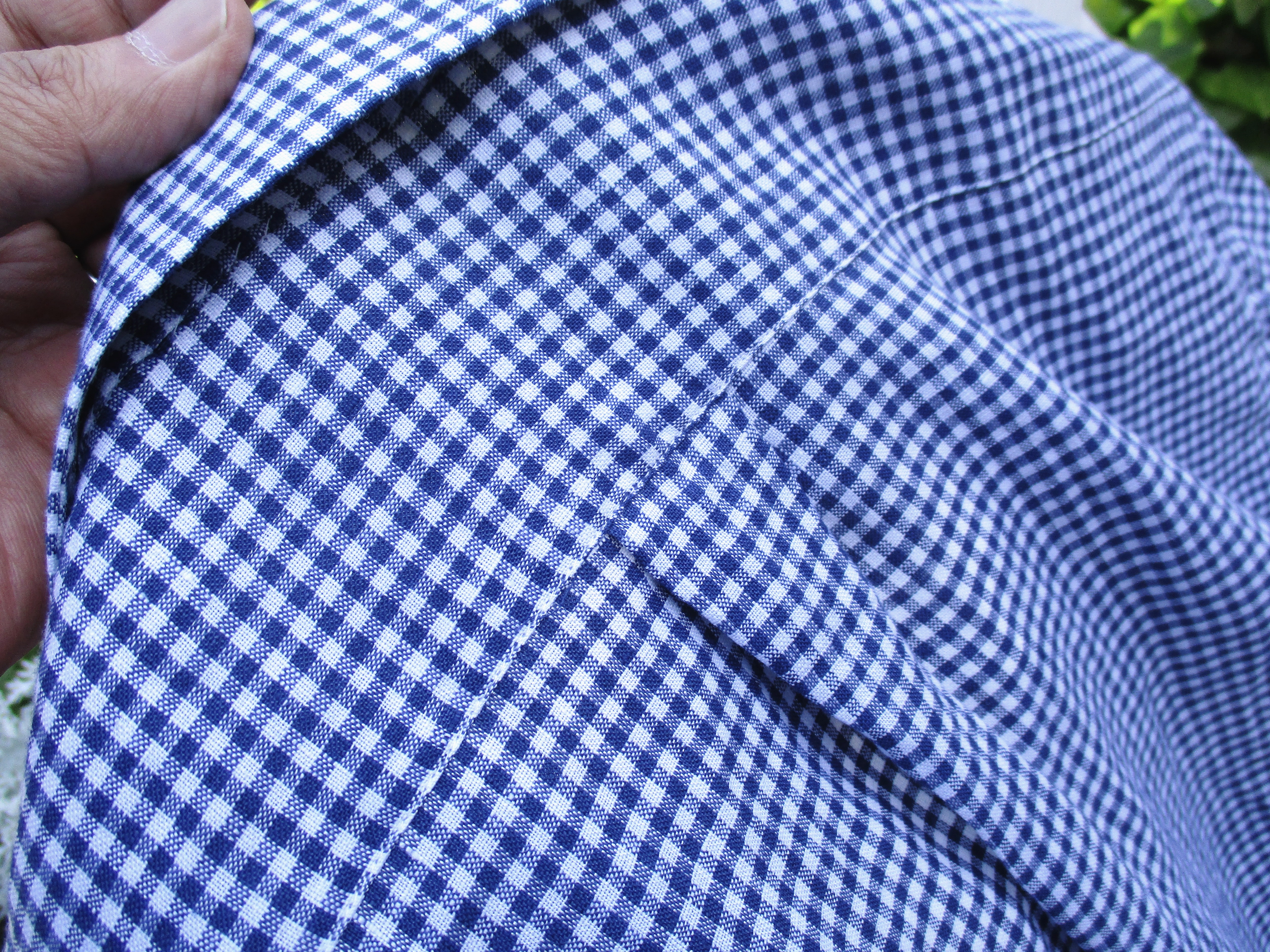 写真より、もう少し濃いネイビーになります。定番中の定番柄だけにロングスリーブでは敢えて敬遠しておりましたが、このモデルなら新鮮ではないでしょうか。さらっと無地のカーディガンを羽織り、脇に愛読書なんかを挟めば、知的に見える夏の装いになるはずです。背はボックスプリーツが更にマジメさを強調してくれます。