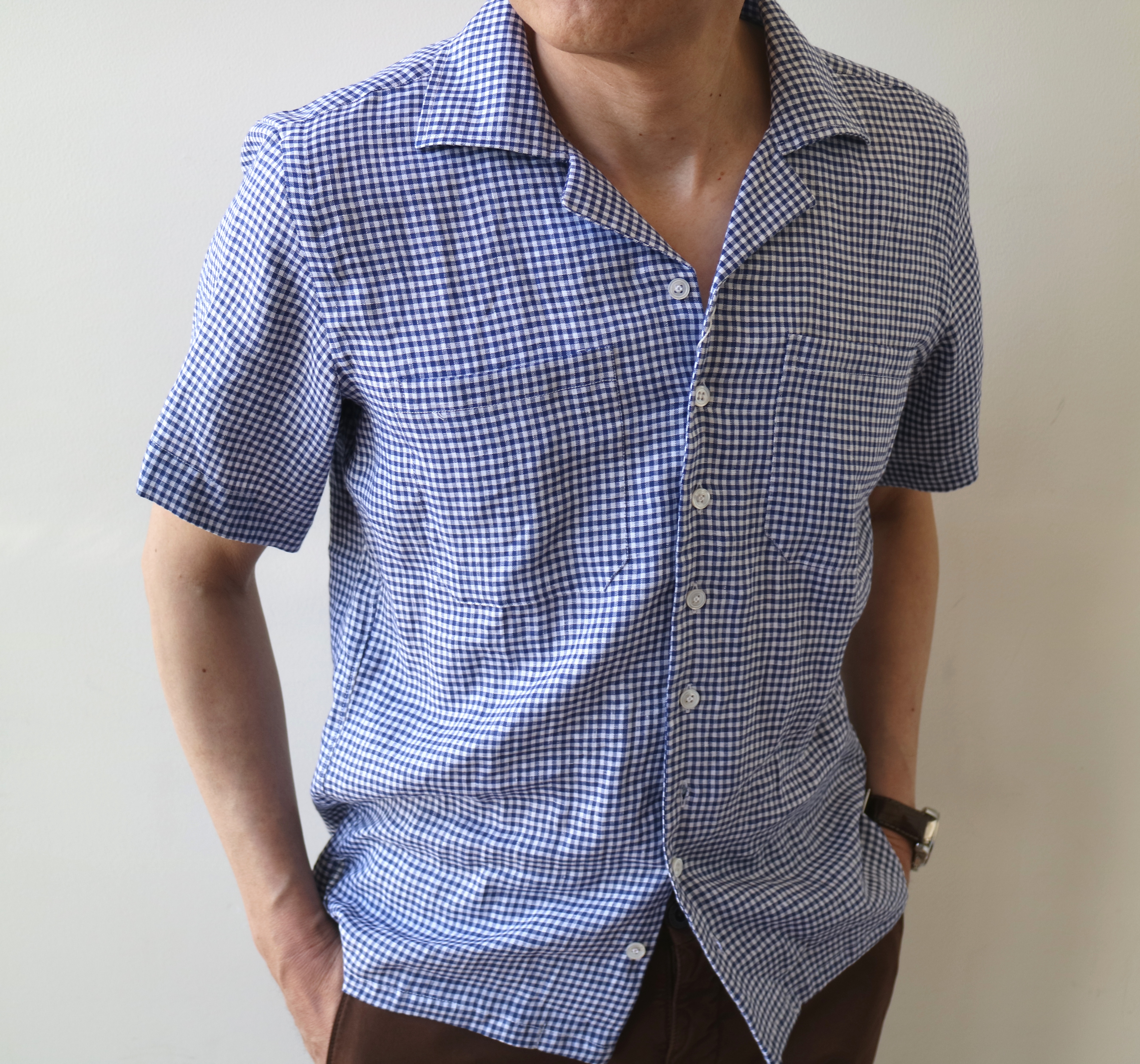 MODEL:リネンギンガムチェック柄オープンカラーシャツ