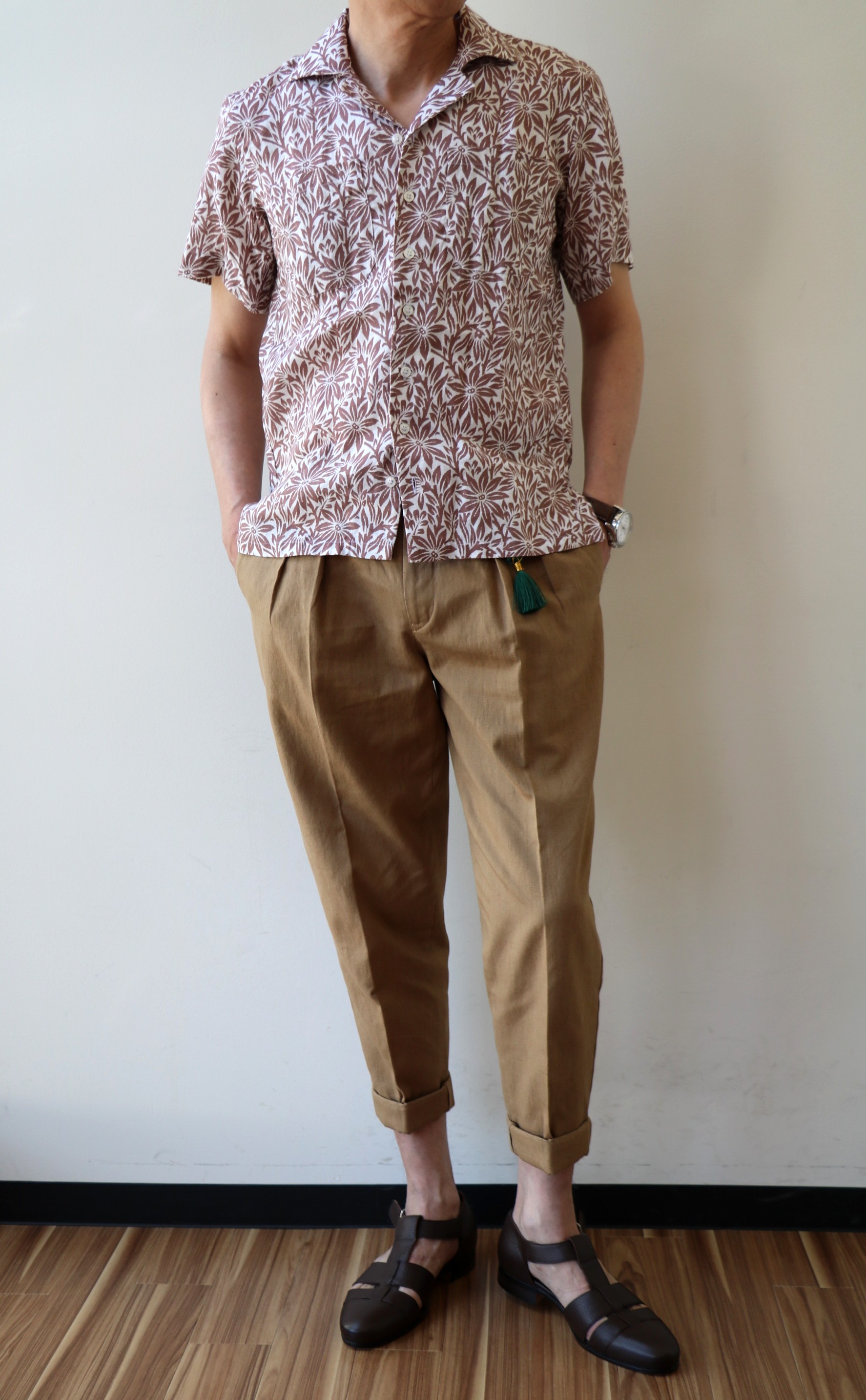 トロピカルな雰囲気をもつ花柄でもご用意しました。股上の深いパンツならタックインで。時には、羽織モノとしてTシャツの上にさらりと。単調になりがちな夏の装いに使い勝手の良い花柄です。