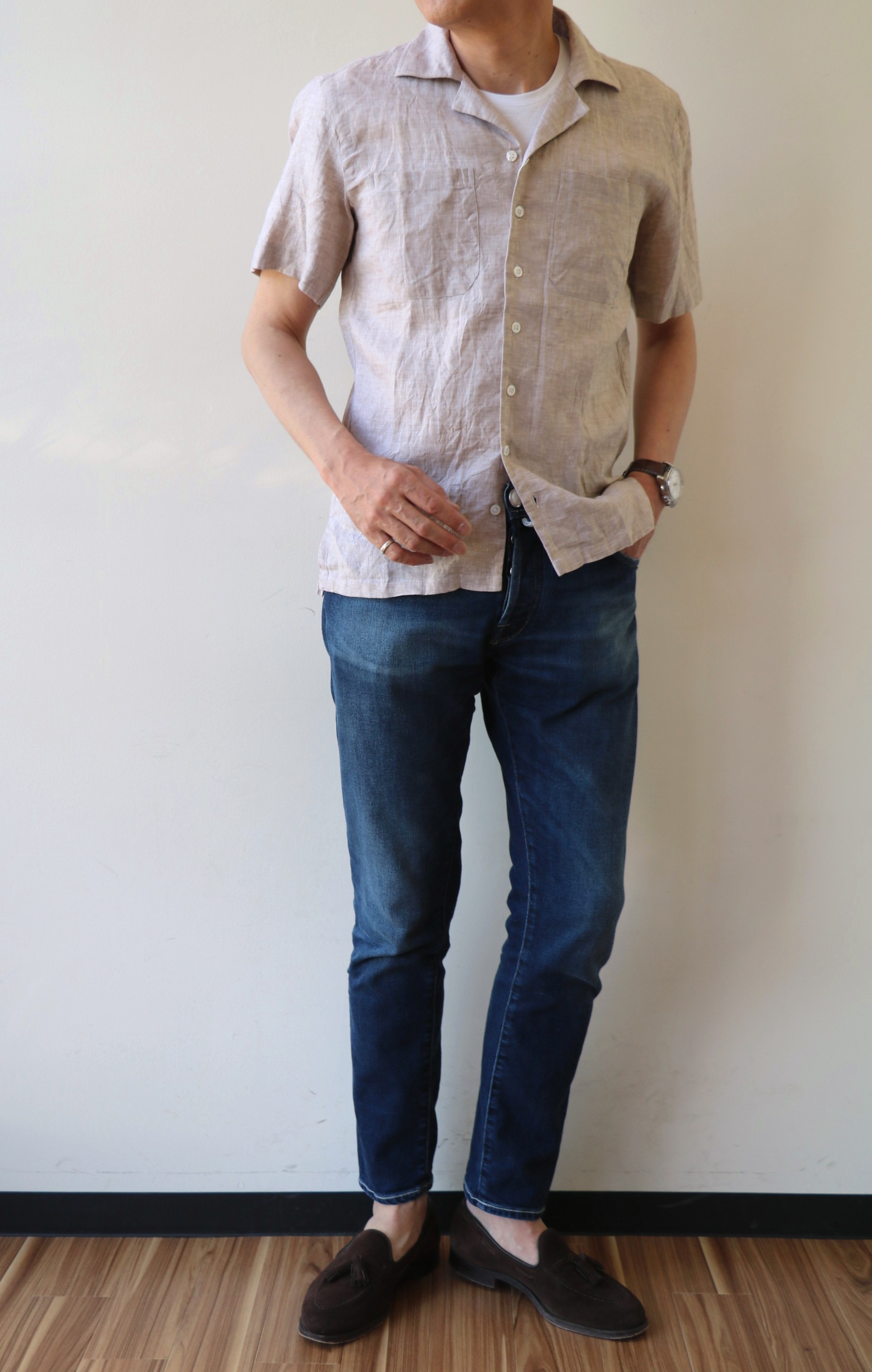 【Mario Muscariello/マリオ ムスカリエッロ】のサマーアイテムと言えば、イタリアのリゾート地・カプリ島をイメージしたカプリシャツですが、まずは、麻の開襟シャツからです。スマートに言えば、リネンのオープンカラーシャツ。こなれ感が、今の空気にピッタリな、そんなラフなシャツです。
