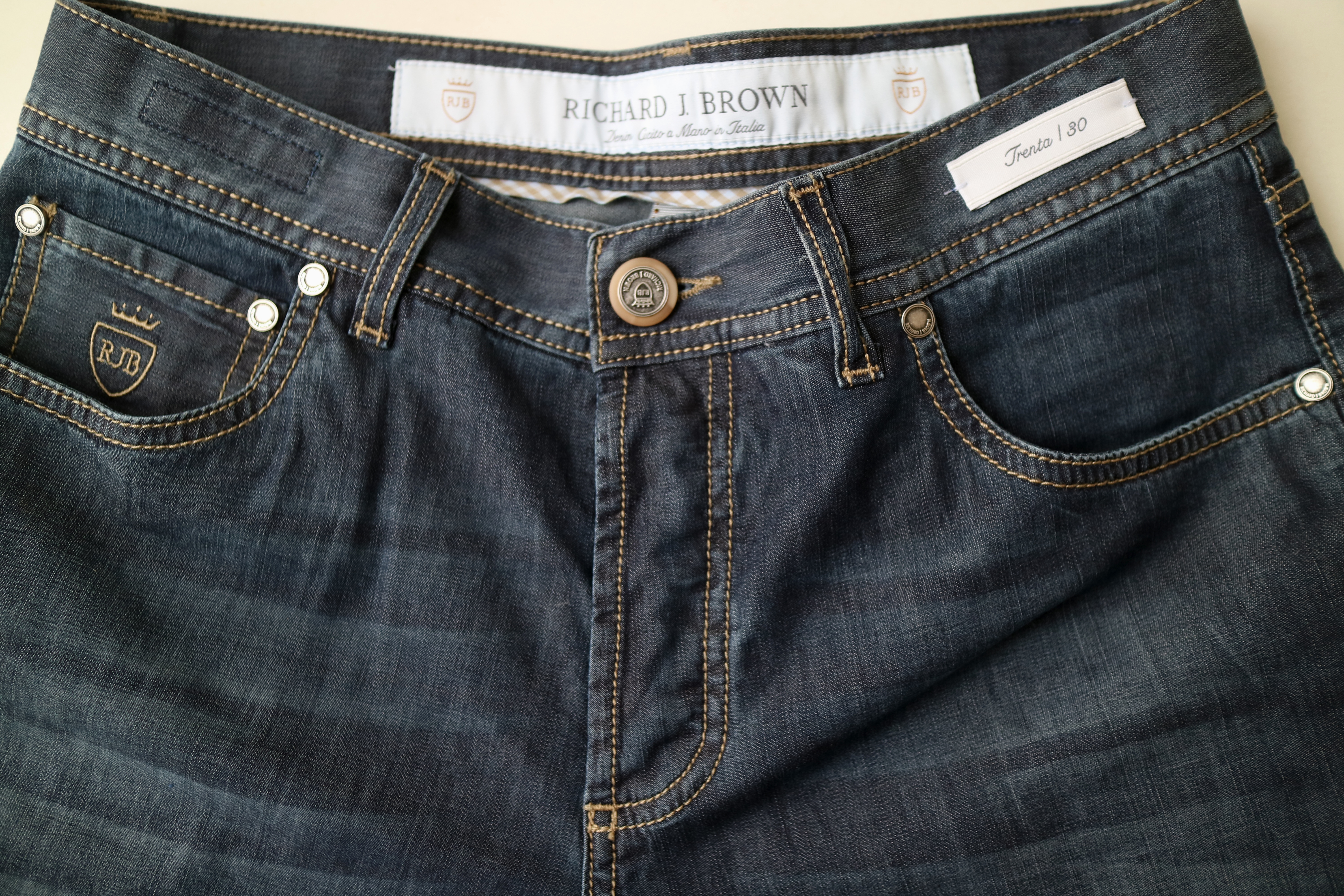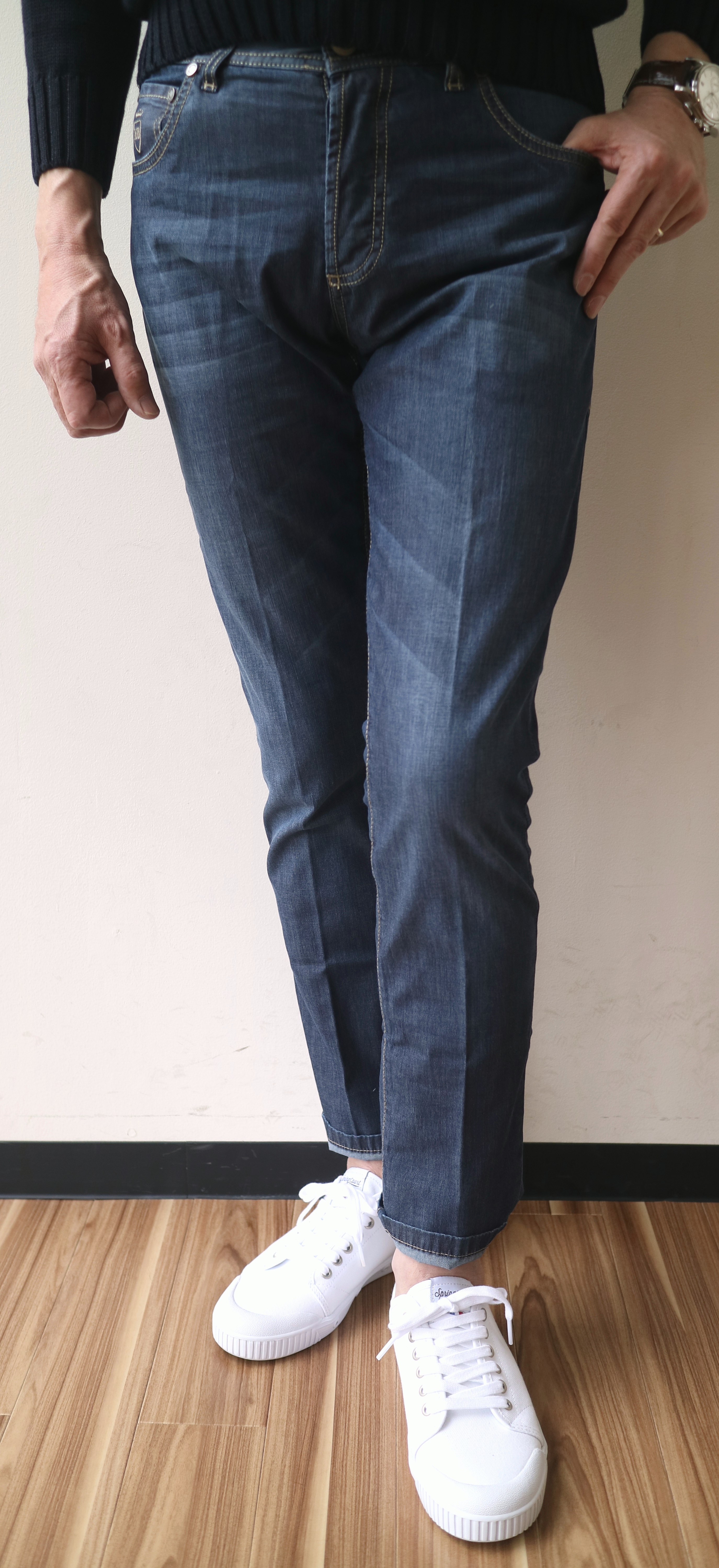 ところで、オンス(OZ)って何?と言われる方も意外と多いかと思いますので、簡単に。1平方ヤード(0.84平方メートル)あたりの生地の重さを表す時に使われます。厚みではなく、重さなんです。1平方ヤードで約28.3グラムになります。一般的に使われているジーンズは、12オンスから14オンスでしょうか。適度な厚みがあり、長いシーズン穿けますが、真夏は辛いですね。そこでライトオンスの登場です。ご用意させていただいたのは、イタリア・ミラノ発のデニムブランド【RICHARD J.BROWN/リチャード ジェイ ブラウン】。中でもおススメなのが、上の写真の2本なんです。