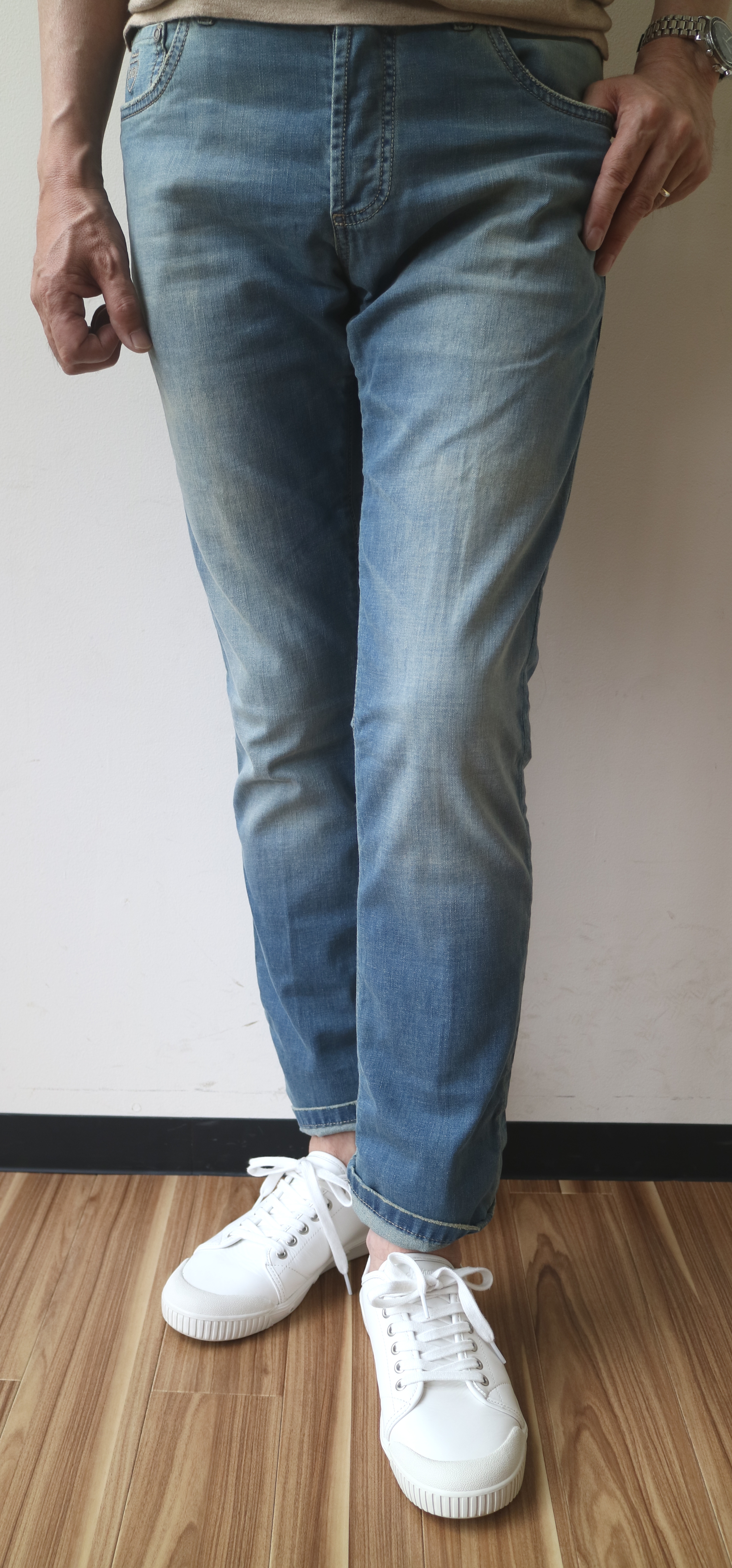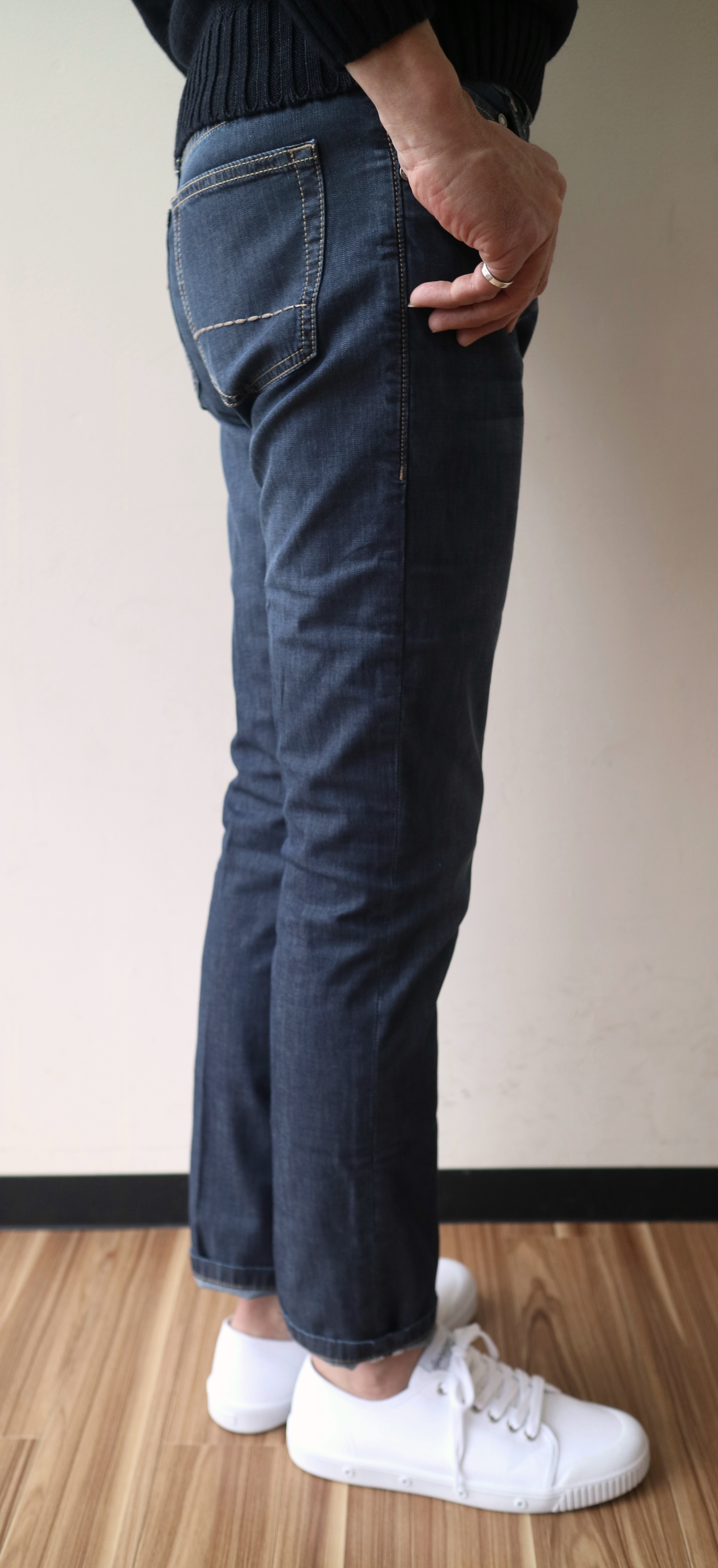 午前中、撮影をしたのが、上の写真2枚。スポーツ観戦に...というのは、前置きとのこじつけですが、ジャケットでもTシャツでも、どんなアイテムとも合い、気を使わずに穿けるパンツといえば、やはりデニムパンツことジーンズです。スポーツ観戦に限らず、休日にも穿く機会は多く、旅にも最適。ただ、これからの気温の上がる季節に敬遠してしまうのは、オンスに問題があるからです。