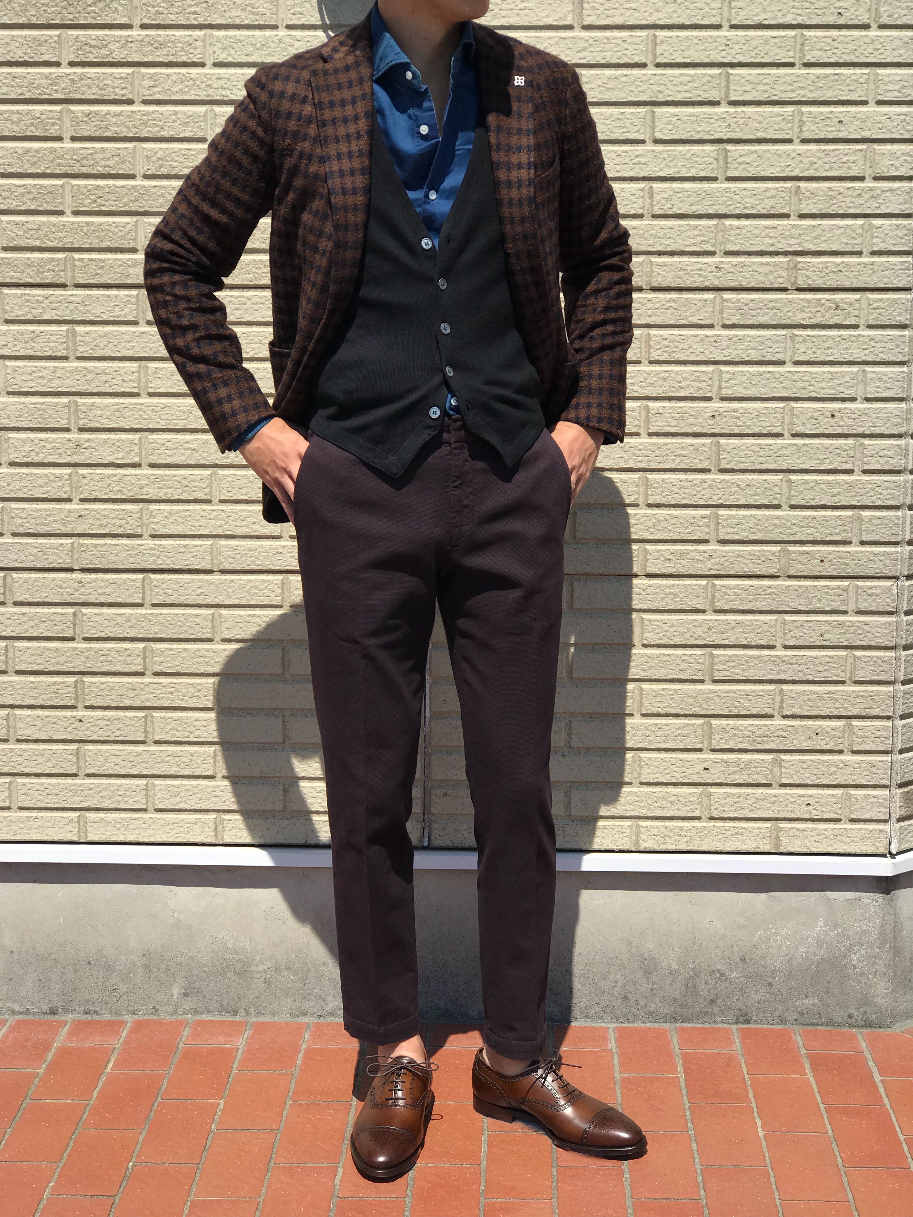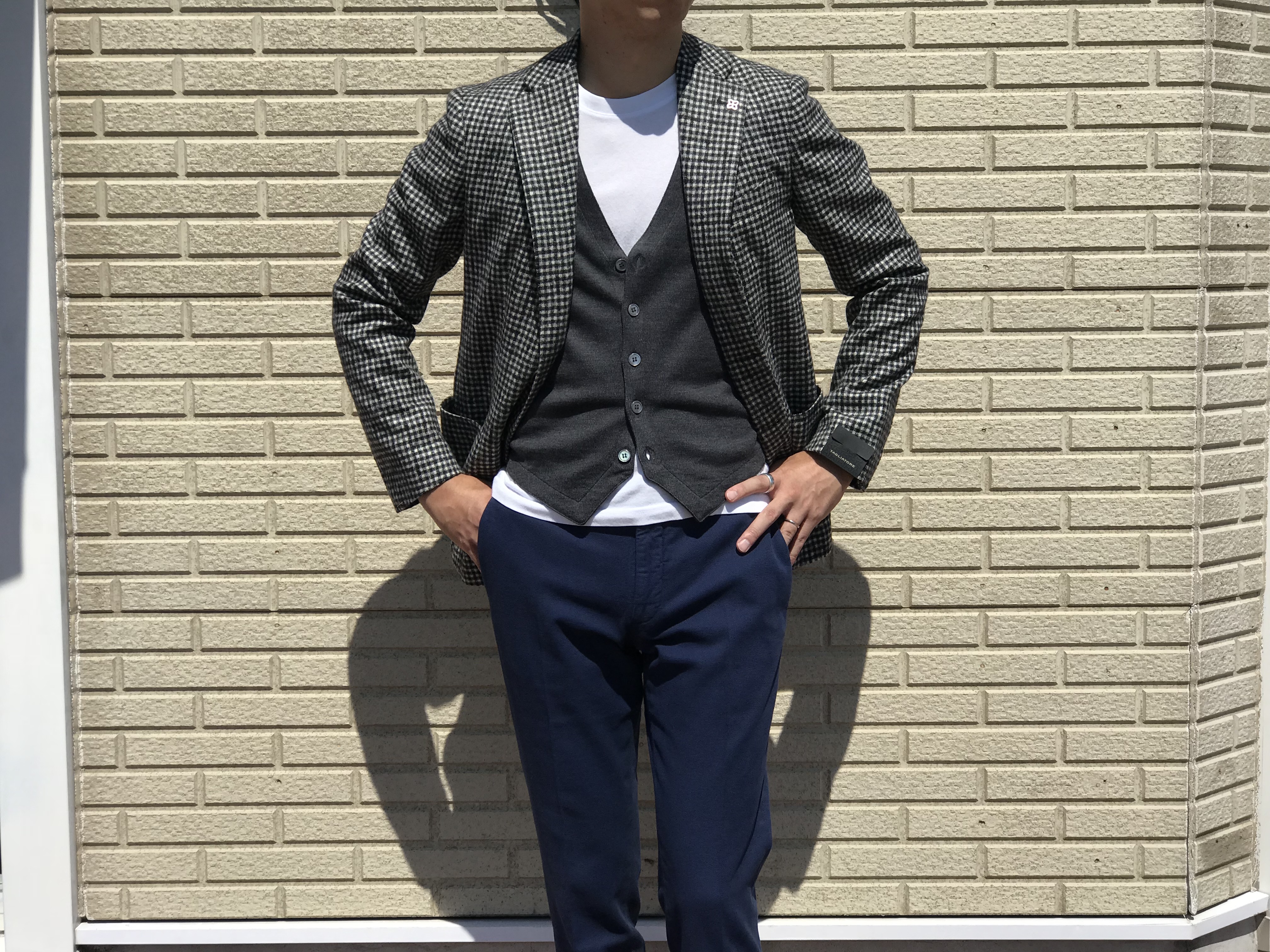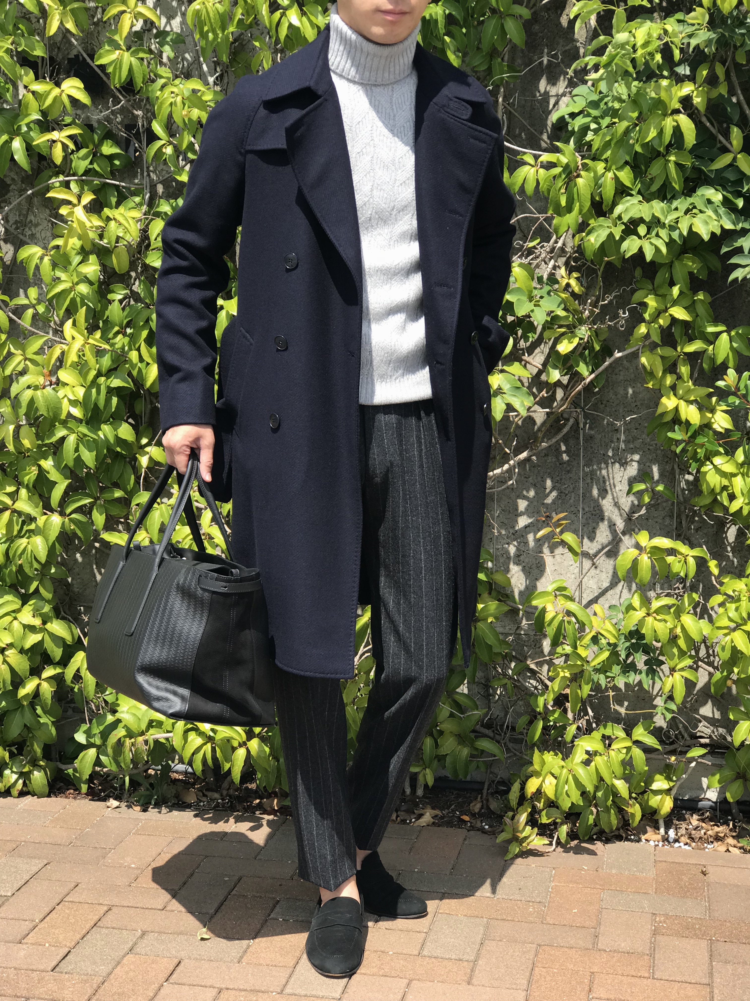 モデルは身長180㎝、体重67kg、胸囲94㎝で、サイズ46を着用しております。合わせたニットはJOHN SMEDLEY、パンツはRICHARD J.BROWN、バッグはZANELLATO、靴はParabootです。