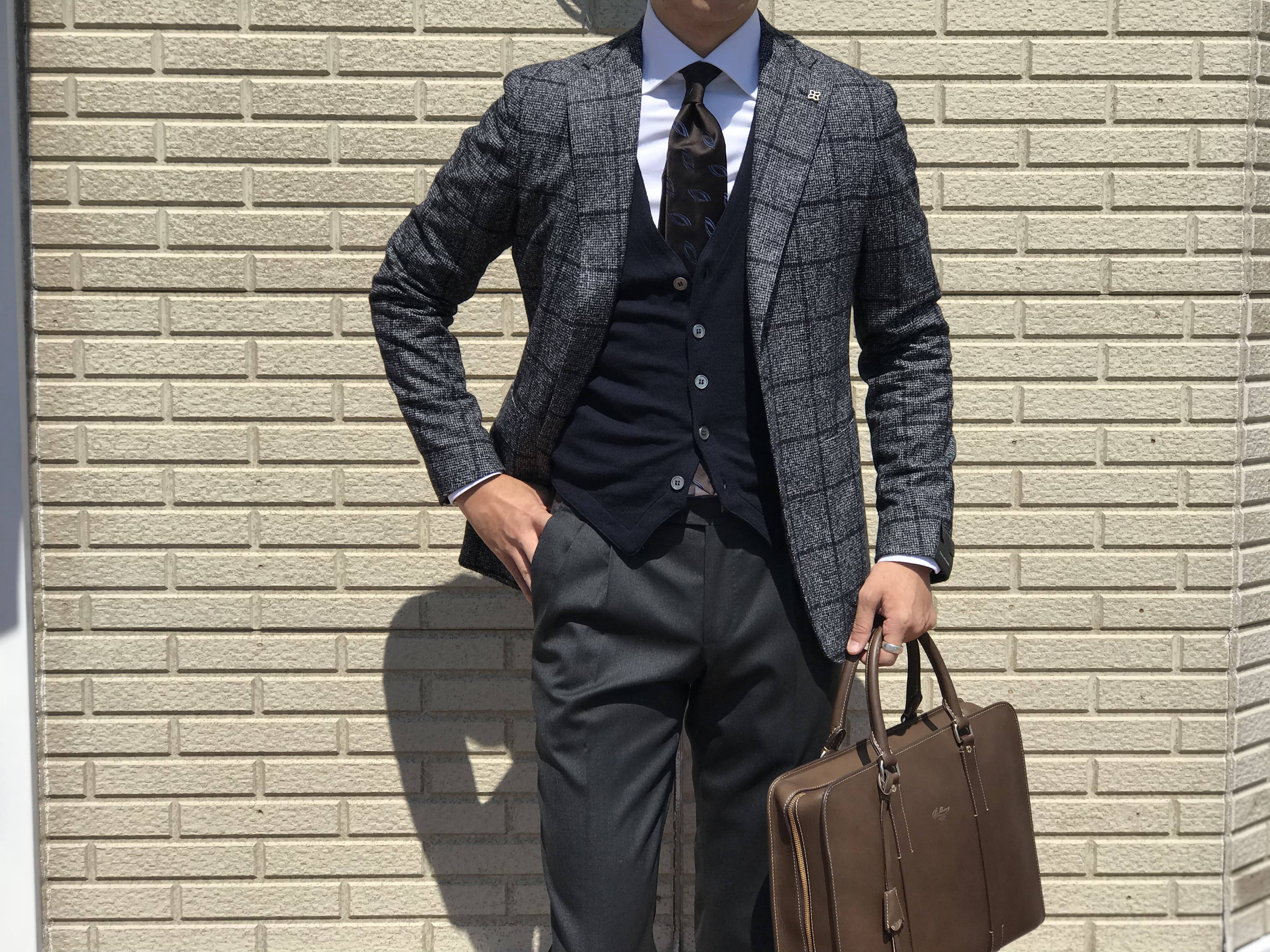 精悍な表情に見る安心感と落ち着き。ビジネスシーンでは、ネイビーのコーディネート力は絶大です。TAGLIATOREのジャケットに Holliday&Brownのネクタイを合わせ、パンツはINCOTEXにバッグはBoldrini SELLERIAです。