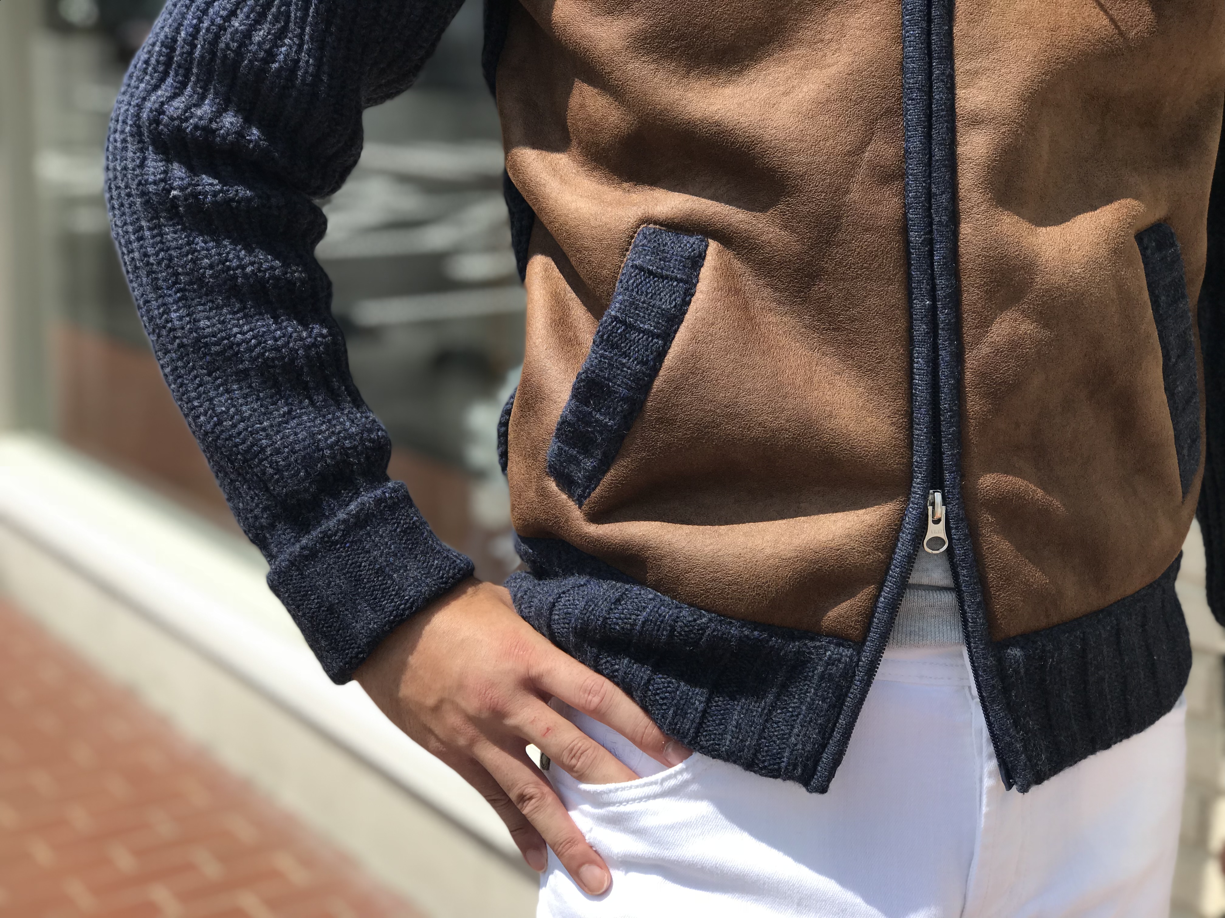 まずご案内するのは、豊富なデザイン力から生まれたブルゾンタイプ。ニットブランドとしては珍しく、前身頃にフェイクムートン(合成皮革)を掛け合わせたコンビデザインです。