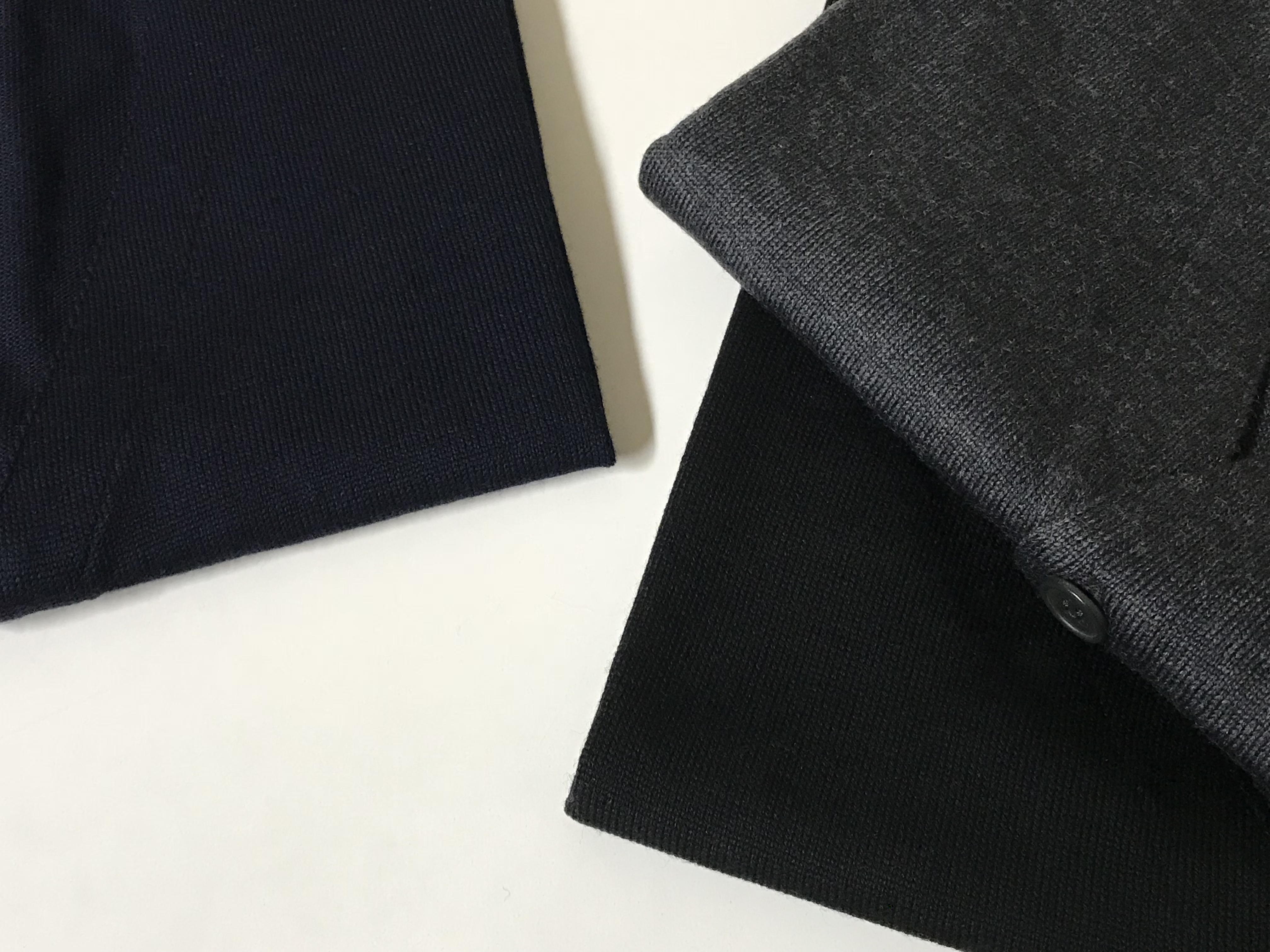 セレクトカラーは、ネイビー・ミディアムグレイ・ブラックのベーシックカラー3色。表面に毛羽はなく、ソリッドな表情と裾のデザインがシャープな印象を与えてくれます。