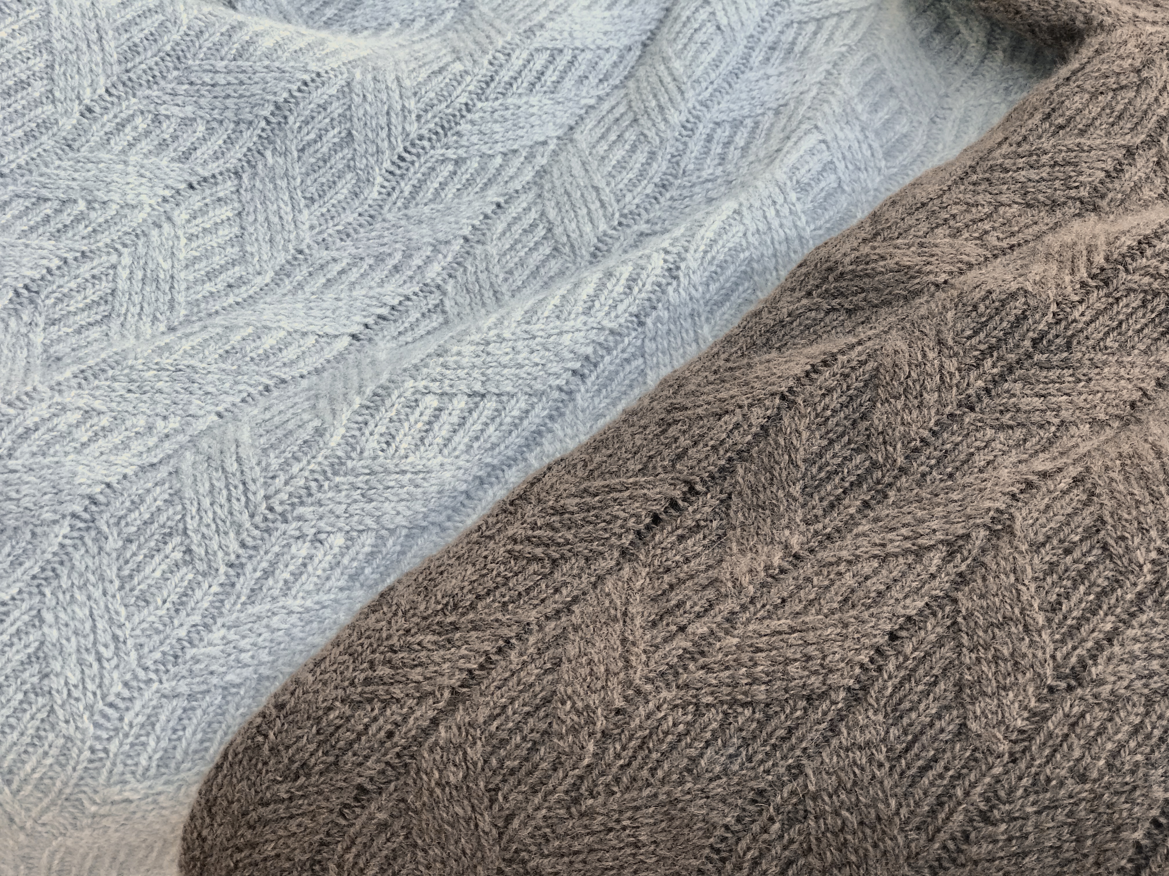 カラーは、シルバーグレイとモカブラウンの2色。編み地にはそれほど凹凸の差はないので、素朴なカントリー調ではなく、スッキリとした都会的な印象です。