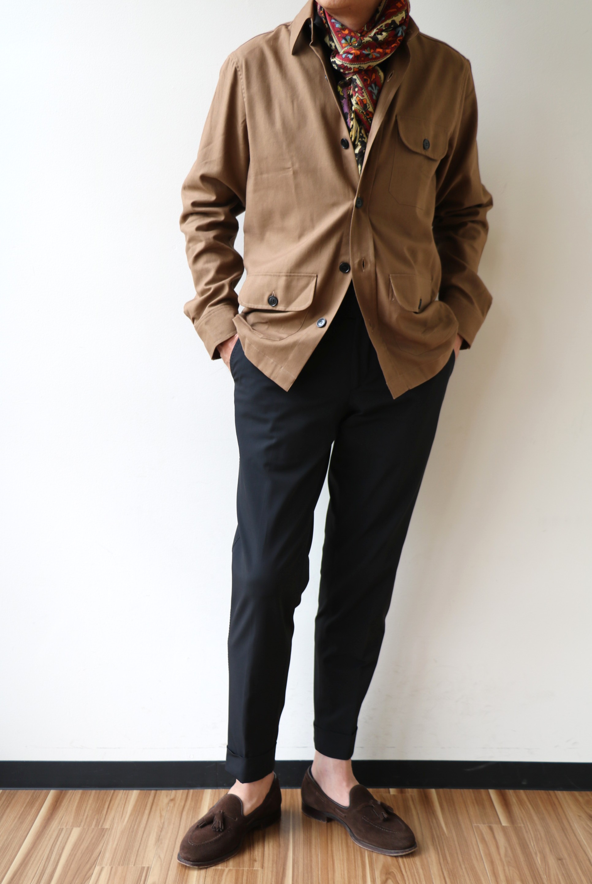 素材は、アルビニ社のコットン・ウール。光沢のあるウールを混ぜることで、上品な表情になります。また、キャメルとネイビーの伝統カラーが、上手く素材に溶け込んで、都会的な雰囲気を醸しだしています。