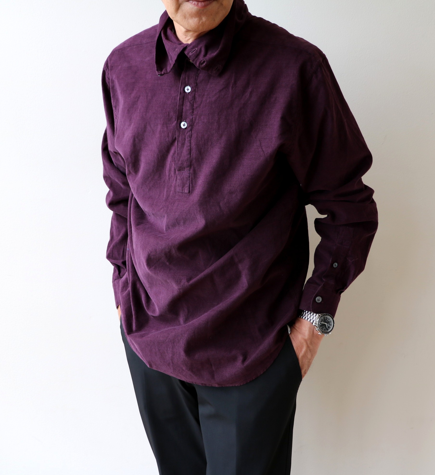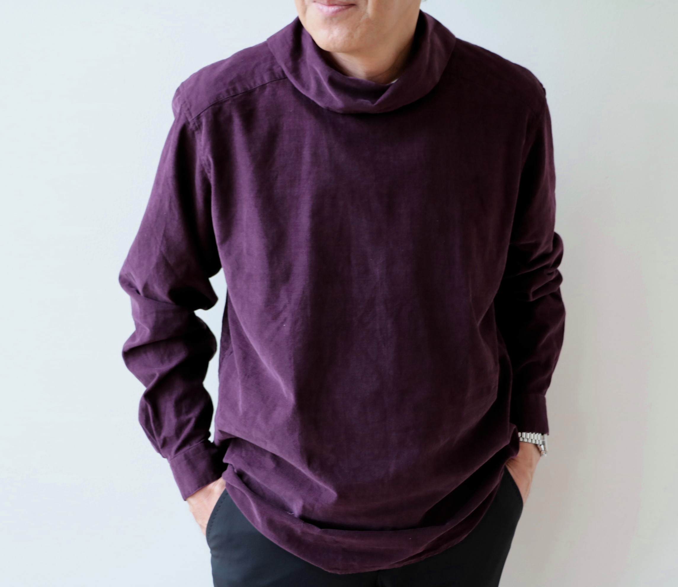 コットン100%の細コールで選んだのは、深みのあるボルドーとブラック。オフタートルのようなA面と、襟付きシャツのような着方ができるB面。個性的な襟元と、ゆったりとしたフォルムが特徴のモデル「NECK_K」。着方は、自由自在です。
