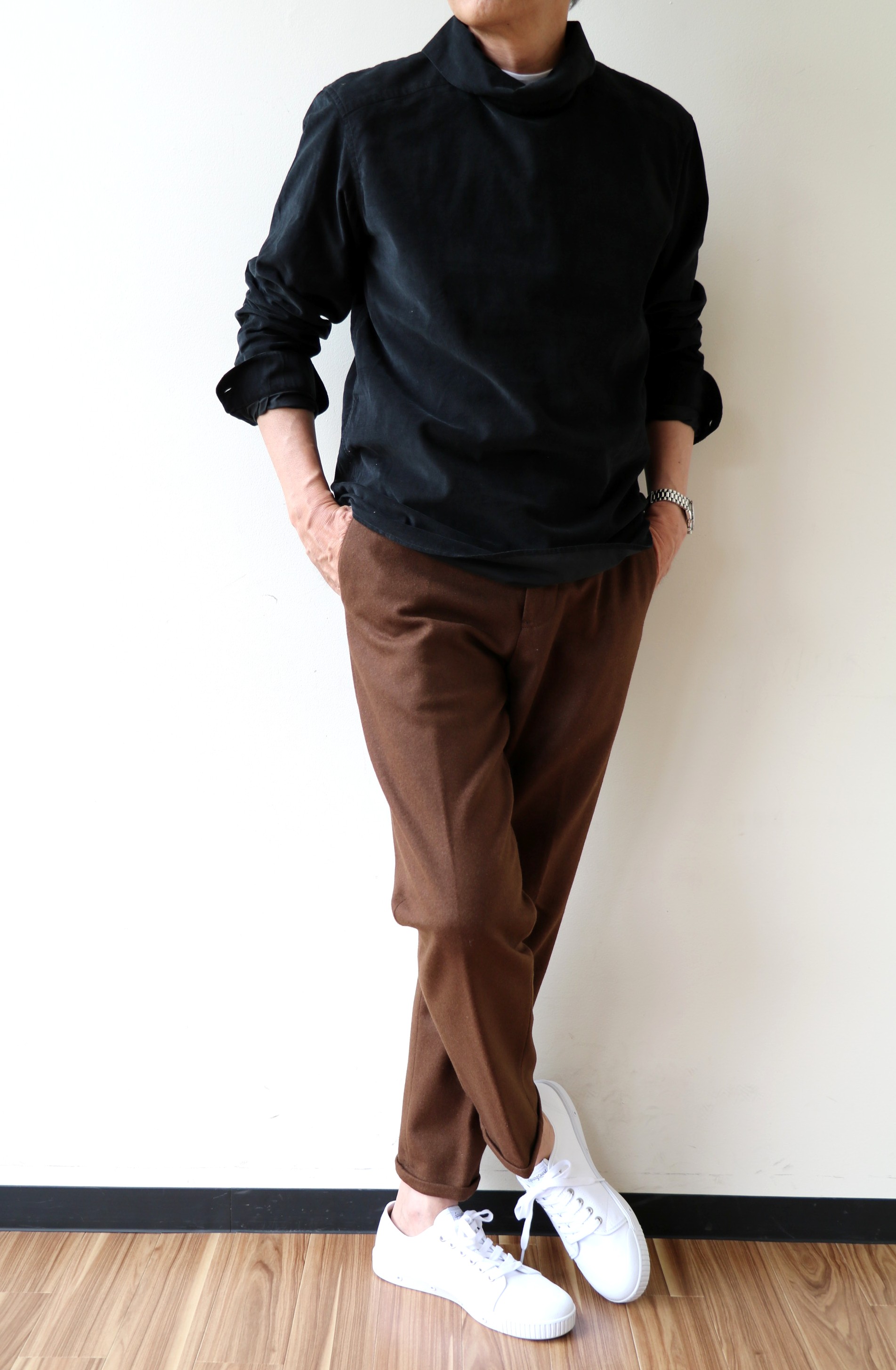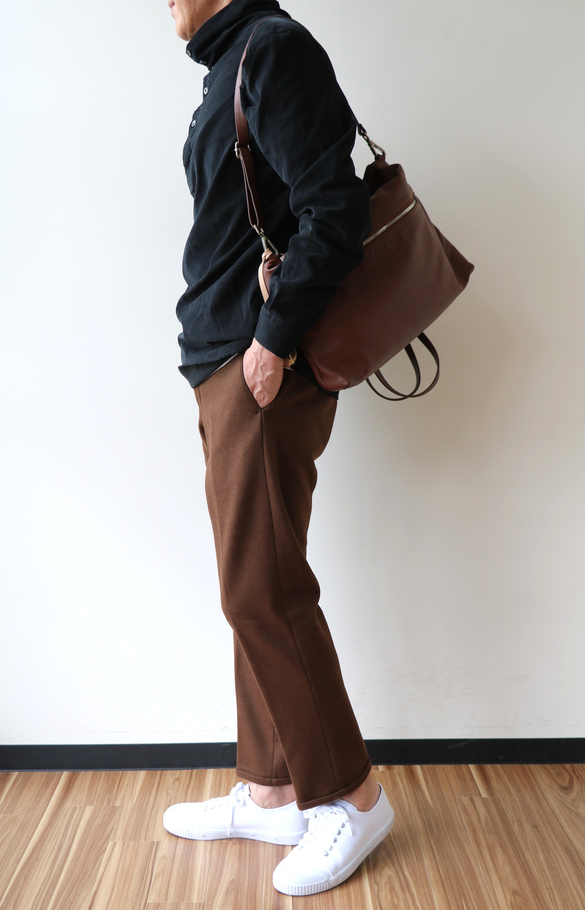 ボルドーで合わせたパンツは、再入荷予定のBorelio/ボレリオ、靴はPantofola d'Oro/パントフォラ ドーロ。ブラックで合わせたパンツはPT01/ピーティーゼロウーノ、靴はSpring Court/スプリングコート、バッグはDE'.CO.CA/デーコカです。