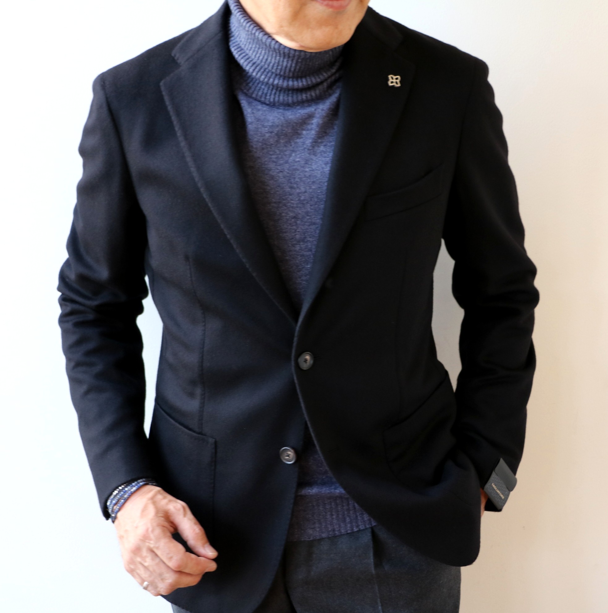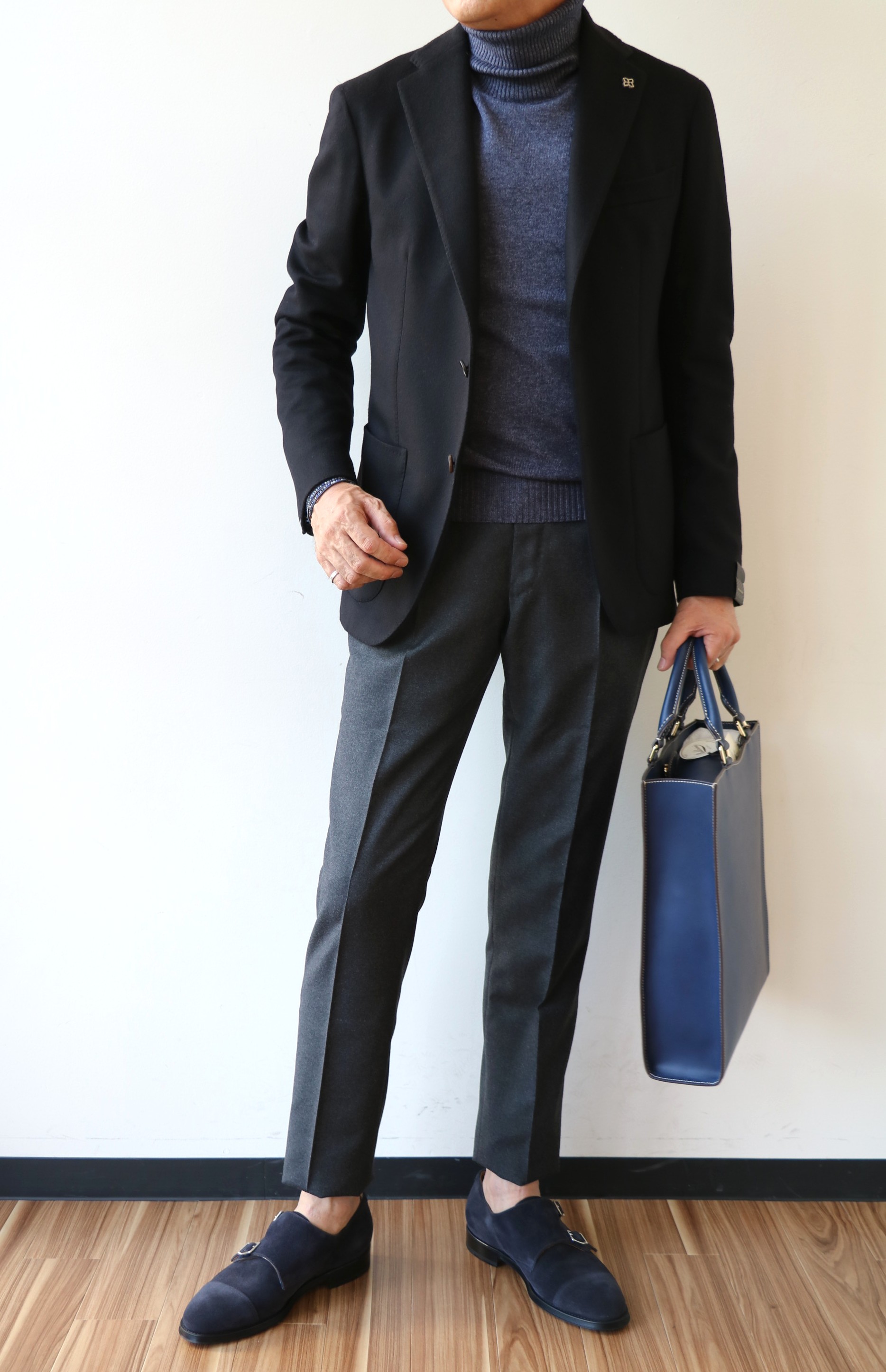 ネイビー中心のコーディネートに、ブラックを落とし込んで見ました。以前なら、ネイビーを、例えば、昨年大人気であり、今季もセレクトしているカシミア100%のダブルブレストを合わせていたのでしょうが、よりモダンに見せるため、ブラックを使ってみました。こちらもカシミア100%。ブラック人気は年々高まるばかり。もしかすると、ネイビーより注目されているかもしれませんね。
