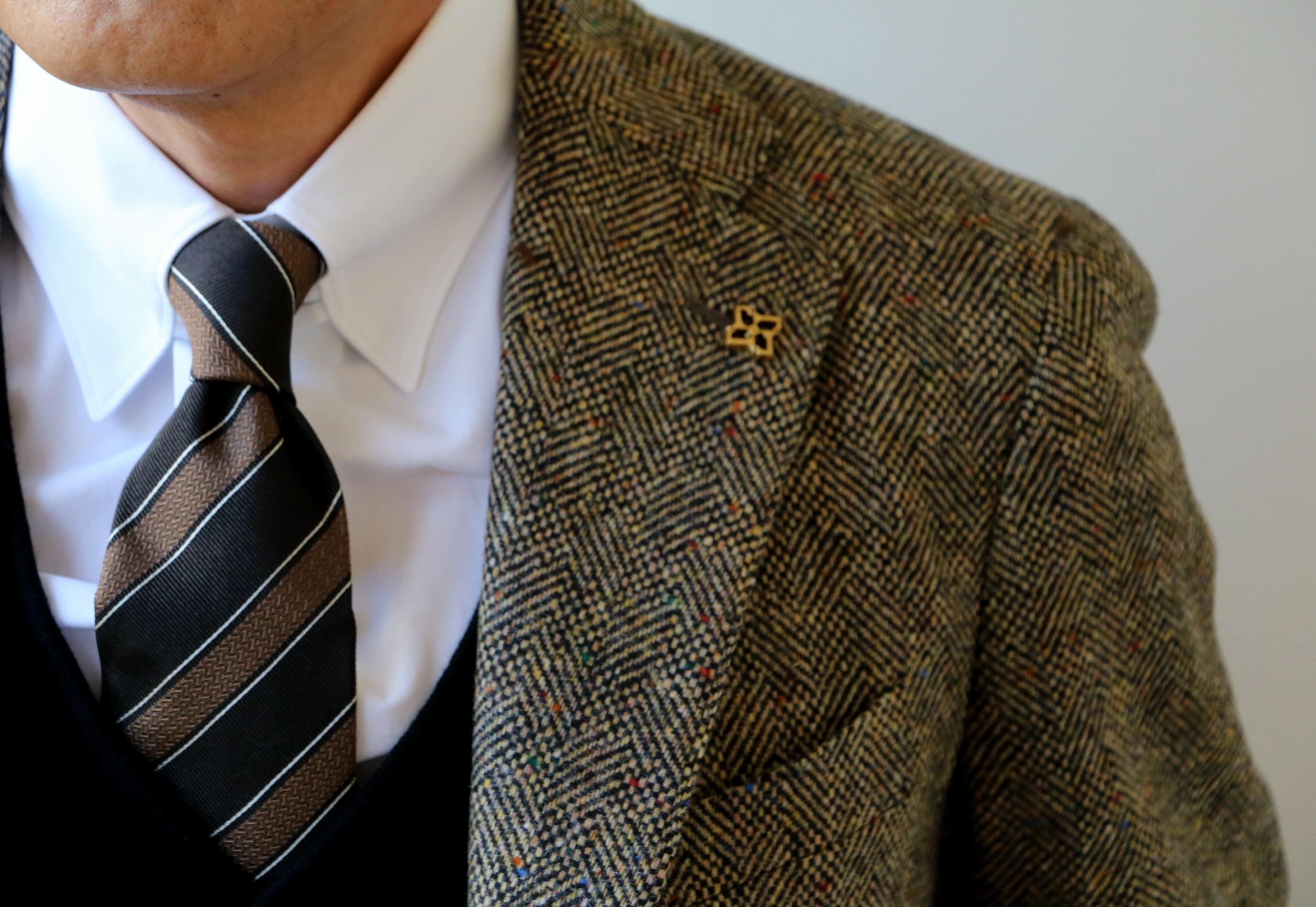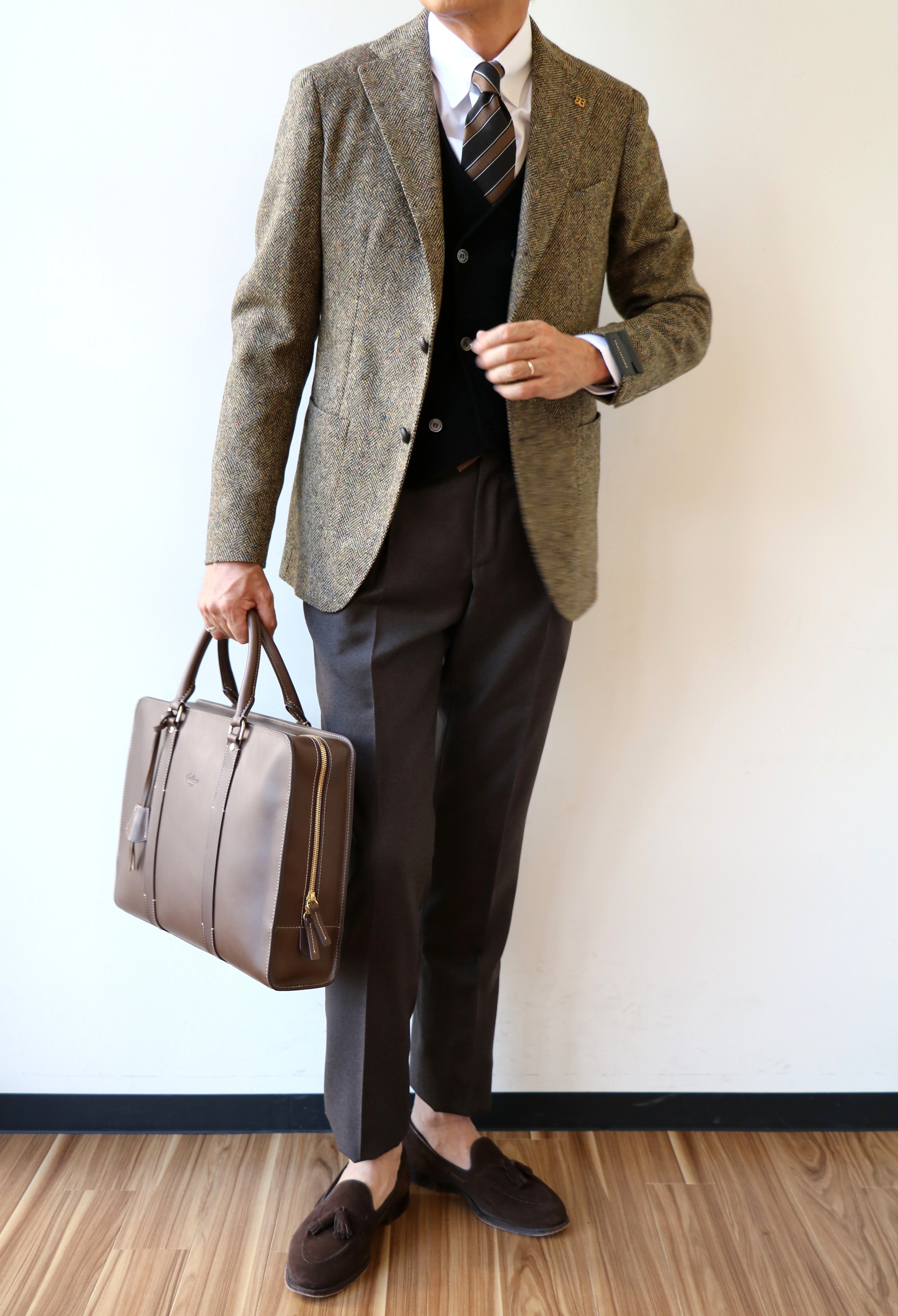 コーディネートで合わせたのは、Finamore(フィナモレ)のタブカラー。オックスフォードのブルーとも考えましたが、都会的に見せるためにブロードクロスのホワイトを選びました。ネクタイは、Holliday&Brown(ホリディ&ブラウン)。出世が英国だけに波長は合います。ニットベストは、Settefili Cashmere(セッフィーリ カシミア)の定番となっているダブルブレストのニットジレ。ブラックを差し込む事で、全体が引き締まり、モダンに見せます。近々のご案内です。ボトムは、INCOTEX(インコテックス)のサキソニートラウザース。チャコールグレイも合いますが、ここは円やかなブラウンを選んでおります。足元は、相変わらず代わり映えしませんが、私物のCROCETT&JONES(クロケット&ジョーンズ)です。休み明けに再入荷しますので、気になられる方は声をかけてください。