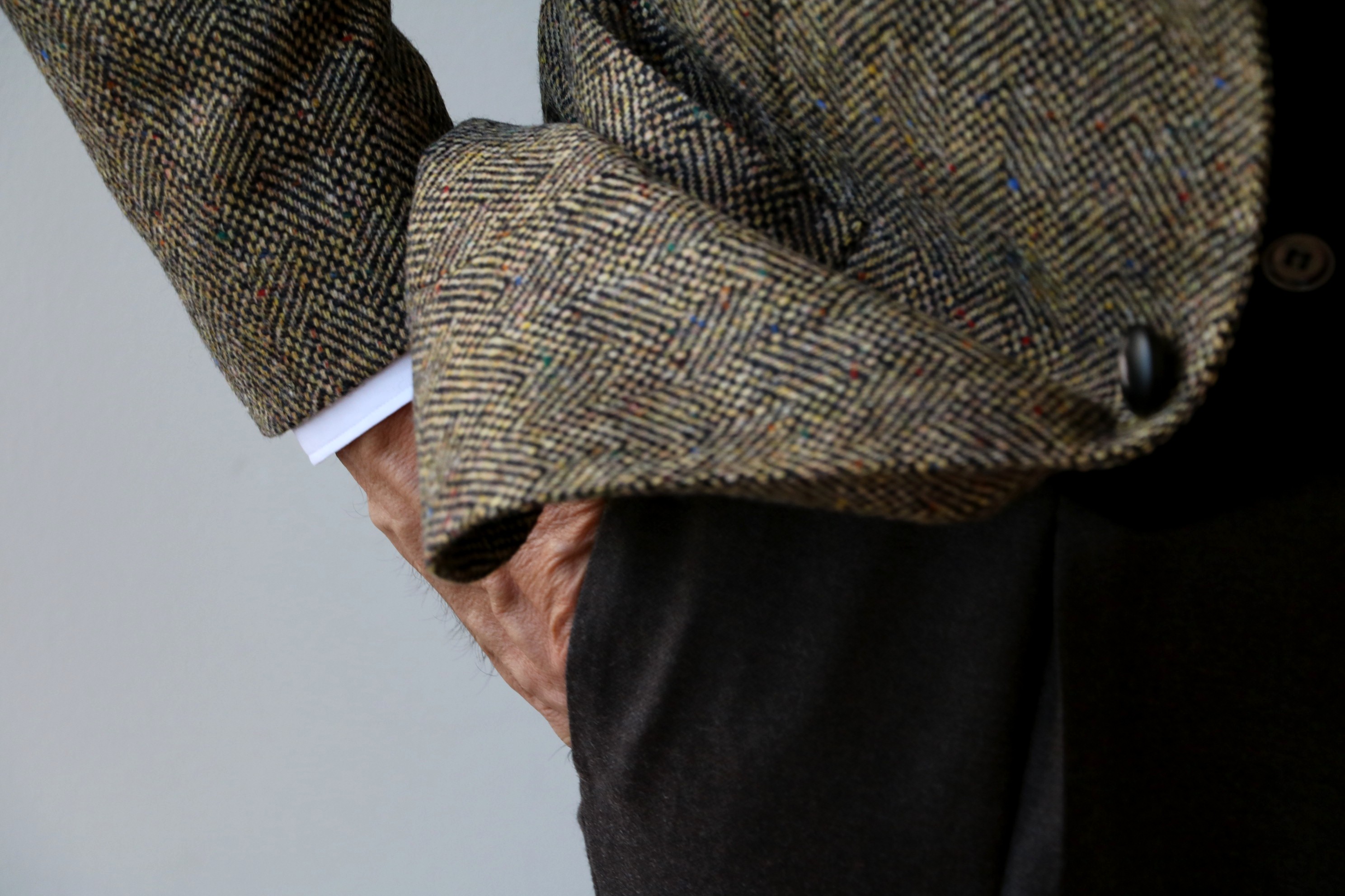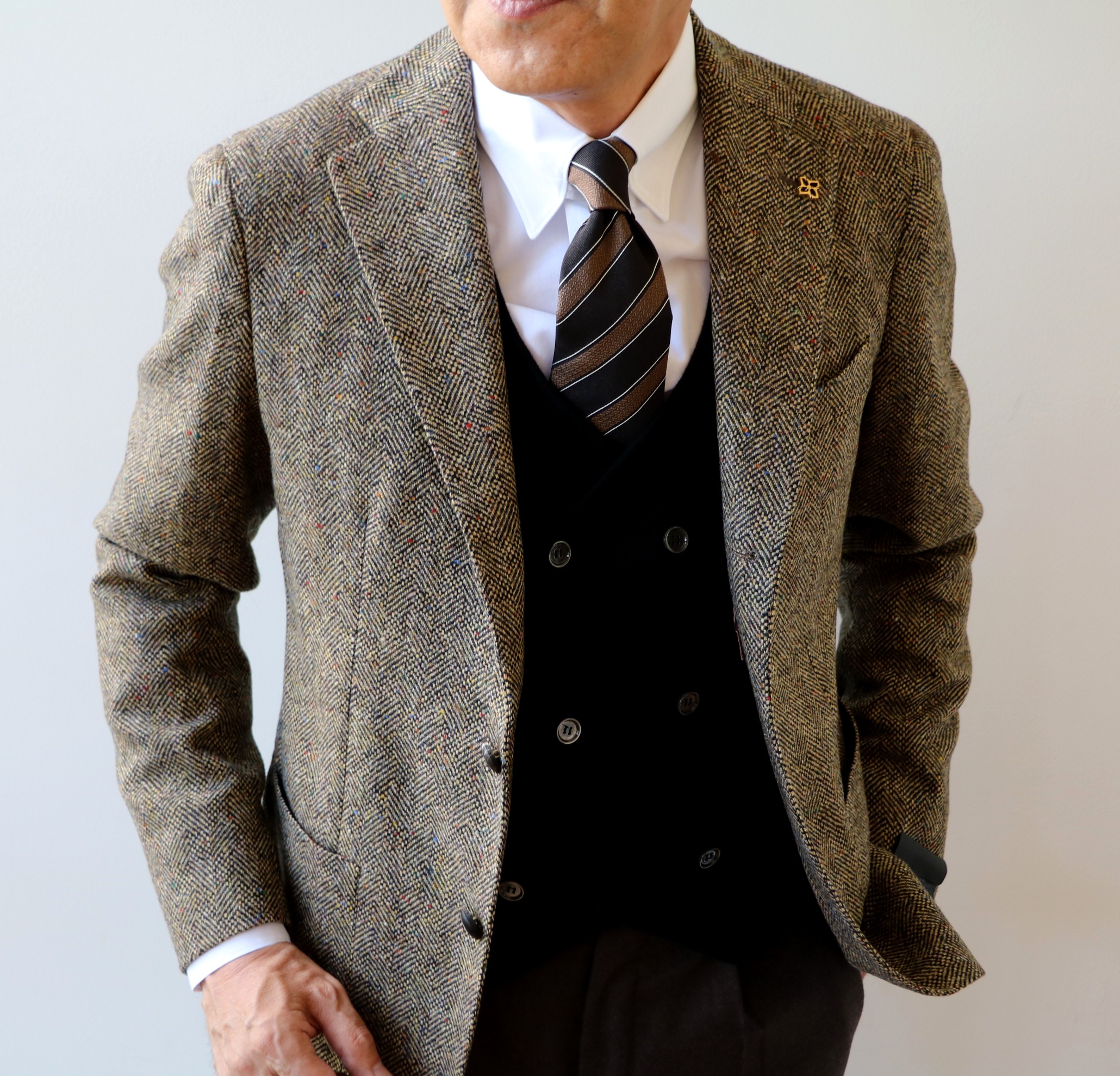 新たに加わったのは、カラーネップ入りのヘリンボーン柄ジャケット。昔なら、ハリスやドネガルなどの手触りの粗い野趣に富んだツィード地で選んでいましたが、今、求められるのは、雰囲気を楽しみながらも、着心地の良い軽さです。展示会で懐かしさのあまりバイニングしてしまいましたが、もし、このジャケットがツィードであったなら、通り過ぎていたでしょうね。