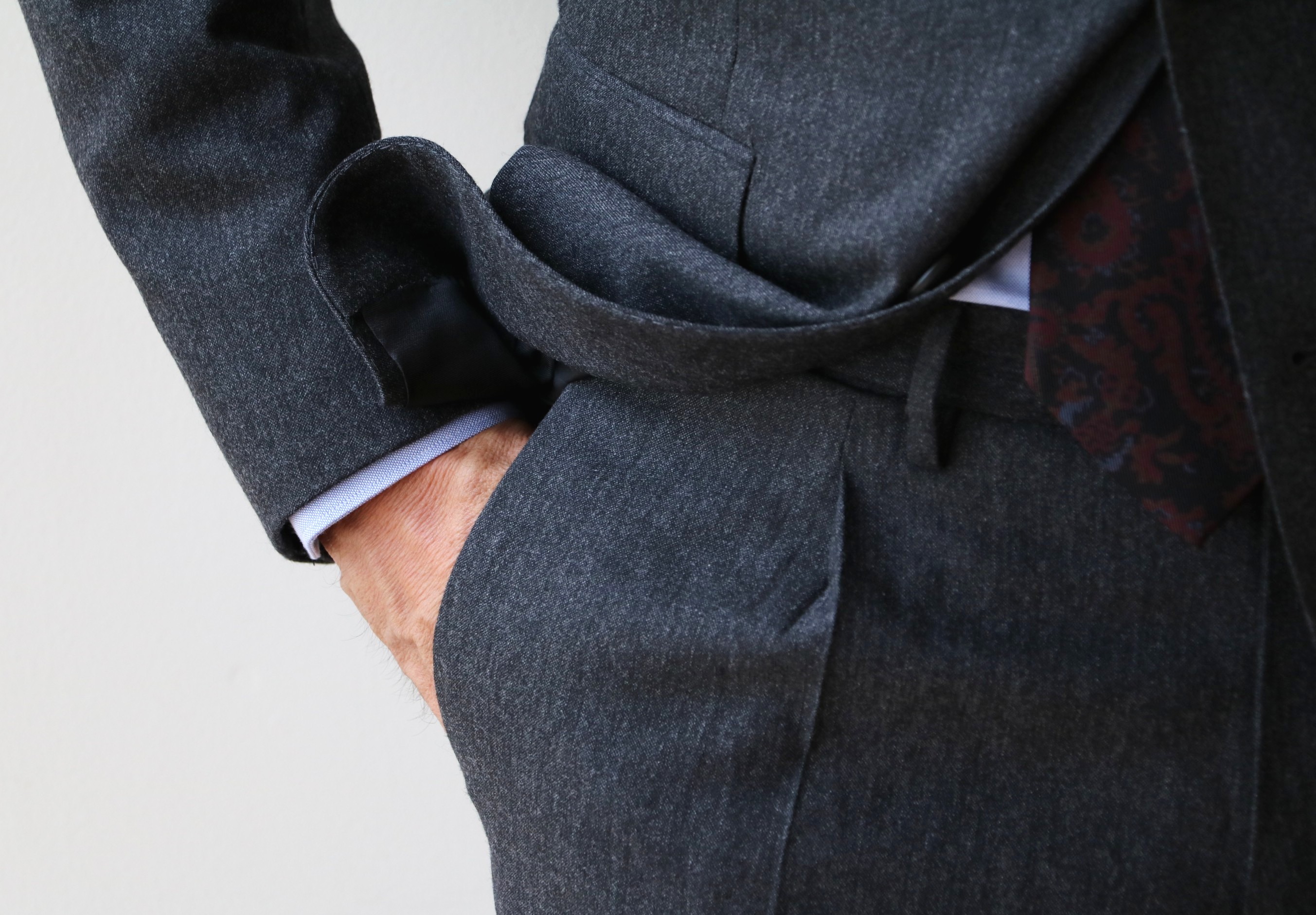 2018年秋冬にご案内する最初のスーツは、ピークドラペルのチェンジポケット付シングル。基本ベースは、今までと同じ「VESVIO」でセレクトしております。