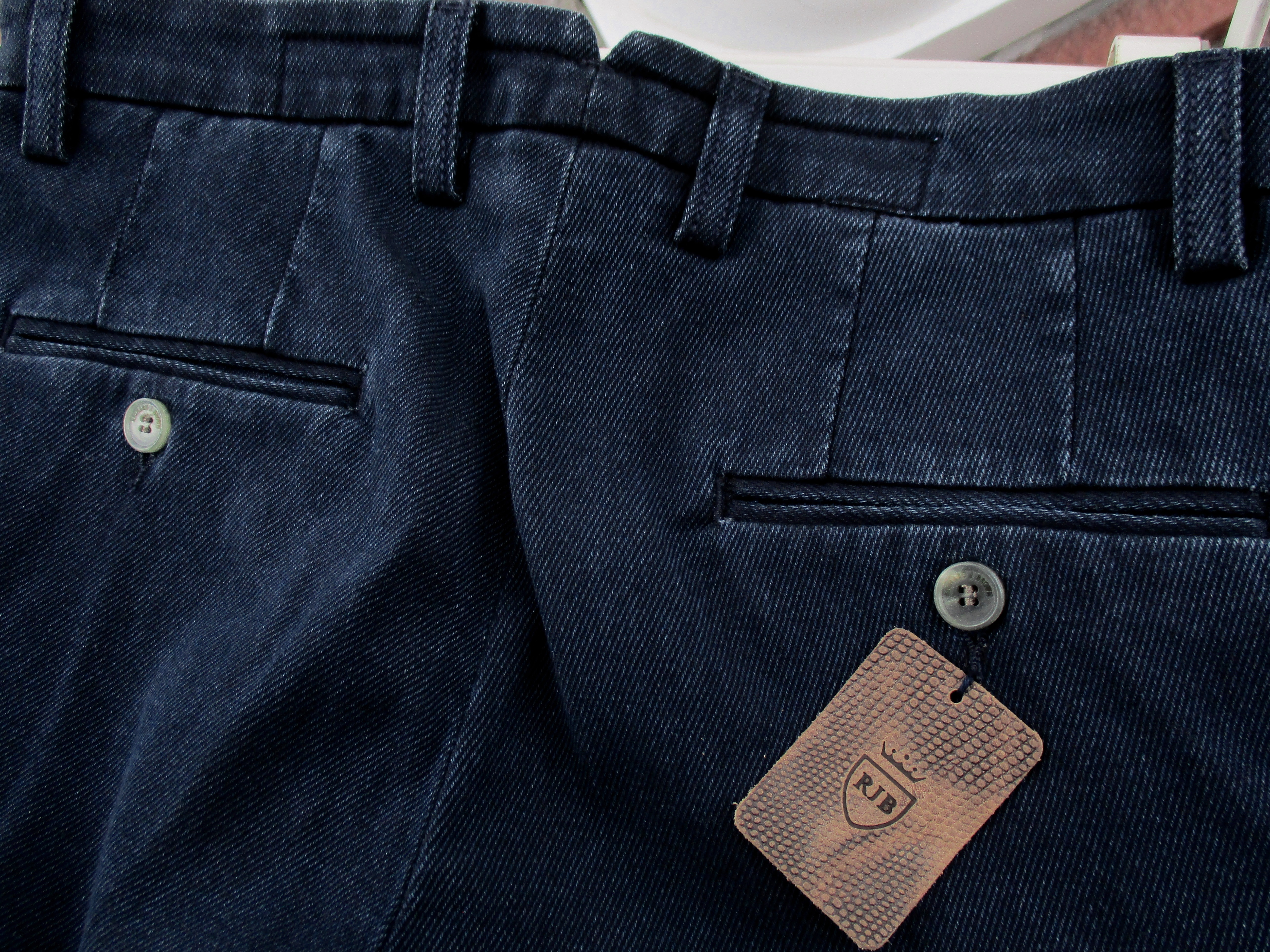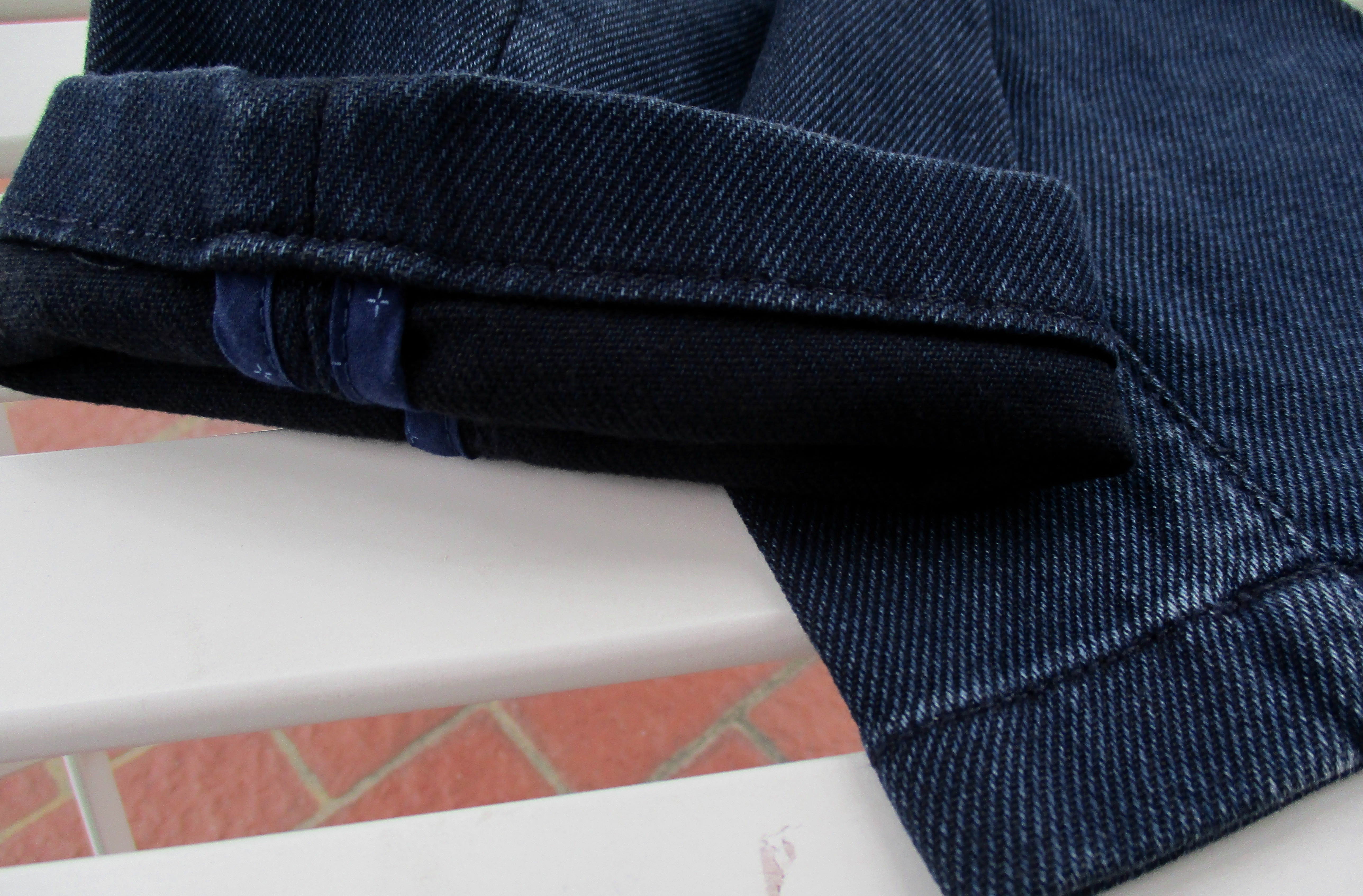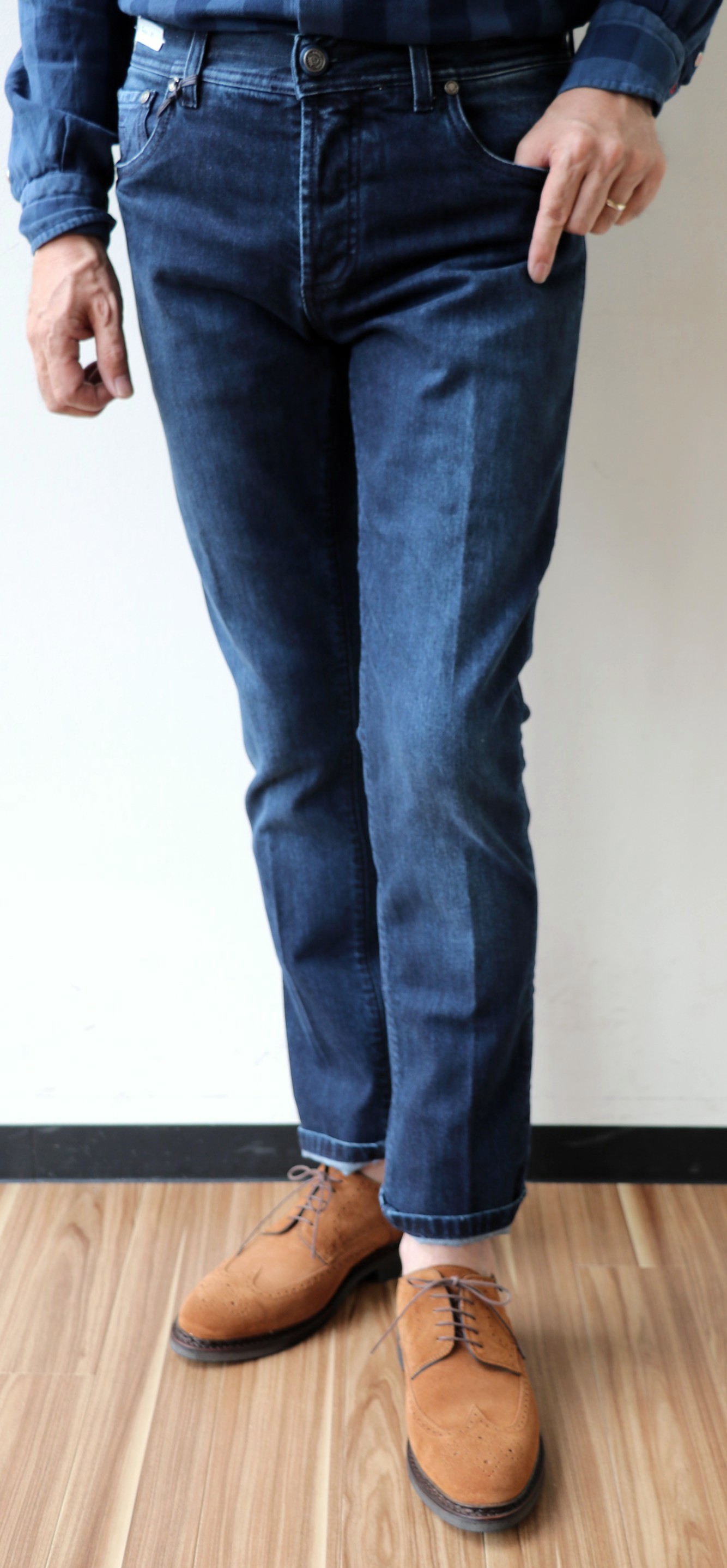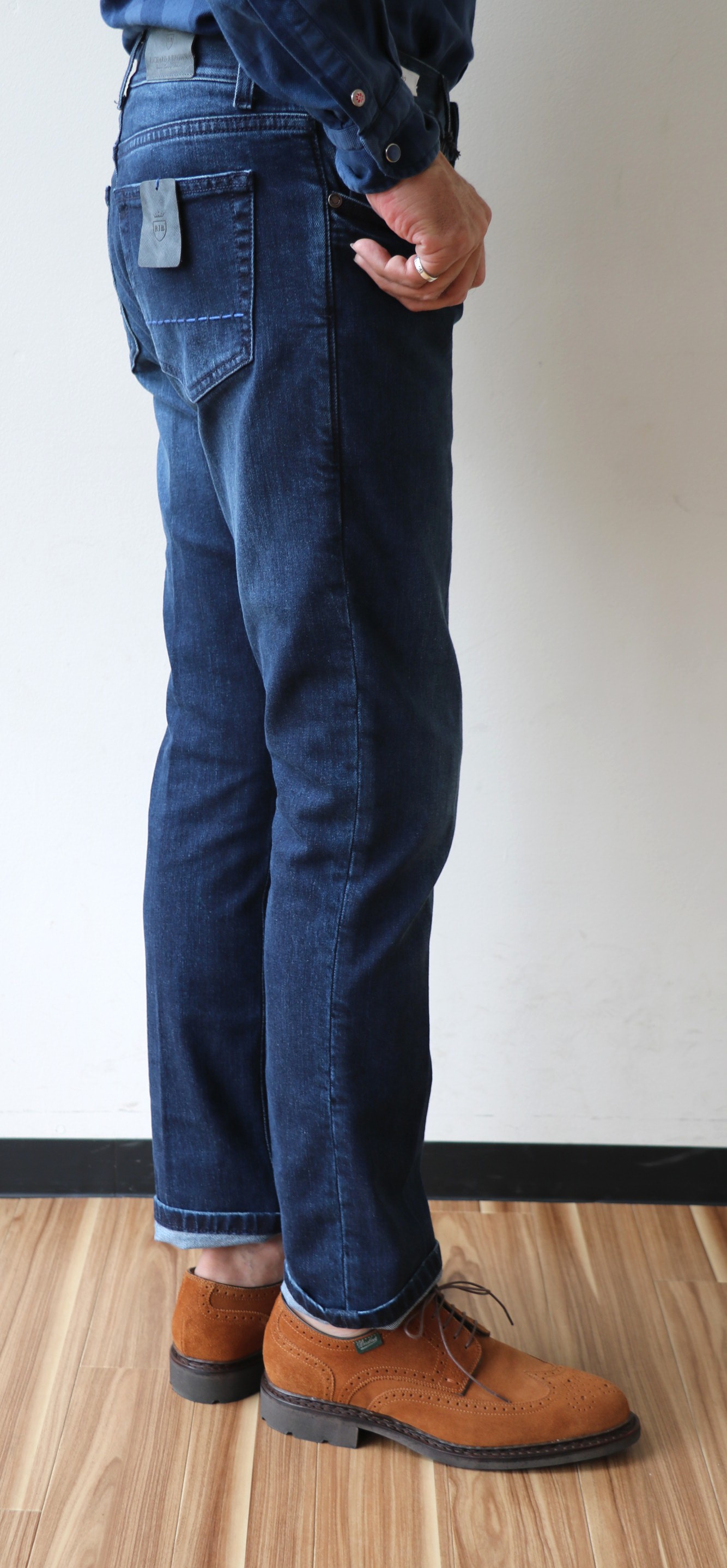 コインポケットの付いた、スラントポケットのデニスラ。表情は、とても綺麗です。そして何よりもインディゴのしっとりとした色合い。先にご案内のウォッシュドブルーのジーンズと同じく、青みを抑えた上品なインディゴブルーです。穿き心地は、ジャージのよう、いやジャージと言ってよいほどの伸縮性の高さ。美しく穿いて、ノンストレスなデニスラでした。