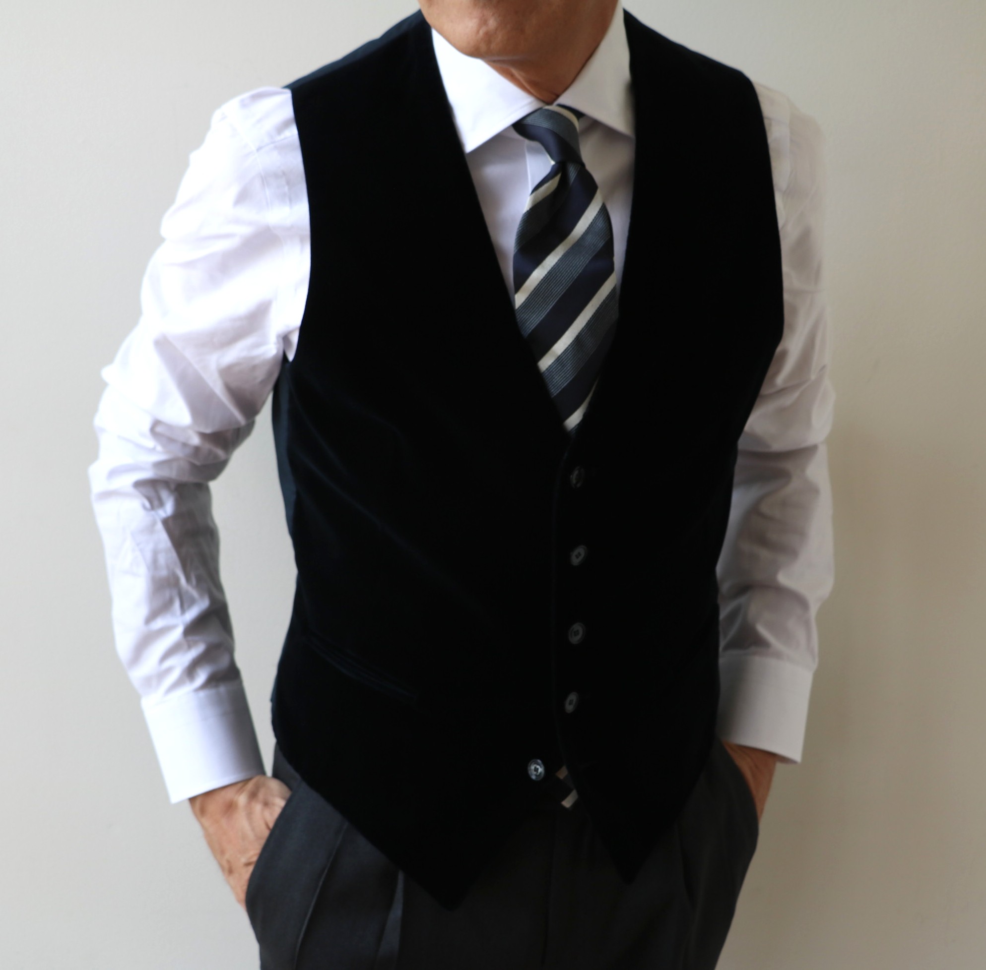 もう少し後でのご案内を考えていたのですが、折角です。ジャケットとパンツをより近づけ、Vゾーンを華やかに演出するジレをご紹介します。【TAGLIATORE/タリアトーレ】のものです。
