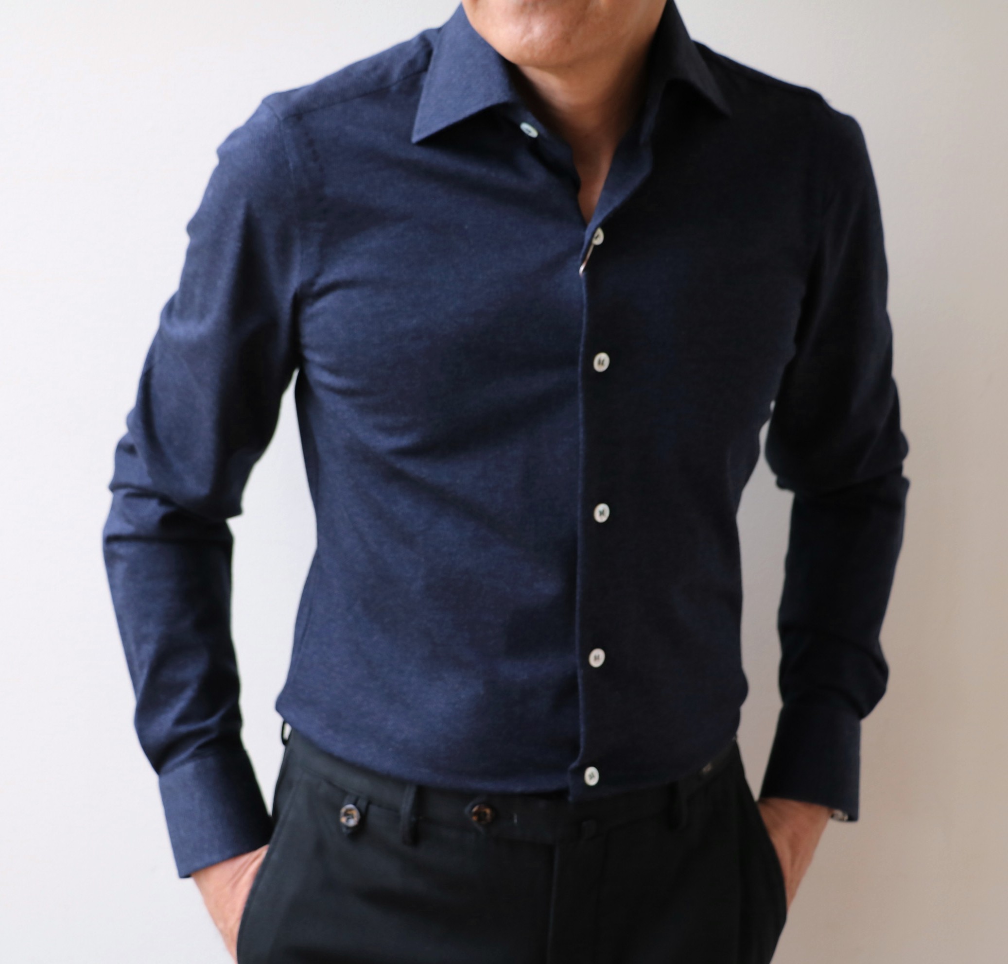ダークブルーは、ワイドカラーを選びました。鹿の子織に似た表情を出すコットン100%のジャージ素材。どっしりとした重みは、生地の打ち込みの強度を示します。洗濯後の着崩れも心配はいりません。きちんとしていて、楽ちん。快適さと上品さ。どちらも必要な時代です。