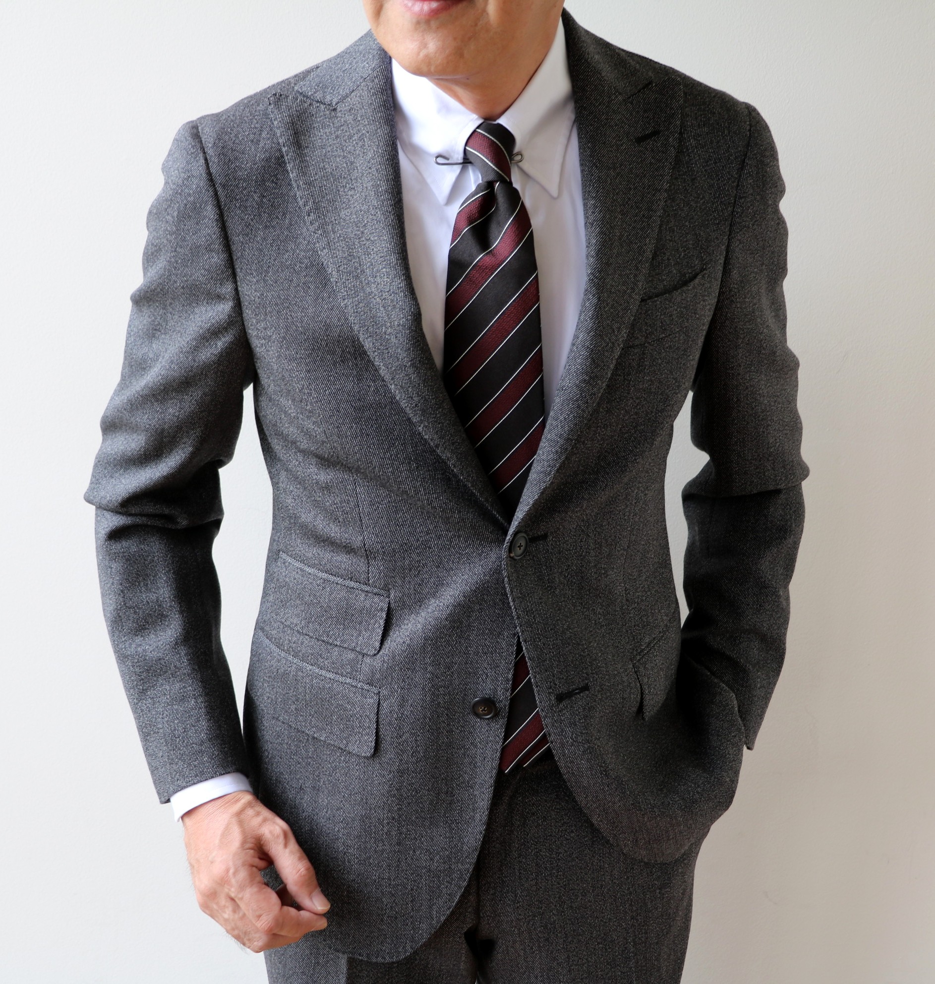 同じ写真です。最近は、連写で撮ることの多いカメラマンのジュニア。写真が多くて、選びきれず、3枚の写真を載せてしまいました。昨年より登場したピークドラペル、チェンジポケット付のシングル2つ釦モデルの「DEGAS」。完成度の高さから、他のブランドではなく、【THE GIGI/ザ・ジジ】で意識的にセレクトしています。
